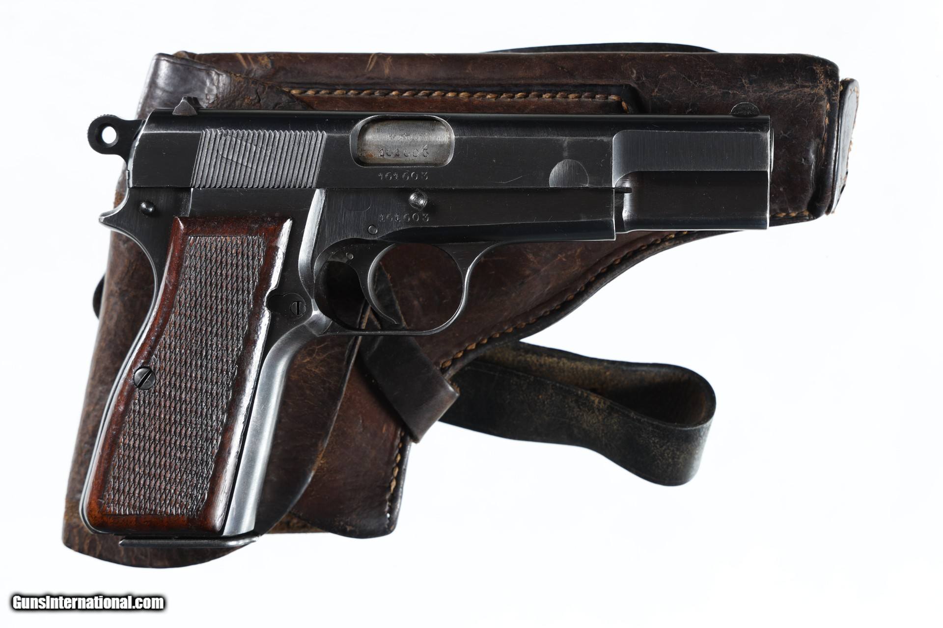 Description: Very good overall condition with area of finish loss on left side of slide. Crisp sharp markings with Nazi Waffenfabrick markings throughout. "Eagle/WaA140" proofed. Includes modified holster and shoulder strap. • Free Shipping, No Credit Card Fees. • Lay-a-way available for this firearm. • 1/3 Down, a 1/3 in 30 Days 1/3 in 60 Days. SOLD Curio/Relic: Yes Manufacturer: FN Model: HI Power Serial Number: 161603 Barrel Length: 4-3/4 |