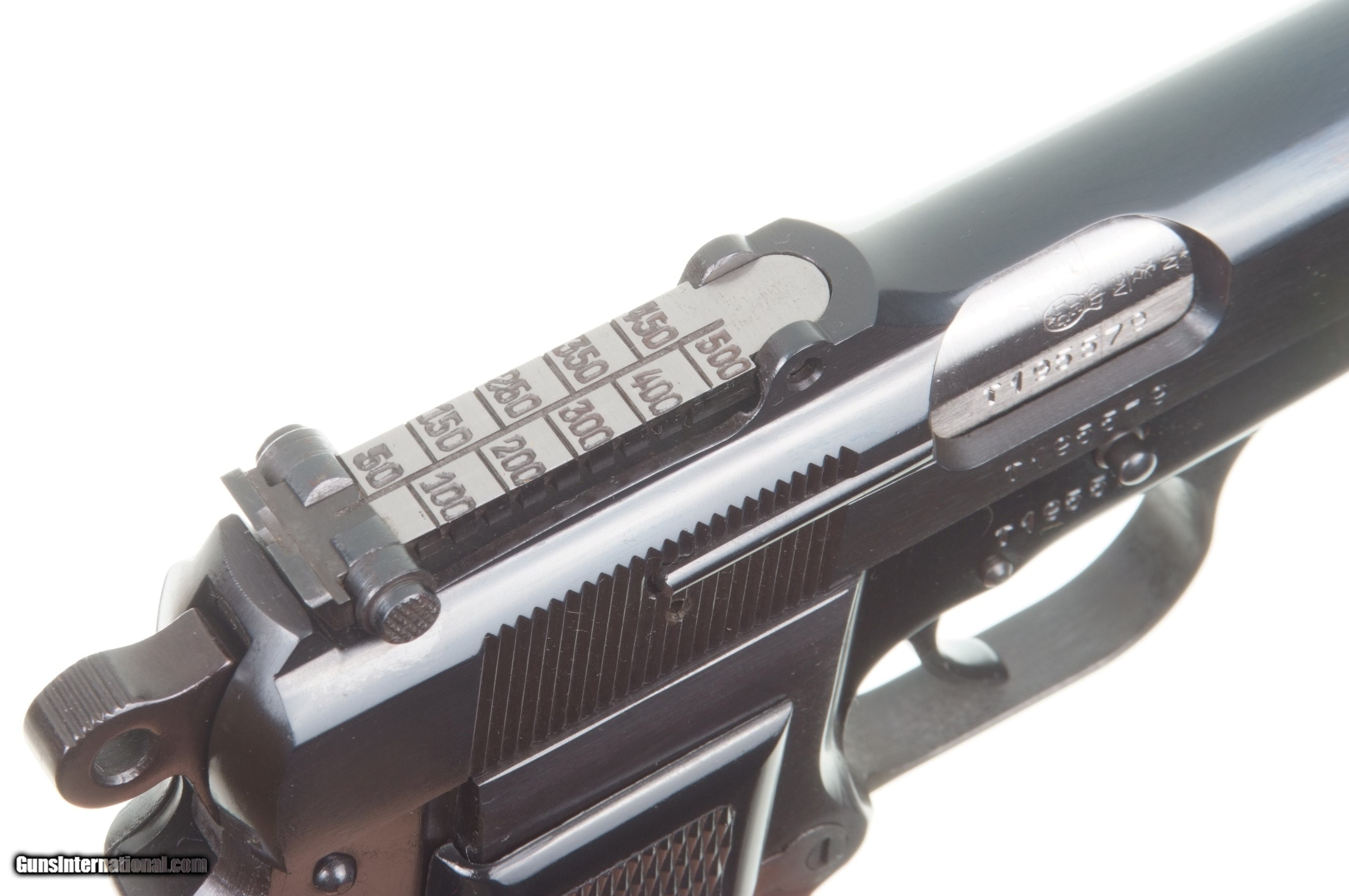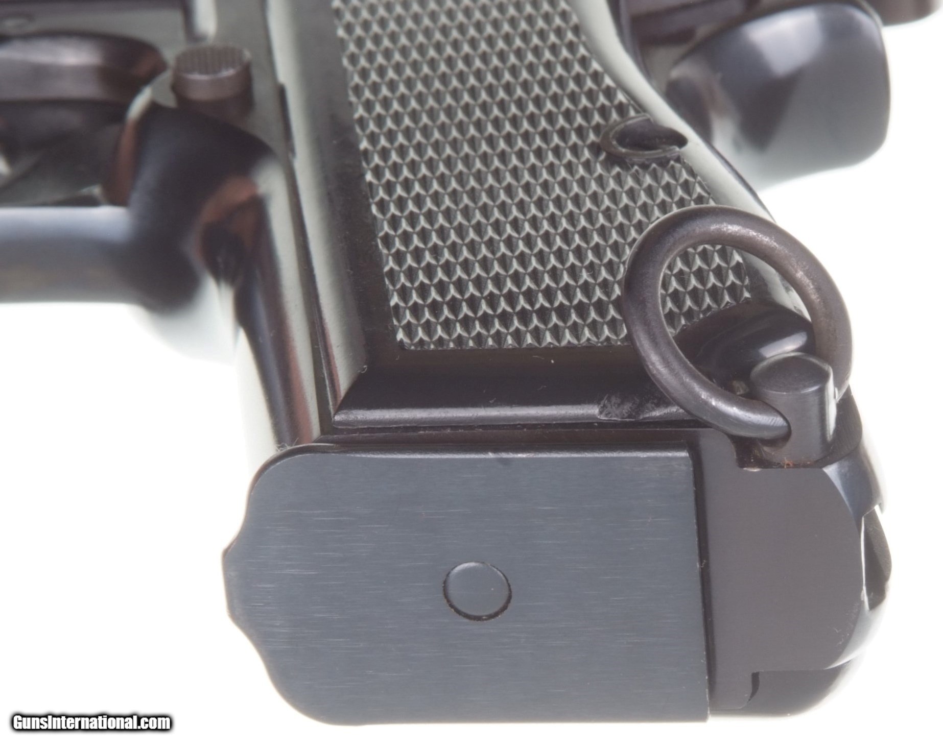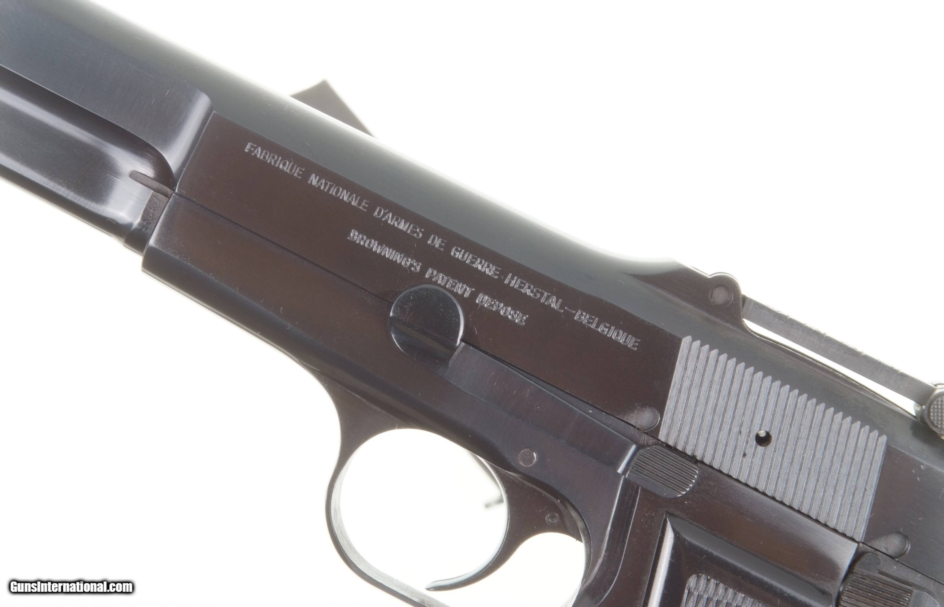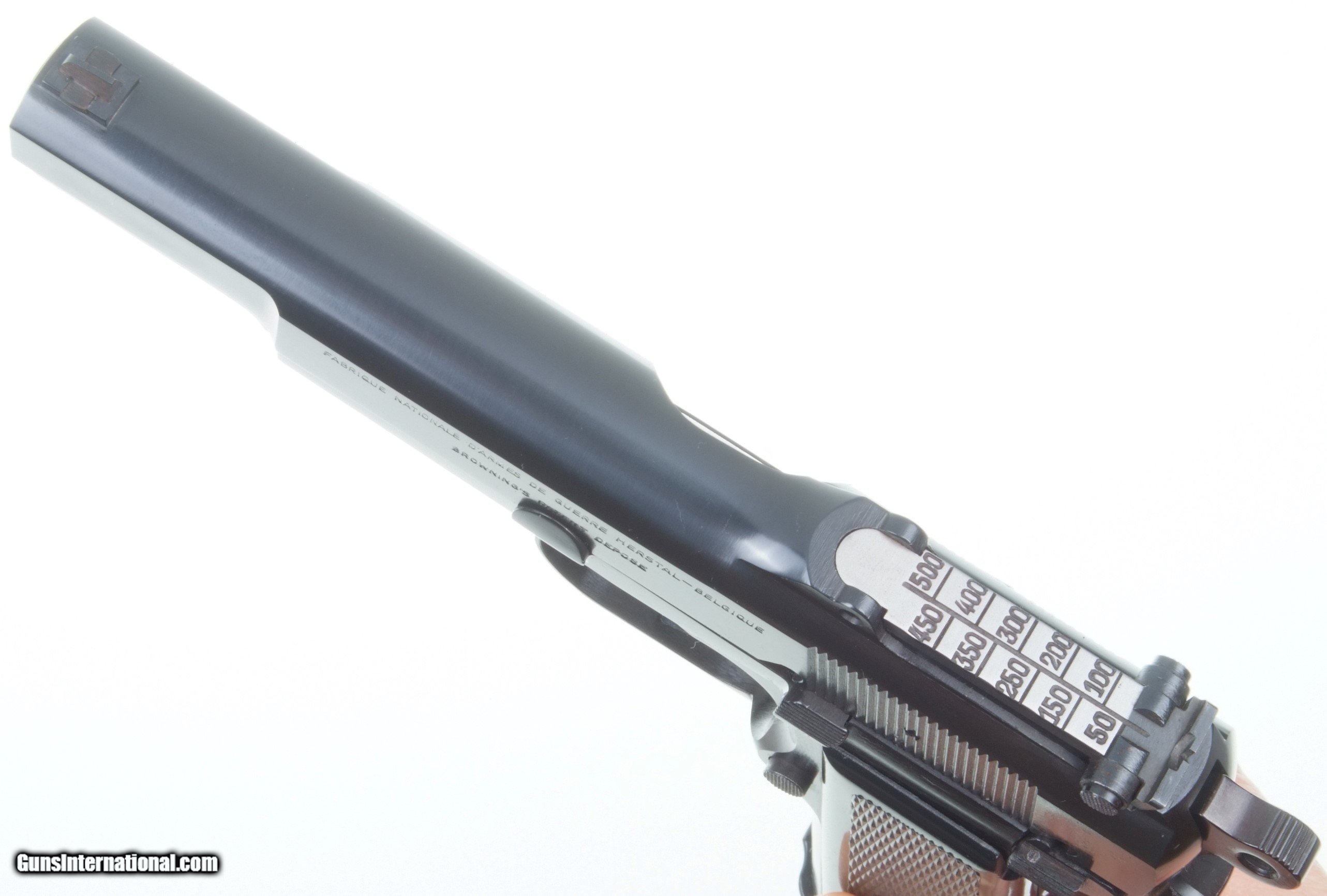Description: Standard configuration Hi Power with slip in tangent sight marked 50-500. Usual two line address on left side of slide. The second Muscat of Oman logo prominently marked on the right side of slide. Barrel has usual Belgium proofs on exposed hood with full serial number that is repeated in a stacked manner on the slide and frame. The back of the frame is factory slotted for a shoulder stock. Black plastic checkered panels, identical in form to the more frequently encountered wood panels, recessed for lanyard ring mounted on left rear frame. Synopsis: Fabulous, near new Muscat of Oman Hi Power. Condition: Pistol has 99++% original salt blue. No sharp edge wear or thinning on front or backstrap. A very tiny spot of oxidation on the magazine release button retainer. No wear in slot. Mirror bore. Perfect manual mechanics. An absolutely great Muscat of Oman Hi Power that is seldom offered for sale! A HISTORIC INVESTMENT! ~~Insured shipping fee of $155; most packages shipped using FedEx 2nd Day.~~ SOLD Manufacturer: FN Serial Number: T195579 Caliber Info: 9 mmP |