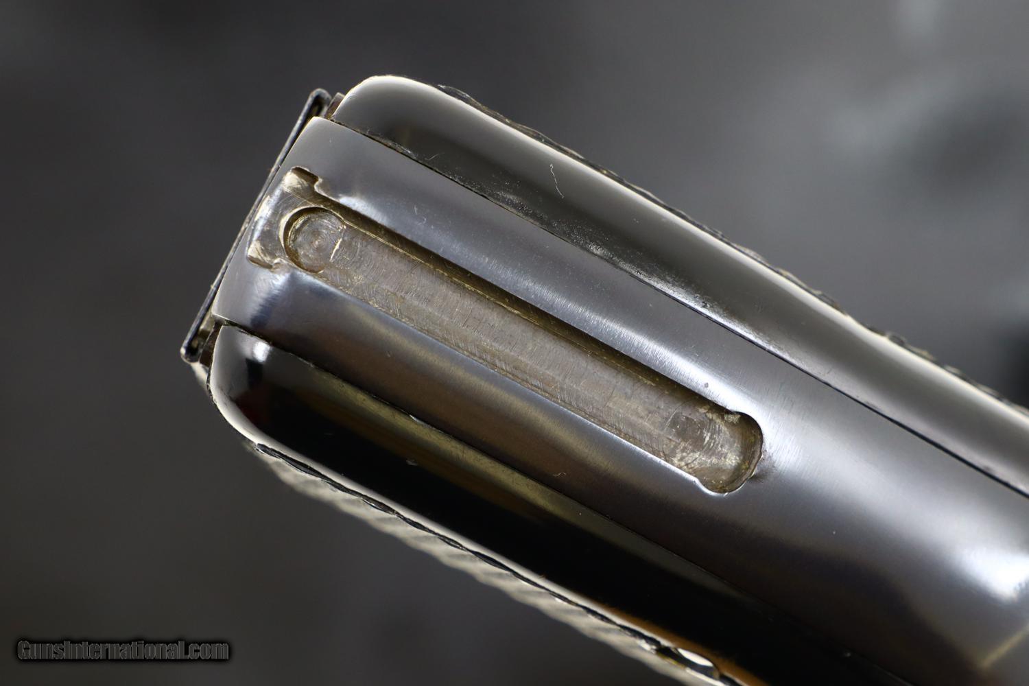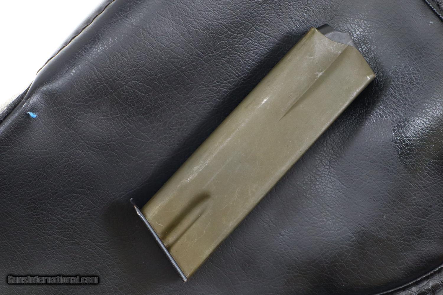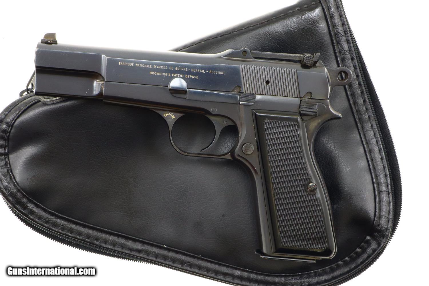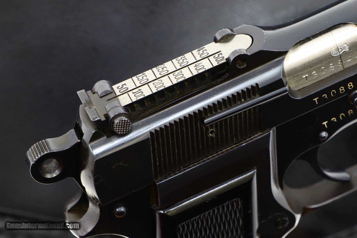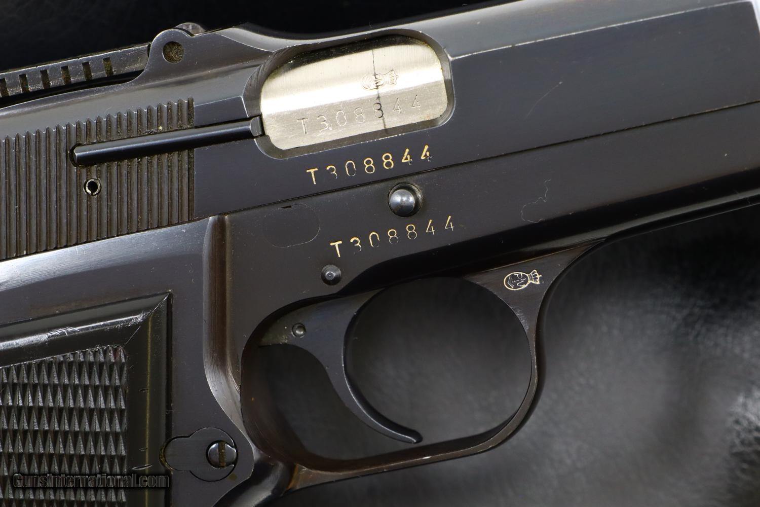 Description: Extremely high condition FN Hi Power, tangent sight and slotted for shoulder stock, made in late 1960s and imported by Silesia in Germany. Standard configuration pistol with serrated post front sight and tangent rear sight graduated 50-500. Left side of slide with two line FN address. Silesia marking, under blue, on left upper trigger guard web. Right side of pistol with stacked serial numbers over barrel, slide and frame. Back strap cut for shoulder stock. Checkered black plastic panels with smooth border. Correct magazine with phosphated body and blued button-secured floorplate. Black browning pouch with plastic zipper. Synopsis: FN, Hi Power, Tangent, Slotted, Silesia Marked, Black Grips, T308844, A-1803 Condition: 99+% Bright original blue with just the most minute sharp edge wear on the left side of the muzzle and some fine scratches on the right side of the slide behind the serrations. No thinning of either the front or back strap. Comparable condition grips, each with a few truly minute handling marks, magazine with minimal insertion wear. Mirror bright bore. Perfect manual mechanics. Excellent pouch. A wonderful tangent sight/slotted FN Hi Power pistol from the late 1960s ~~Insured shipping fee of $65; most packages shipped using FedEx 2nd Day.~~ SOLD Manufacturer: FN Serial Number: T308844 Caliber Info: 9mmP |