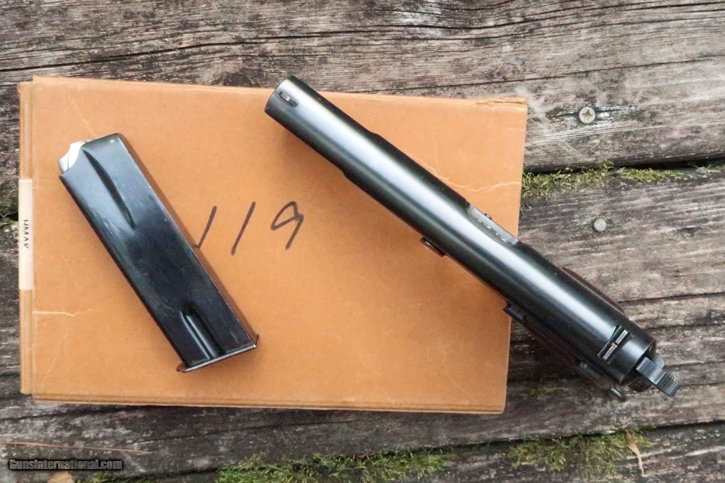 Description: Standard configuration Danish contract HP pistol, one of 1700 pistols shipped to Denmark in 1946, one of the lowest known serial numbers in the original decommissioned shipping box. Fixed sights with usual serrated front sight as unique to the Danish contract guns. Early post-war features include internal extractor, thumbprint slide, and rust blued finish. Slide with usual FN markings on the left side and scattered Belgian proofs. Danish markings on left side of frame. Matching serial number on barrel hood, slide and frame. Checkered walnut panels, the left recessed for a lanyard ring. Magazine with aluminum follower and button fixated floorplate. Complete with heavy cardboard shipping box numbered "119" on top, repeated on end label, citing this example as a "GR II" pistol. Deaccession date of 11/71. Note that this pistol has a high capacity magazine and cannot be shipped to states with prohibitive legislation that includes but is not restricted to: CA, CO, CT, HI, MA, MD, NY, NJ, cities of Chicago/Oak Park, IL, etc. Synopsis: FN High Power, Danish Contract, M1946, Original Shipping Box, 119, I-705 Condition: Near excellent original condition with sharp edge wear, and scuffs as carefully pictured. Same condition grips and magazine. Near mirror bore with sharp rifiling. Perfect manual mechanics. Near excellent shipping box with scattered scuffs as one might expect after numerous transports over 50 years. This is only the second shipping box we are aware of, extremely scarce by any metric! ~~Insured shipping fee of $75; most packages shipped using FedEx 2nd Day.~~ SOLD Manufacturer: FN Serial Number: 119 Caliber Info: 9mm |