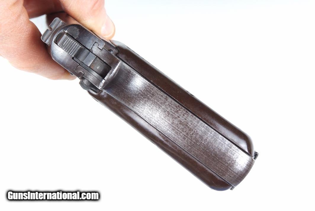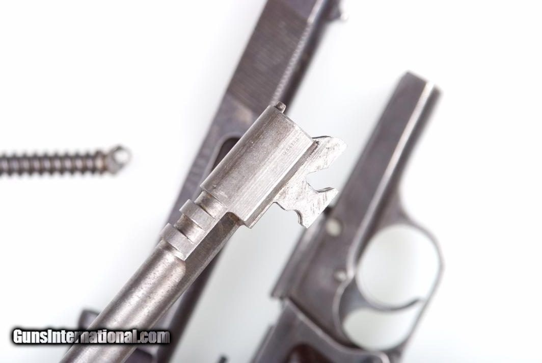 Description: FN, High Power, Last Ditch Nazi WWII fixed sight, made at the very end of production before the Nazis evacuated the FN plant. Matching serial numbers and extremely rough milled finish. No time for full inspections; the only WaA140 Waffenamt is on the barrel. Usual address on left side of slide and stacked matching numbers on the right side of pistol. Disassembly shows the WaA 140 acceptance on the left side of the chamber. Brown phenolic grips, correct magazine without markings, split tail base. Synopsis: FN, High Power, Military, Nazi Fixed Sight, 62593b, A-1564 Condition: VG+ original salt blue finish with sharp edge, grip strap thinning and holster wear as one might expect for a pistol that has seen moderate use. Comparable condition grips and magazine. Bright bore with sharp rifling. Perfect manual mechanics. An rare and desirable Nazi High Power, one of the very last to be made under Nazi supervision, so close to the allied invasion that there was no time to mark all components with the usual WaA acceptances. A great last ditch High Power. ~~Insured shipping fee of $65; most packages shipped using FedEx 2nd Day.~~ SOLD Curio/Relic: Yes Manufacturer: FN Serial Number: 62593b Caliber Info: 9mmP |