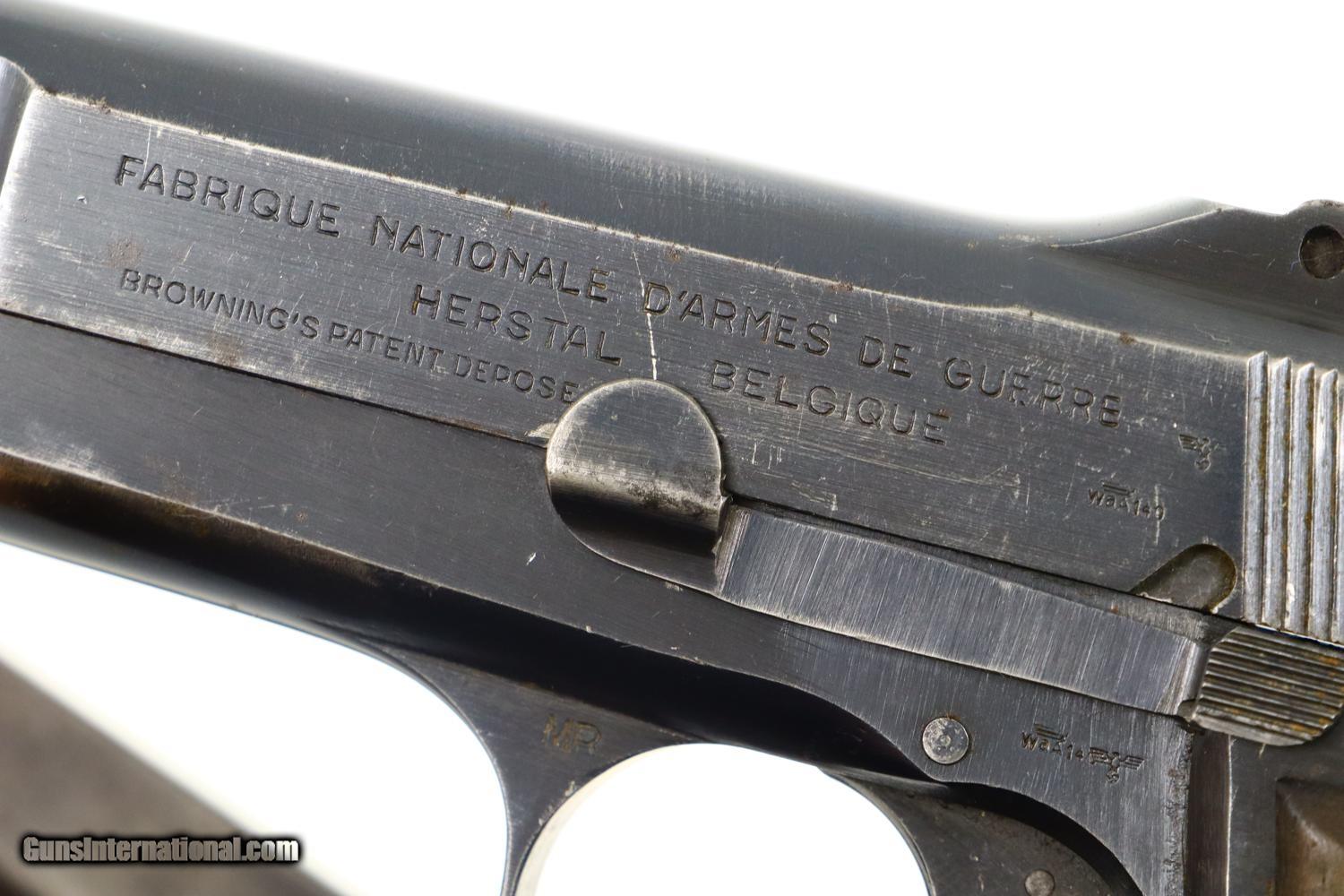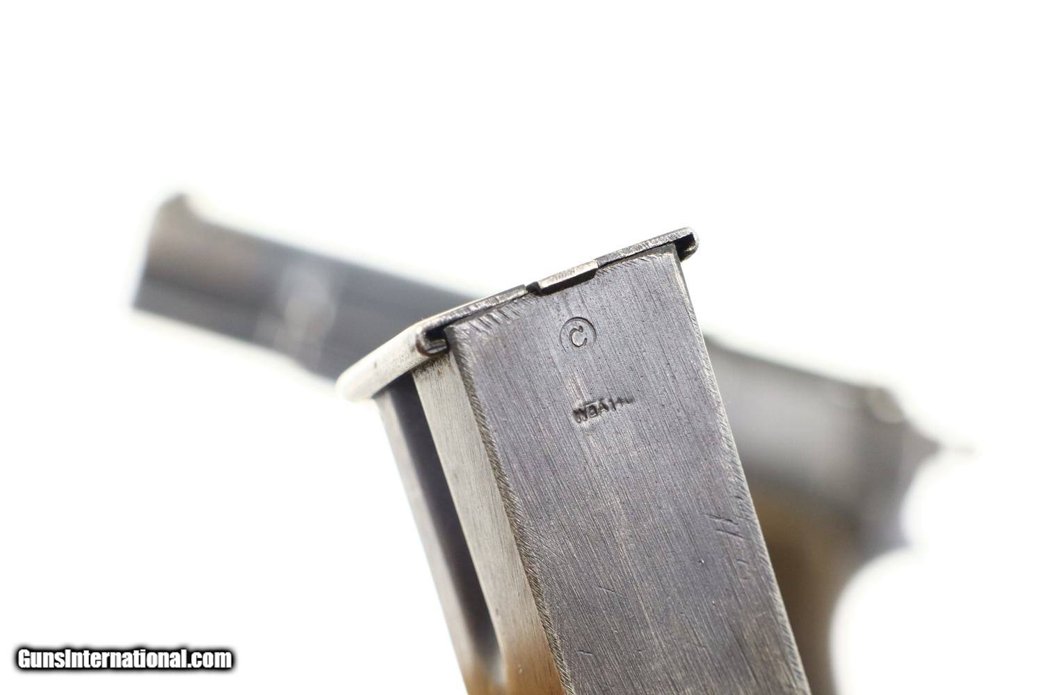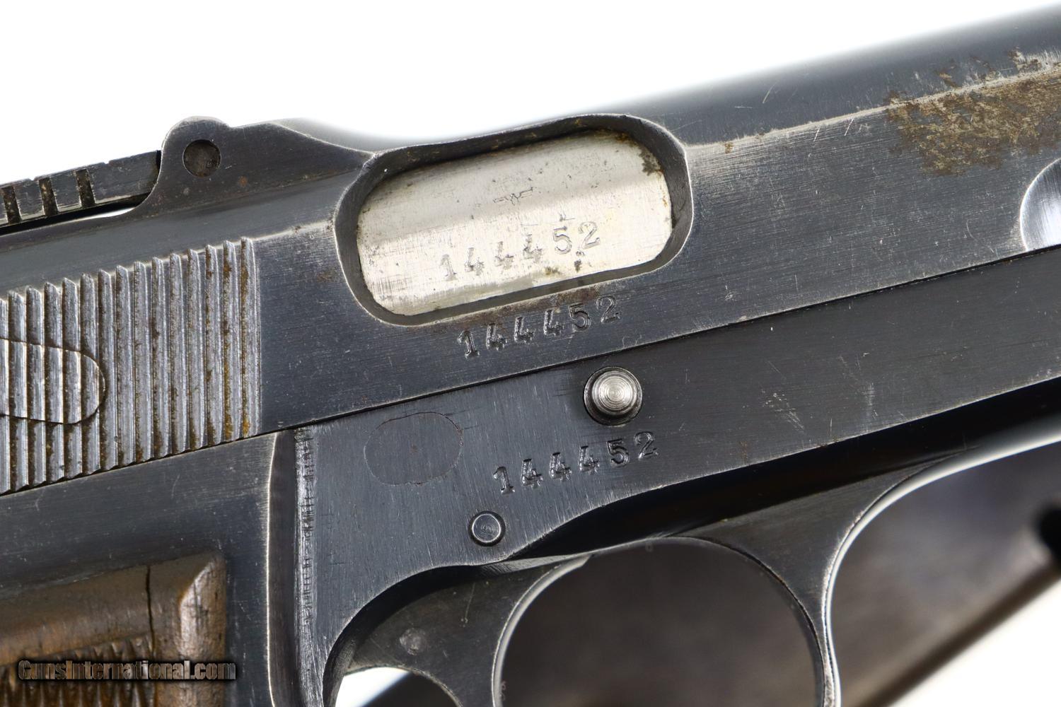 Description: Synopsis: FN, High Power, Tangent Rear Sight, German Military, 144452, FB00815 Description: Standard Nazi High Power Pistol with tangent rear sight, WaA140 code, with correct WaA140 marked magazine. Usual address on left side of slide and stacked matching numbers on the right side of pistol. E/WaA140 acceptances in usual locations. Checkered wood grips. Correct magazine with blued body and split tail floorplate, marked with the Wa140 acceptance. Condition: G with patchy areas of etched oxidation, particularly on the left forward slide and right slide above the thumb print. The balance with moderate holster wear. Dark oil soaked grips with light scattered handling marks. Comparable condition magazine. Dull bore with easily discernable rifling. Correct manual mechanics. ~~Insured shipping fee of $55; most packages shipped using FedEx 2nd Day.~~ SOLD Manufacturer: FN Serial Number: 144452 Caliber Info: 9 |