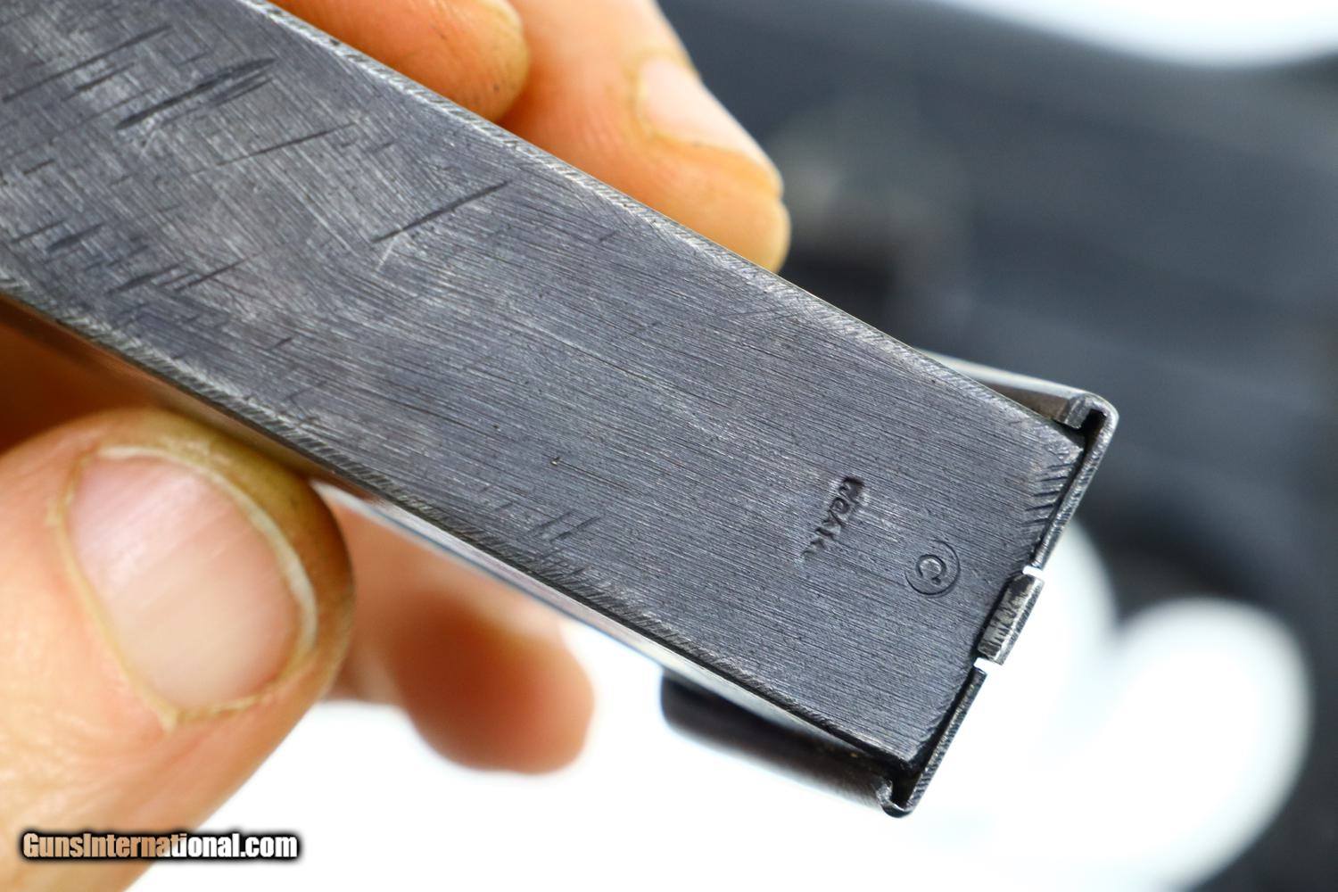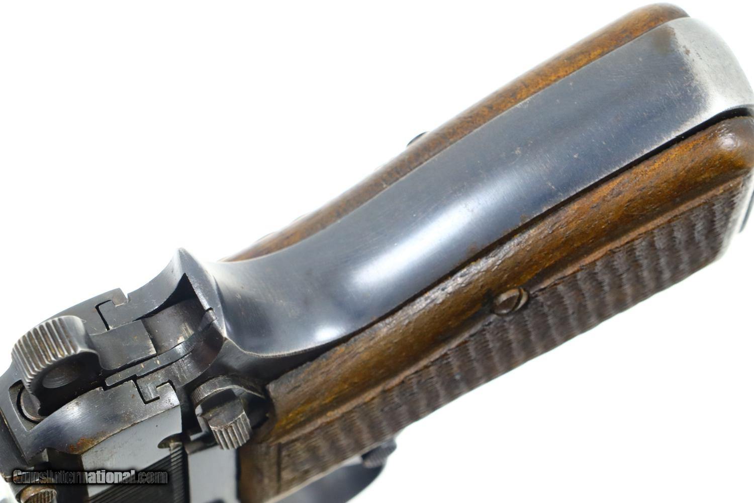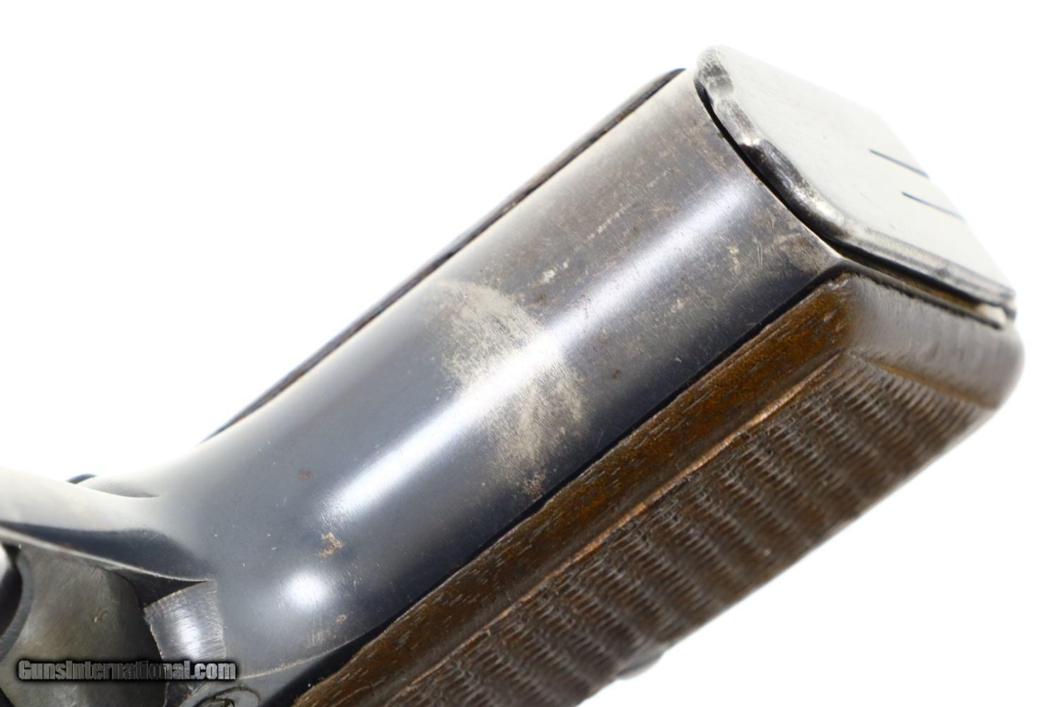 Description: Synopsis: FN, High Power, Tangent Rear Sight, German Military, 144452, FB00815 Description: Standard Nazi High Power Pistol with tangent rear sight, WaA140 code, with correct WaA140 marked magazine. Usual address on left side of slide and stacked matching numbers on the right side of pistol. E/WaA140 acceptances in usual locations. Checkered wood grips. Correct magazine with blued body and split tail floorplate, marked with the Wa140 acceptance. Condition: G with patchy areas of etched oxidation, particularly on the left forward slide and right slide above the thumb print. The balance with moderate holster wear. Dark oil soaked grips with light scattered handling marks. Comparable condition magazine. Dull bore with easily discernable rifling. Correct manual mechanics. ~~Insured shipping fee of $55; most packages shipped using FedEx 2nd Day.~~ SOLD Manufacturer: FN Serial Number: 144452 Caliber Info: 9 |