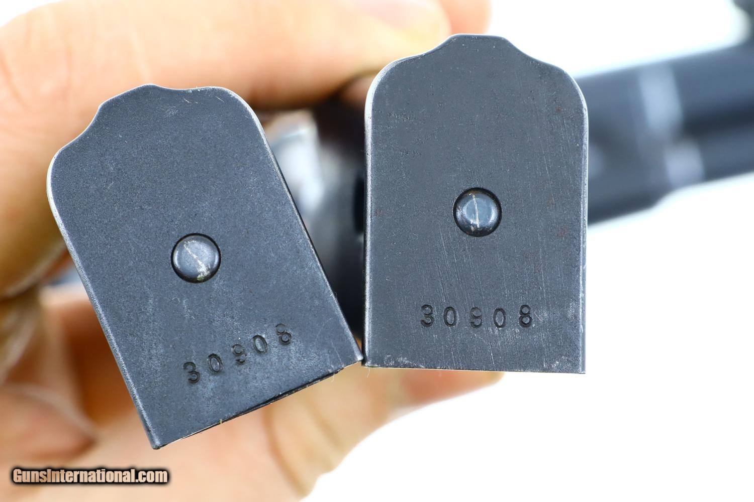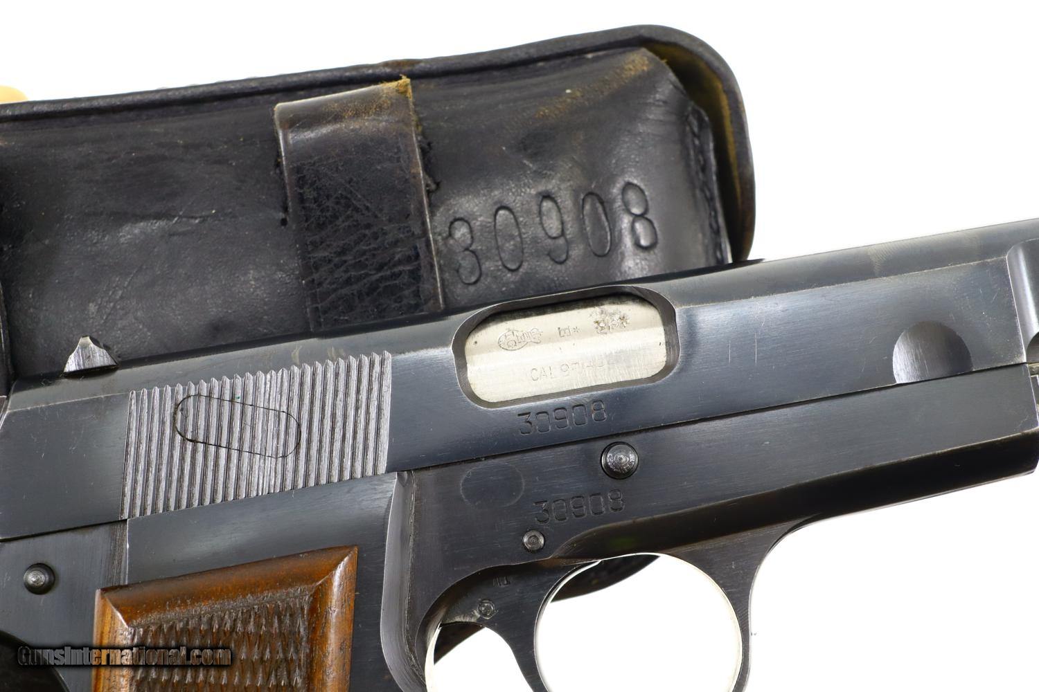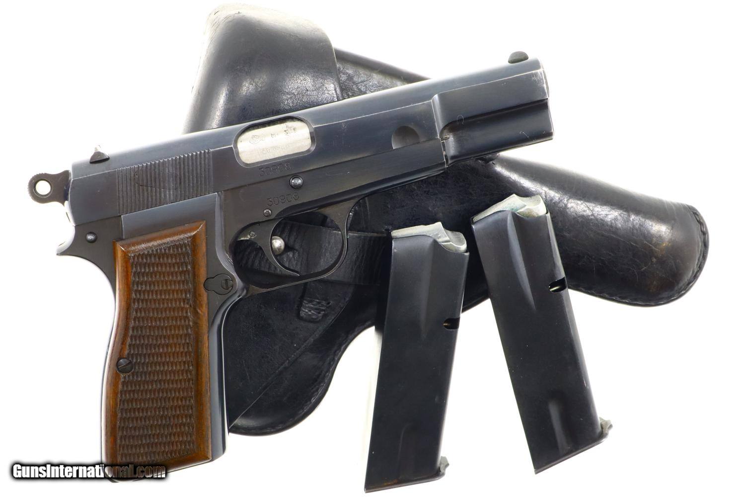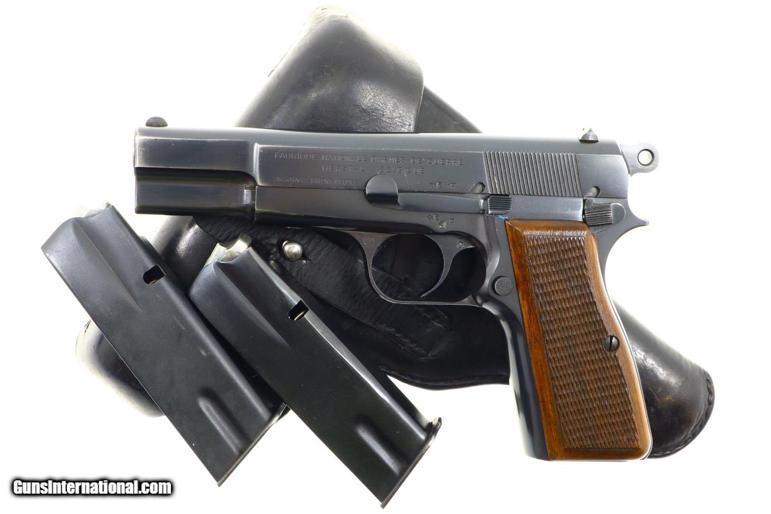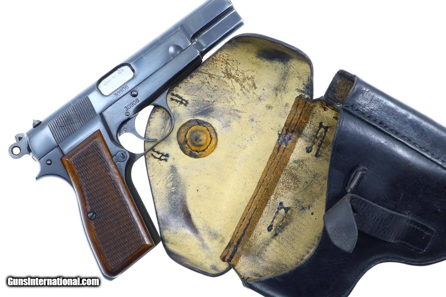 Description: Wonderful FN Hi Power Rig as used by the West German police, circa 1950s, this example with two matching magazines and matching numbered holster. Standard configuration pistol with fixed sights. Usual FN address and patent reference on left side of thumb print slide, made with internal extractor. Geco (importer) marking on left side of trigger guard web. Exposed barrel hood marked with caliber. Full serial number on left side of chamber (hidden) and stacked on the right side of slide and frame. European walnut checkered grips with smooth border. Correct blued magazines with aluminum follower and button secured floorplate, each marked with the full serial number of pistol. Correct black holster, two belt loops on back with full serial number. Synopsis: FN, High Power, West German Police, Matching Rig, 30908, I-1091 Condition: Excellent original blue with sharp edge wear consistent with light field use. Same consideration applies to magazines. Mirror bright bore. Perfect manual mechanics. Holster with scuffs as photographed. An excellent and complete High Power rig as issued to the West German police after WWII. ~~Insured shipping fee of $75; most packages shipped using FedEx 2nd Day.~~ SOLD Curio/Relic: Yes Manufacturer: FN Serial Number: 30908 Caliber Info: 9mmP |
