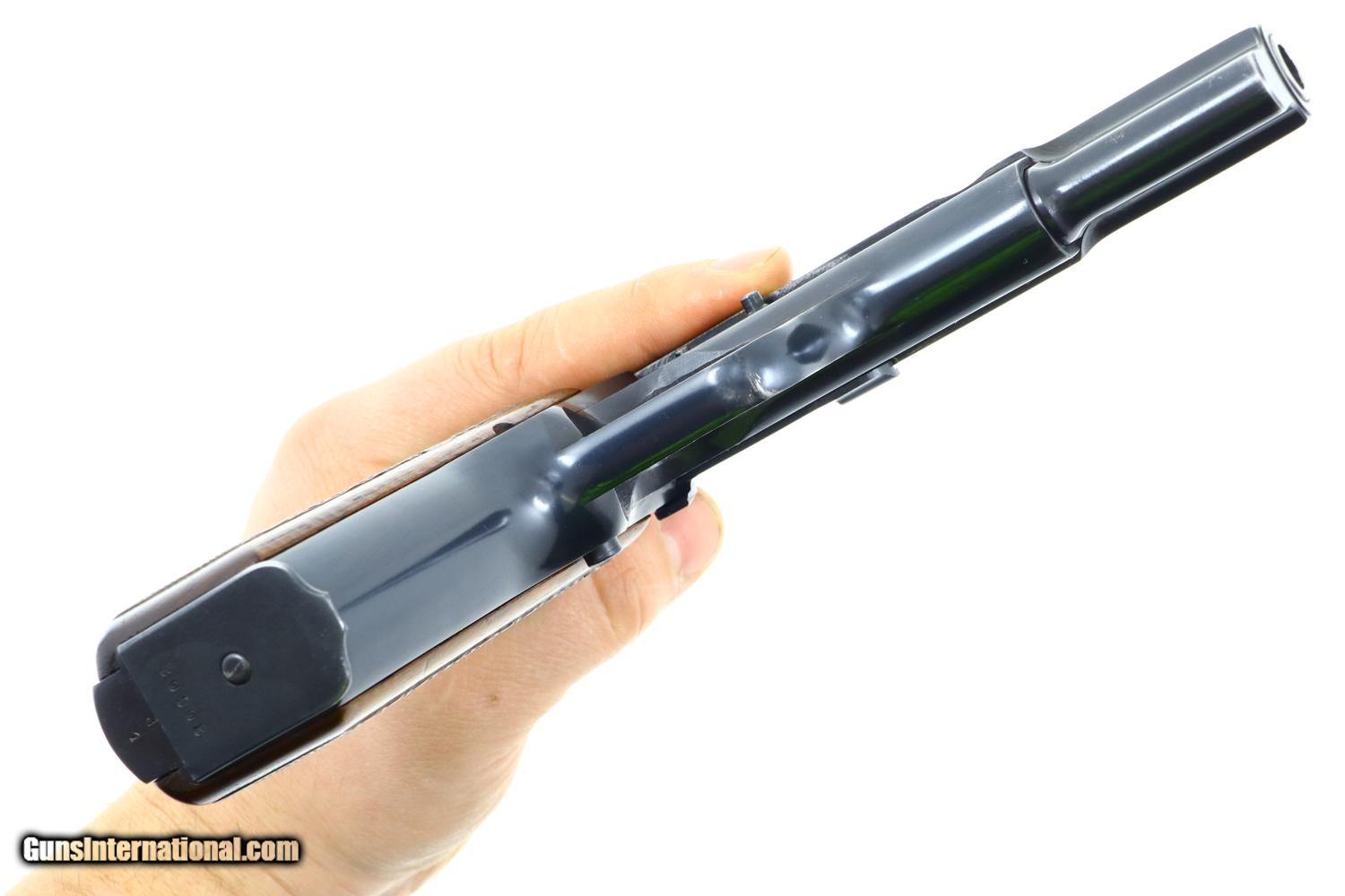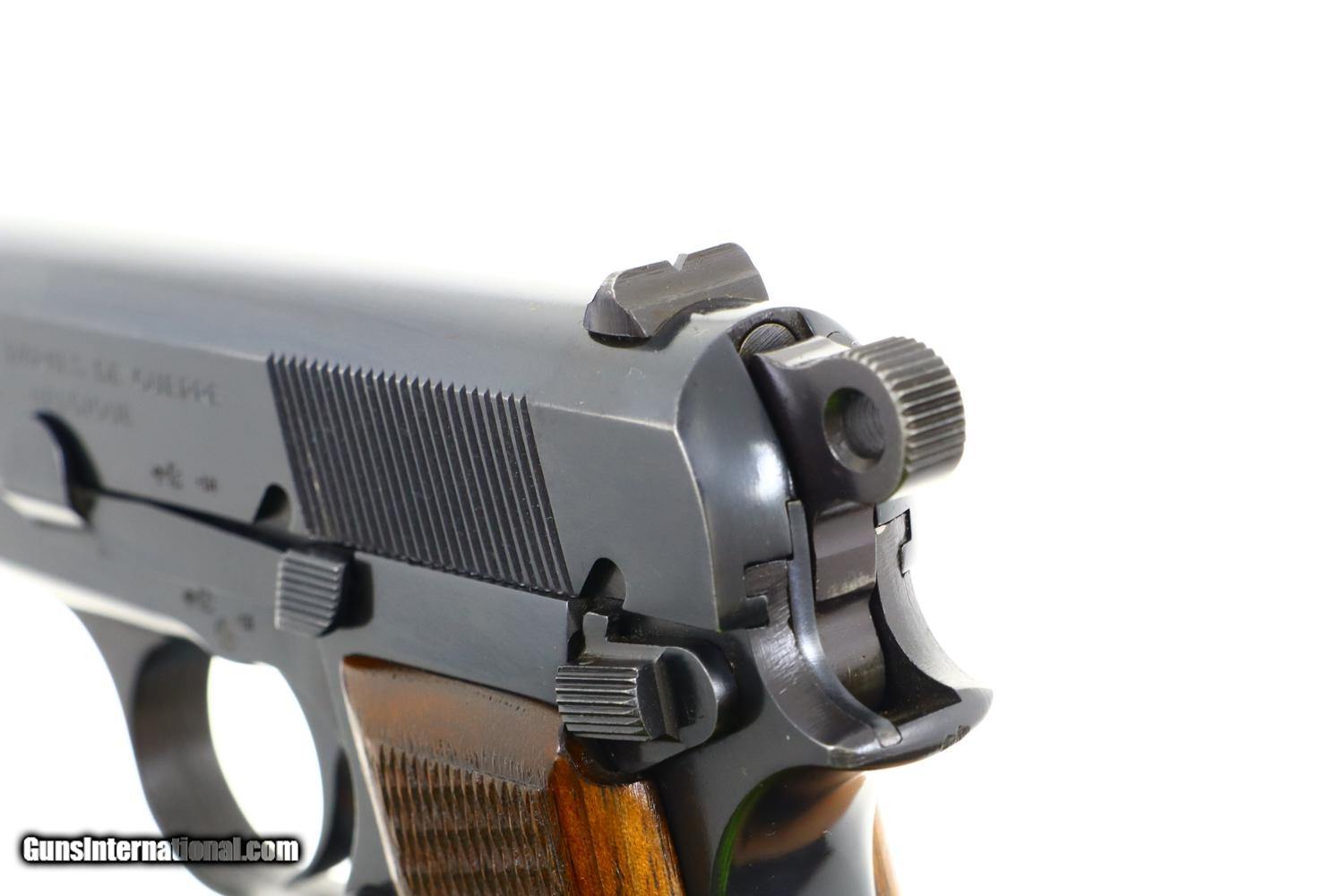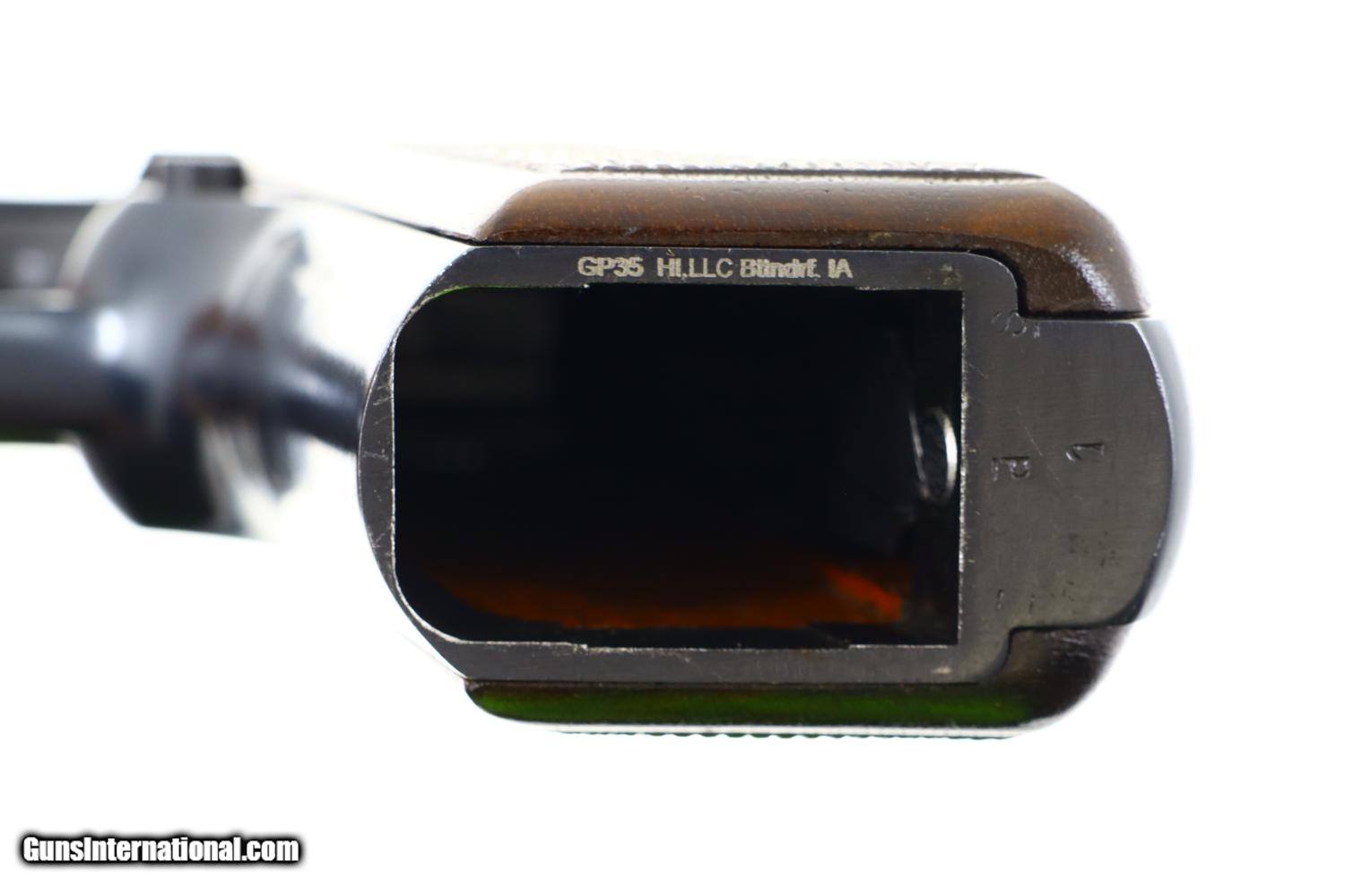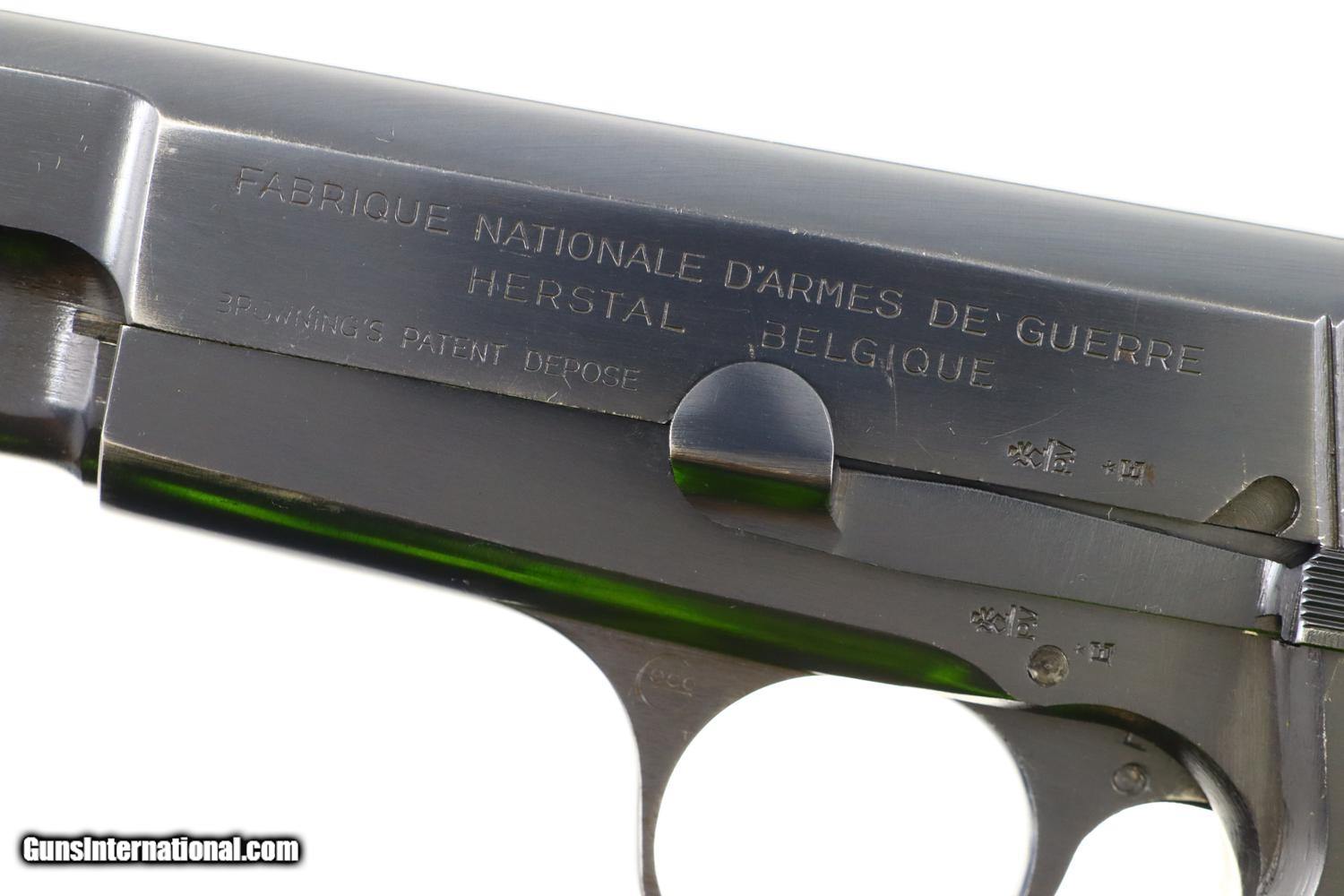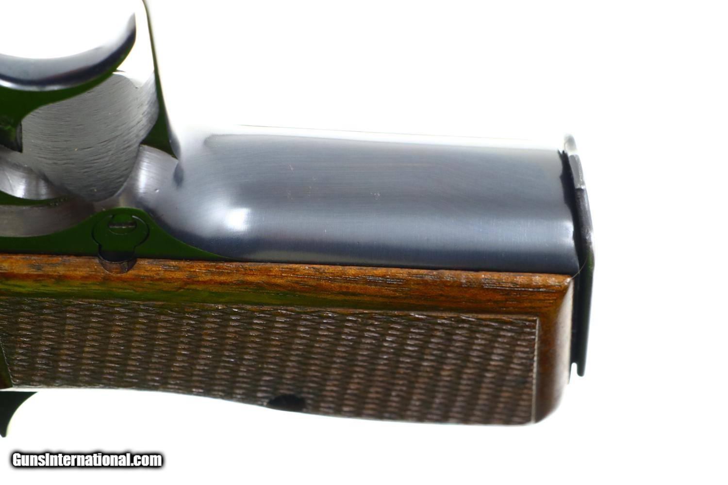 Description: Wonderful FN Hi Power Rig as used by the West German police, circa 1950s, this example with two matching magazines and matching numbered holster. Standard configuration pistol with fixed sights. Usual FN address and patent reference on left side of thumb print slide, made with internal extractor. Geco (importer) marking on left side of trigger guard web. Exposed barrel hood marked with caliber. Full serial number on left side of chamber (hidden) and stacked on the right side of slide and frame. European walnut checkered grips with smooth border. Correct blued magazines with aluminum follower and button secured floorplate, each marked with the full serial number of pistol. Correct black holster, two belt loops on back with full serial number. Synopsis: FN, High Power, West German Police, Matching Rig, 30908, I-1091 Condition: Excellent original blue with sharp edge wear consistent with light field use. Same consideration applies to magazines. Mirror bright bore. Perfect manual mechanics. Holster with scuffs as photographed. An excellent and complete High Power rig as issued to the West German police after WWII. ~~Insured shipping fee of $75; most packages shipped using FedEx 2nd Day.~~ SOLD Curio/Relic: Yes Manufacturer: FN Serial Number: 30908 Caliber Info: 9mmP |