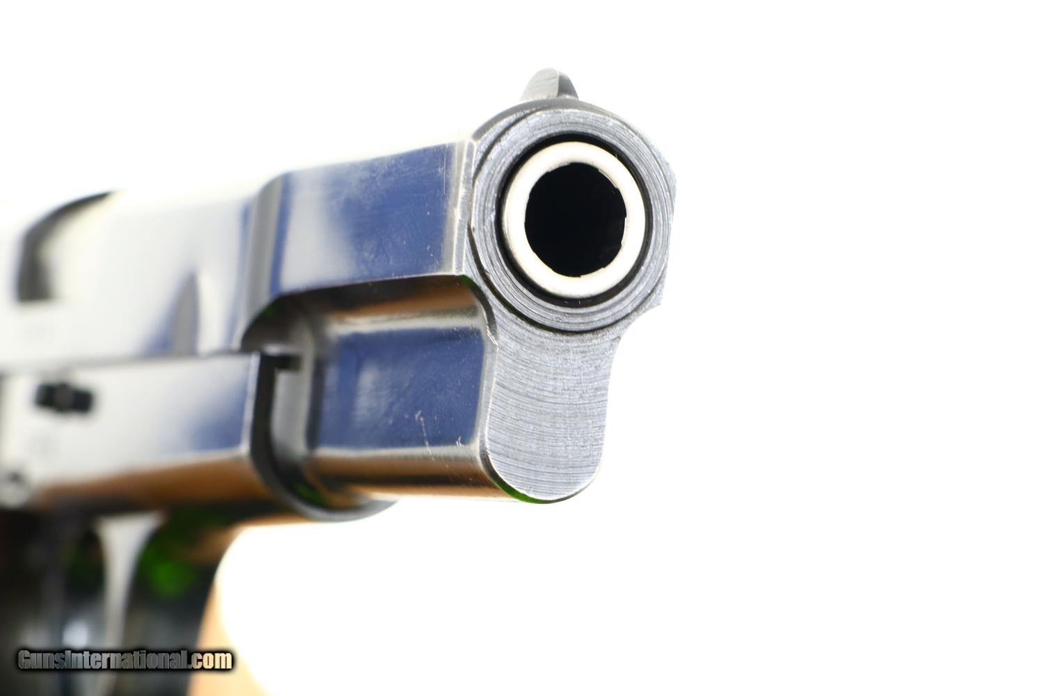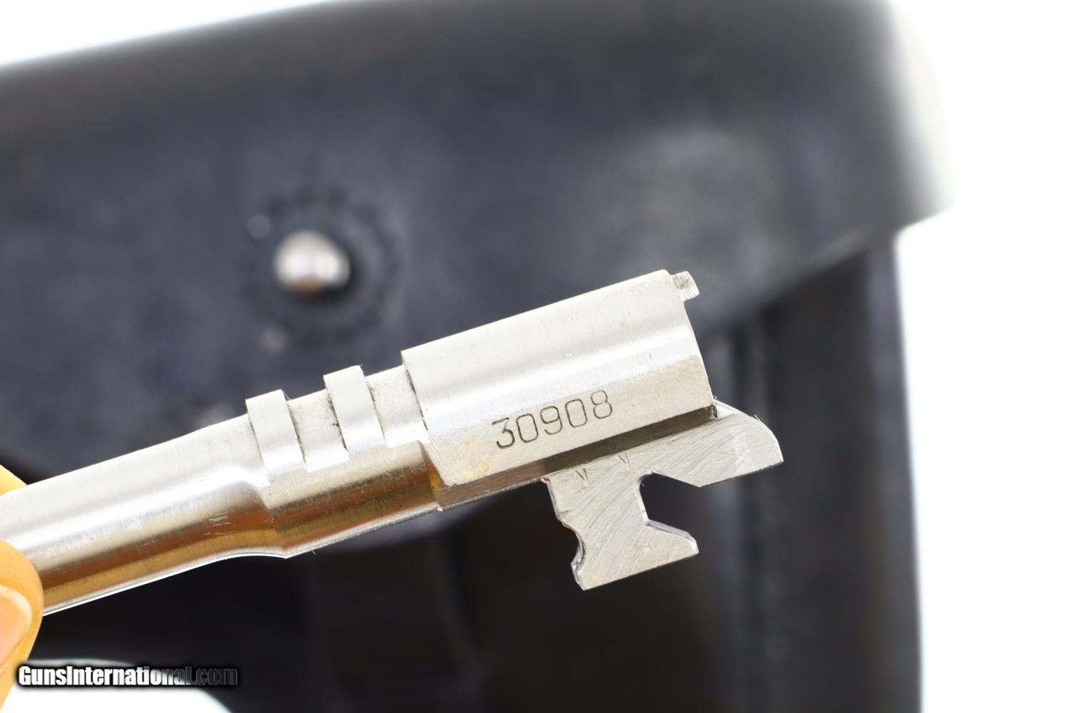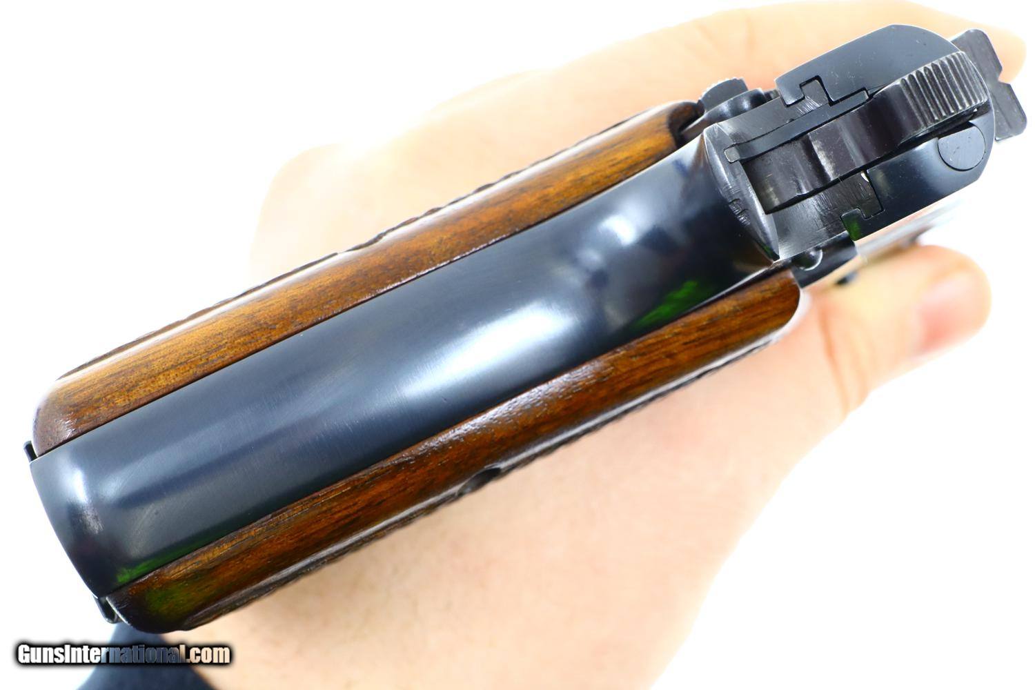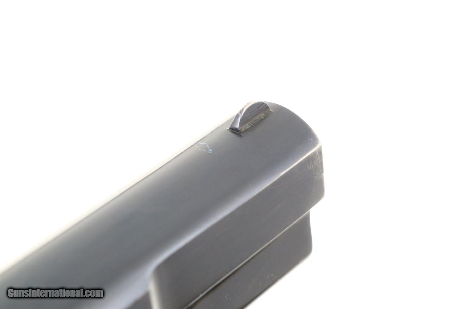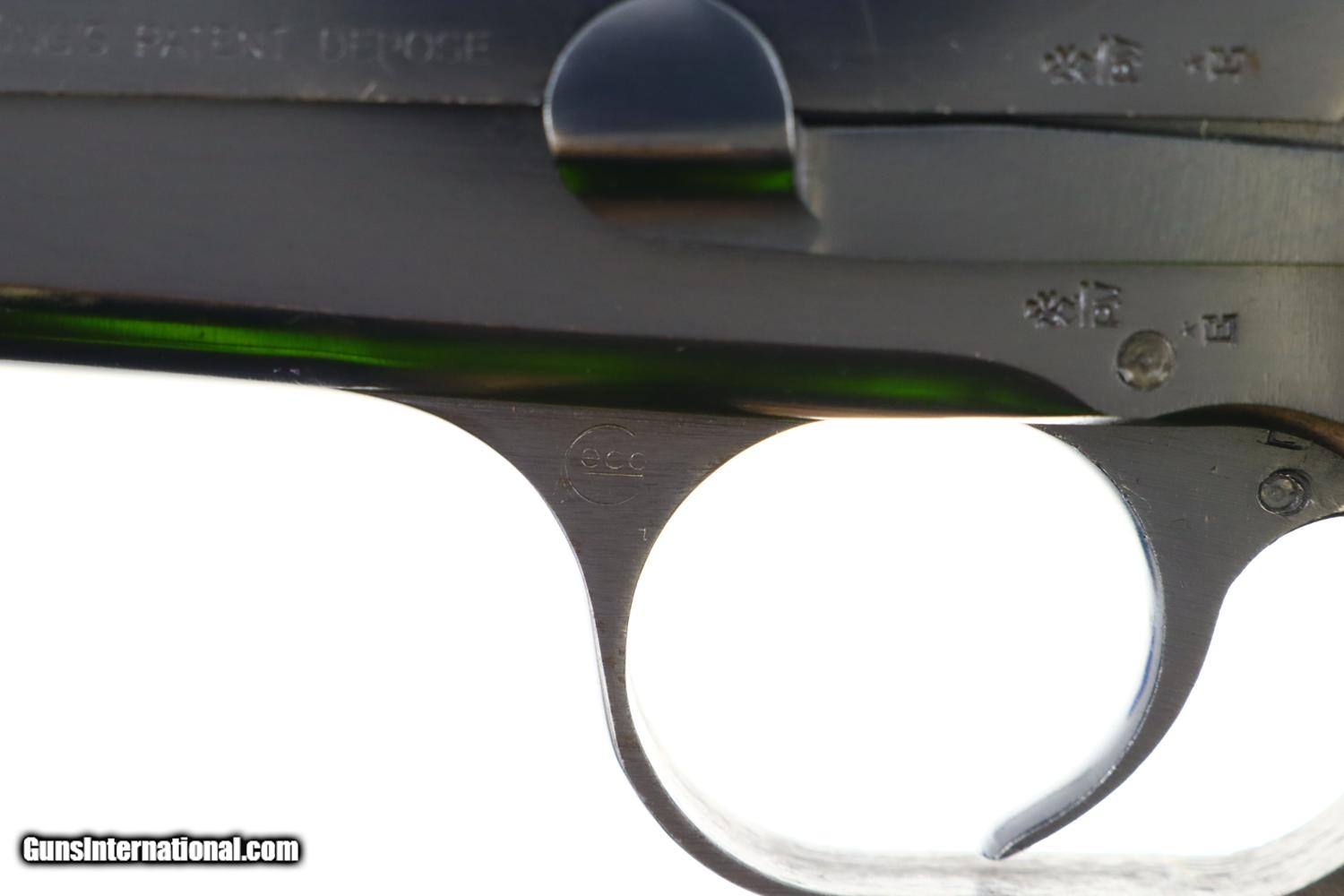 Description: Wonderful FN Hi Power Rig as used by the West German police, circa 1950s, this example with two matching magazines and matching numbered holster. Standard configuration pistol with fixed sights. Usual FN address and patent reference on left side of thumb print slide, made with internal extractor. Geco (importer) marking on left side of trigger guard web. Exposed barrel hood marked with caliber. Full serial number on left side of chamber (hidden) and stacked on the right side of slide and frame. European walnut checkered grips with smooth border. Correct blued magazines with aluminum follower and button secured floorplate, each marked with the full serial number of pistol. Correct black holster, two belt loops on back with full serial number. Synopsis: FN, High Power, West German Police, Matching Rig, 30908, I-1091 Condition: Excellent original blue with sharp edge wear consistent with light field use. Same consideration applies to magazines. Mirror bright bore. Perfect manual mechanics. Holster with scuffs as photographed. An excellent and complete High Power rig as issued to the West German police after WWII. ~~Insured shipping fee of $75; most packages shipped using FedEx 2nd Day.~~ SOLD Curio/Relic: Yes Manufacturer: FN Serial Number: 30908 Caliber Info: 9mmP |