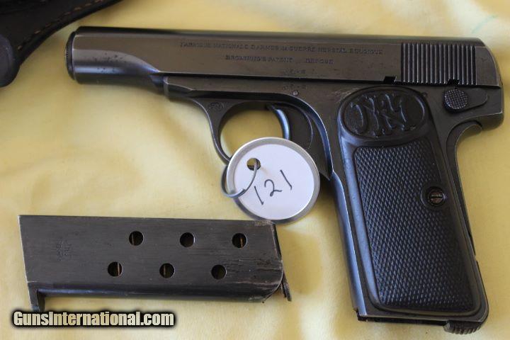 Description: FN M1910 early 1930's mfg. 7.62mm (32 auto) 95% original condition with original holster SOLD Curio/Relic: Yes |