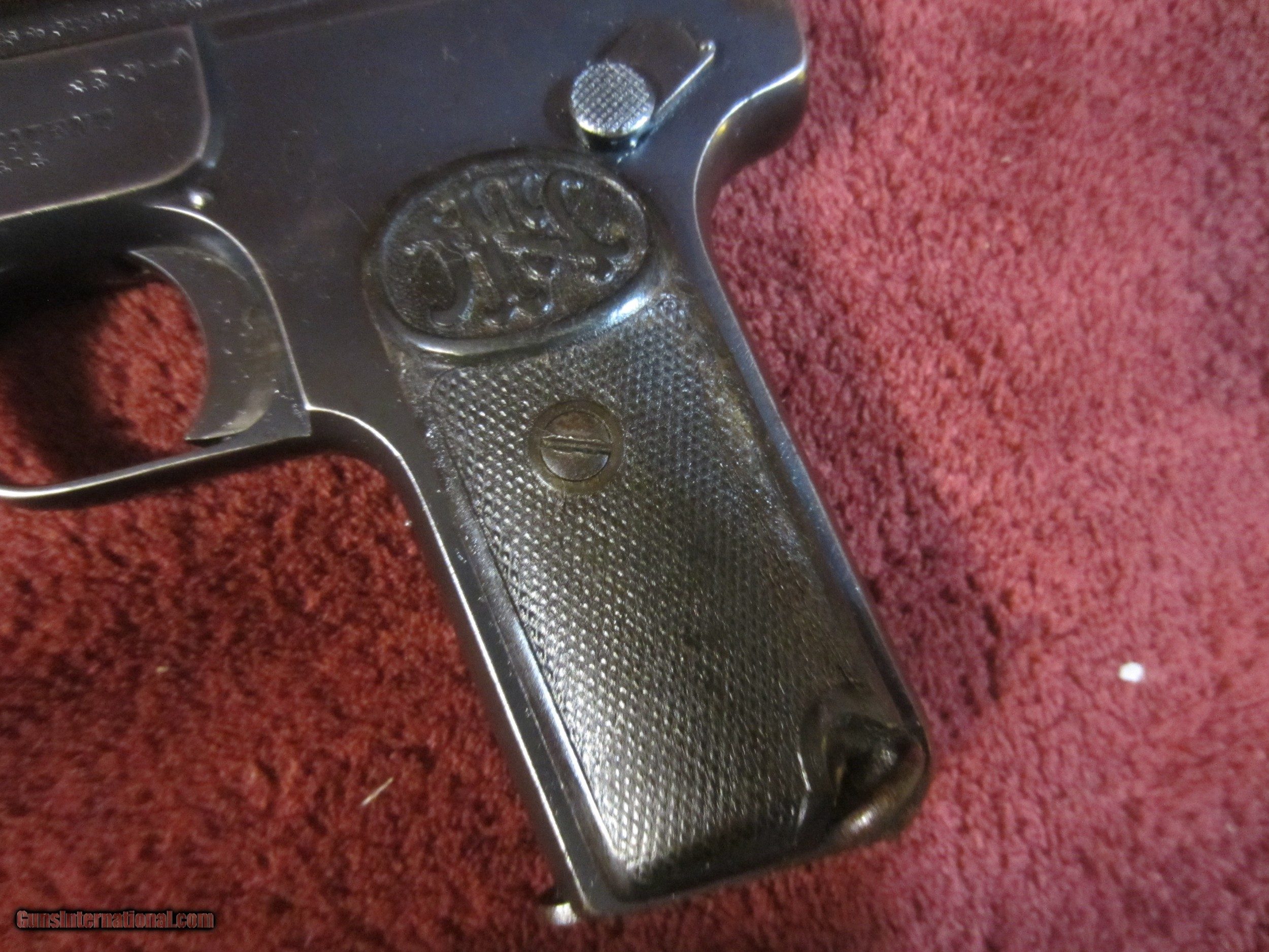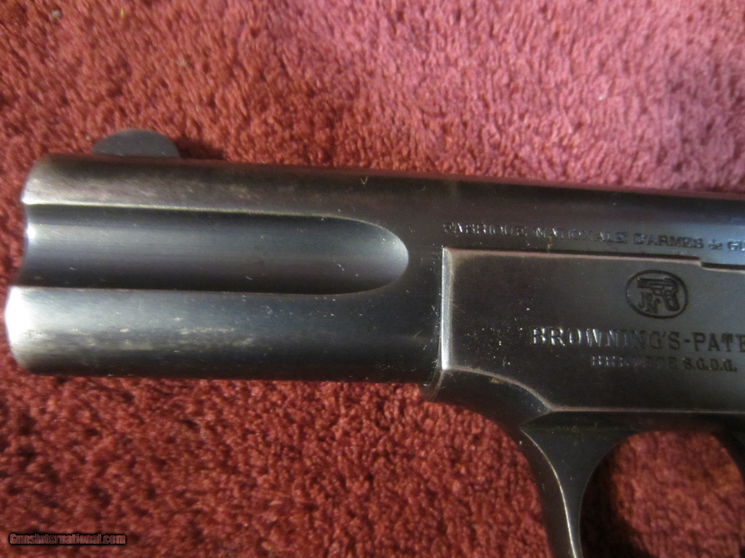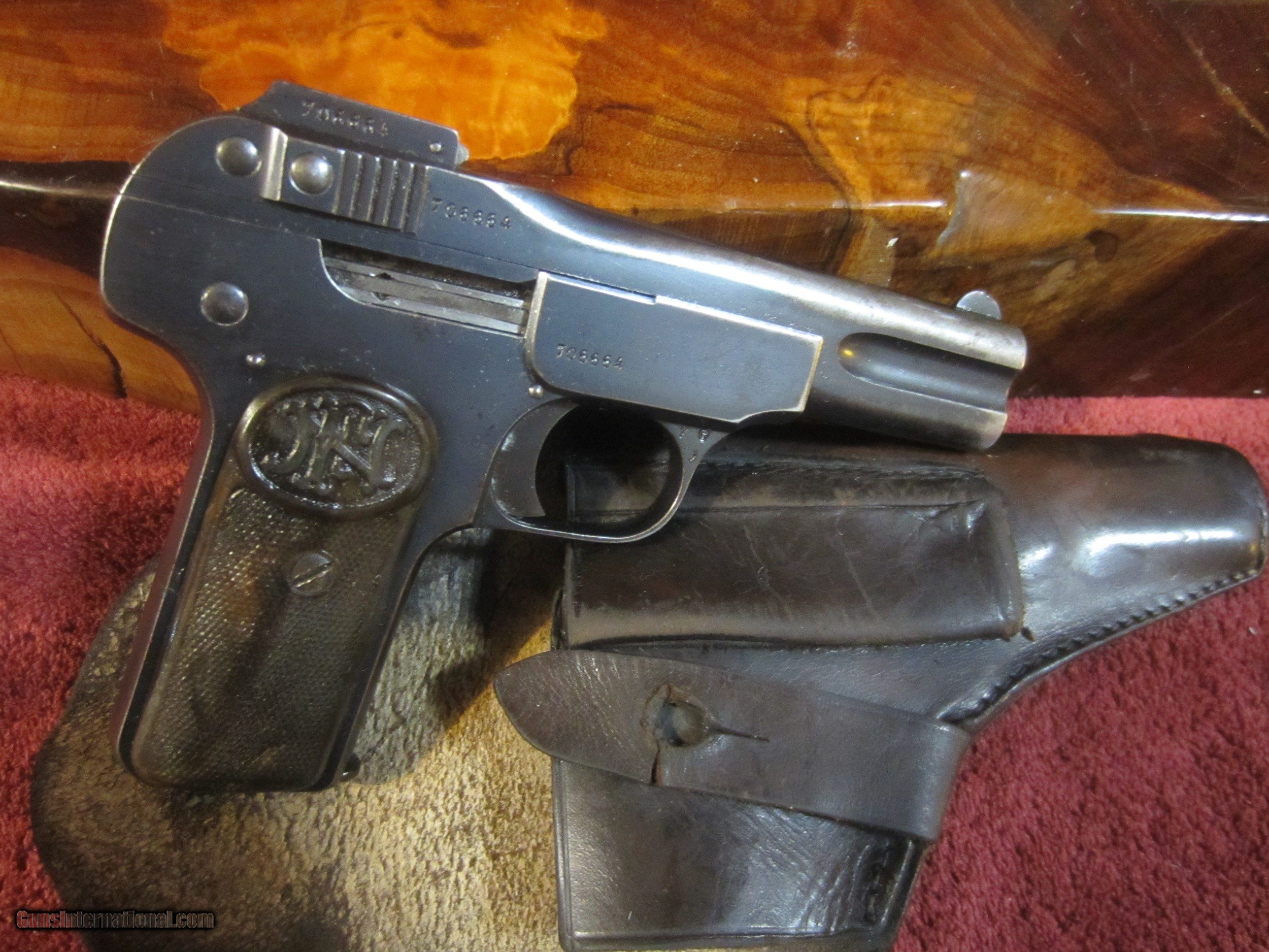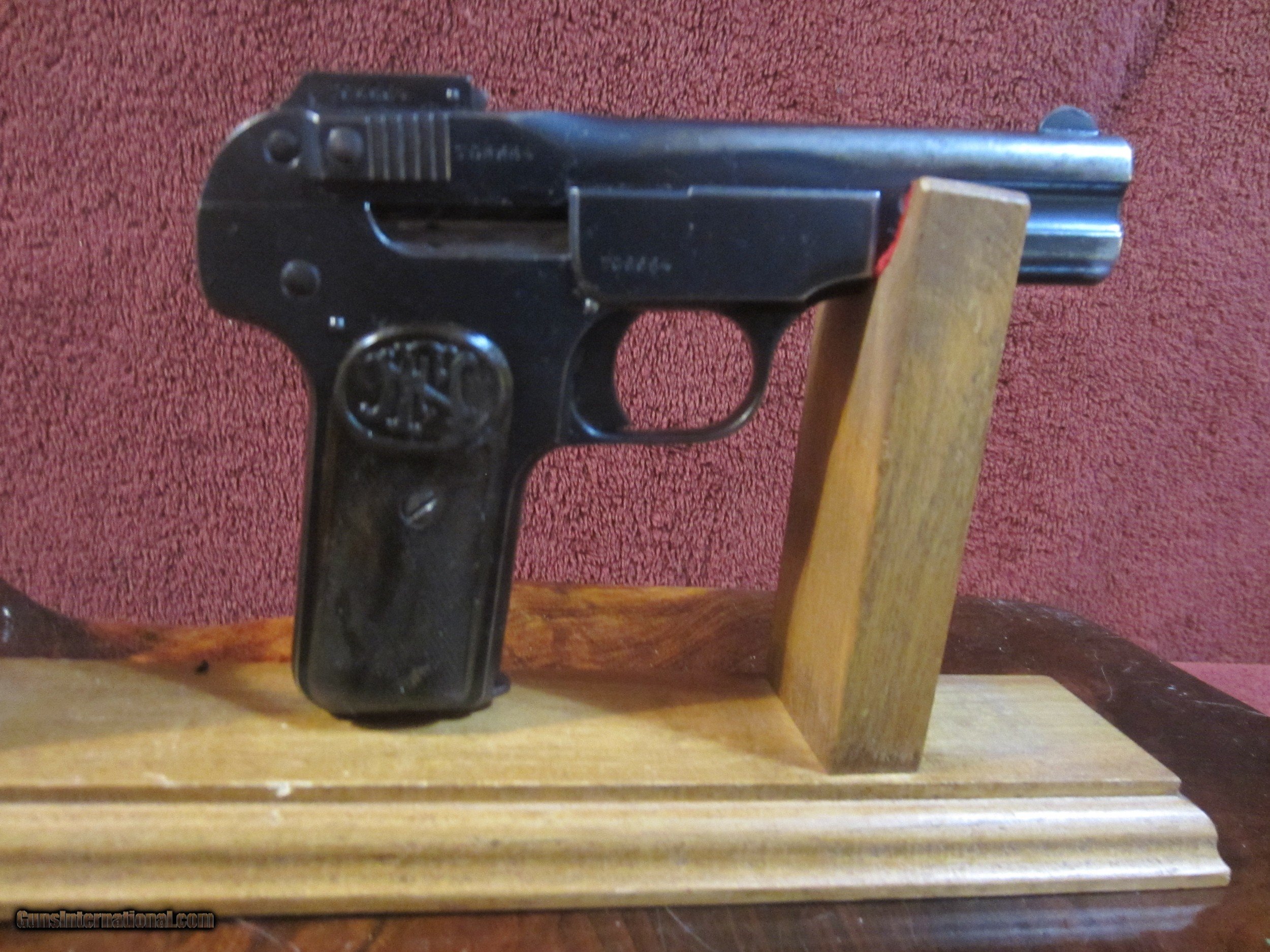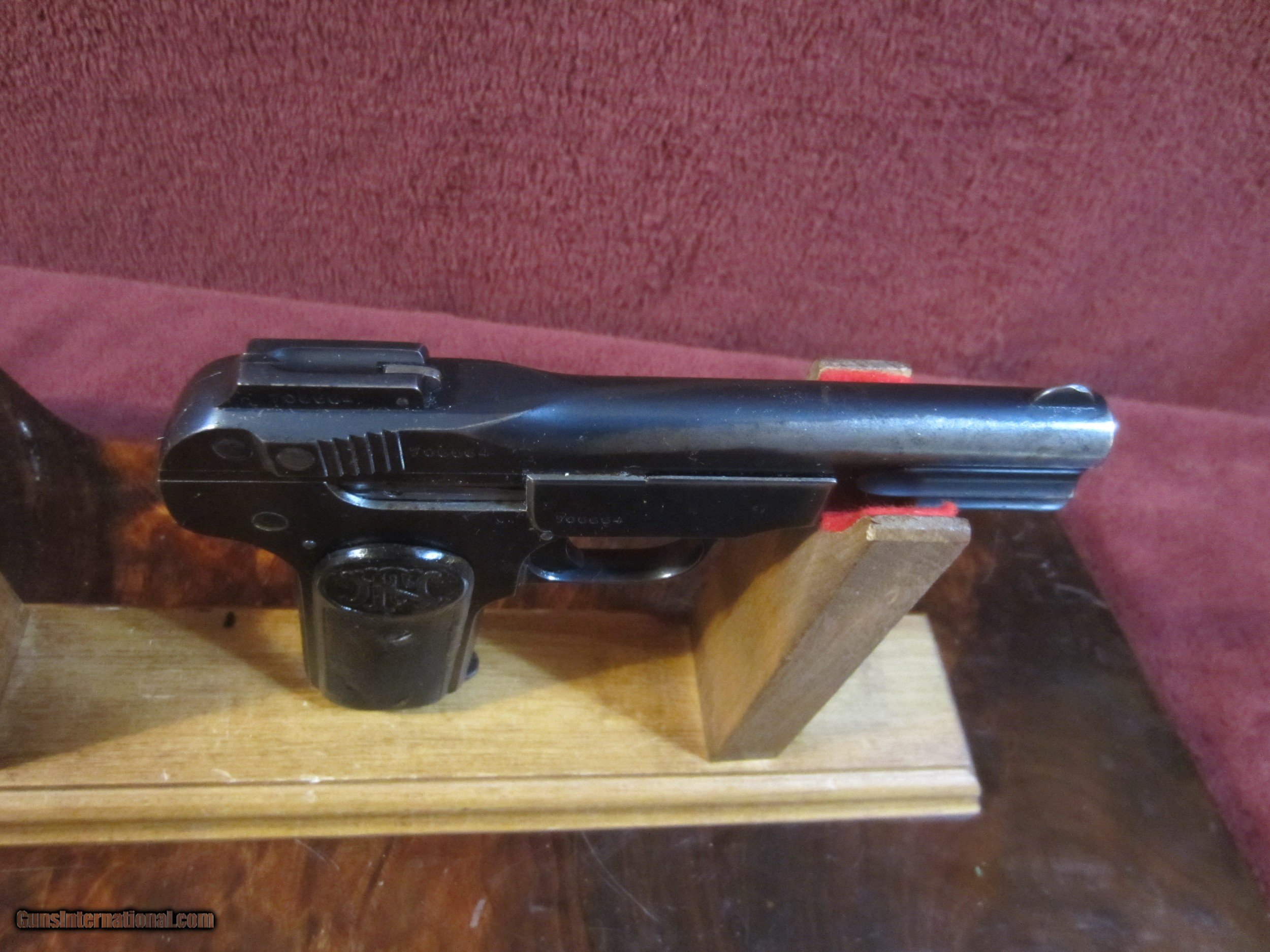 Description: **************SOLD************FN MODEL 1900 SEMI AUTO PISTOL ALL MATCHING NUMBERS BLUE EXCELLENT ABOUT 90% REMAING BLUE, BORE EXCELLENT DATE OF MANUFACTURE 1915 WITH ORIGINAL HOLSTER. WANT TO PURCHASE CALL SHOP 716-941-3946 SOLD Curio/Relic: Yes |