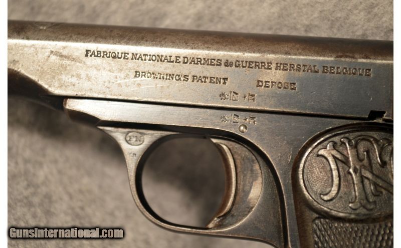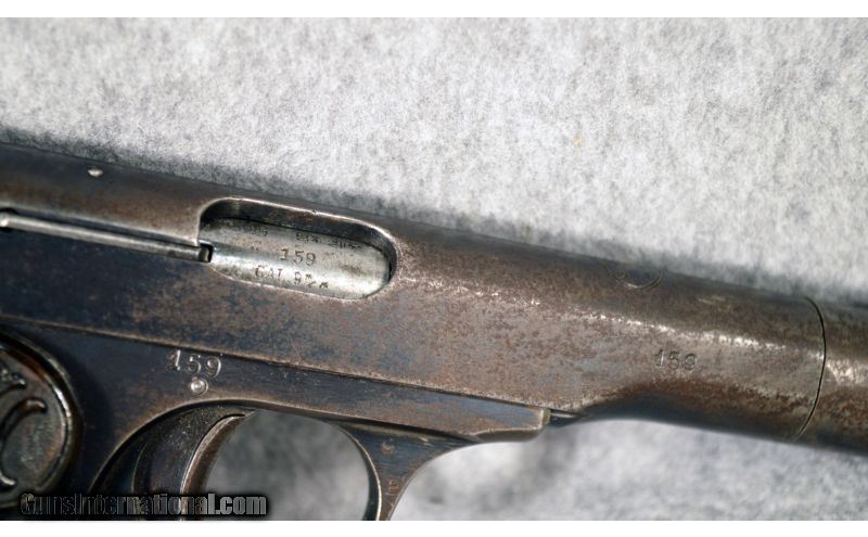 Description: An early Belgium made FN Model 1922 pistol. Firearm has matching serial numbers (SN 159) on frame, barrel and on top and underneath the slide and appropriate proof markings for the age of the firearm. This "Browning's Patent Depose" pistol would make a good addition to, or a good start, to a collection. SOLD Manufacturer: Circa 1922. Caliber Info: 9mm. Chambers: Semi-automatic, magazine fed. Metal Condition: Good, bluing is worn off, with metal patina and some pitting areas on front of barrel. Bore Condition: Good. Barrels: 4.5" steel. Triggers: Single trigger with thumb safety. Weight: 24 Oz. Sights: Blade front, adjustable notch rear. Item Location: Lexington, KY |