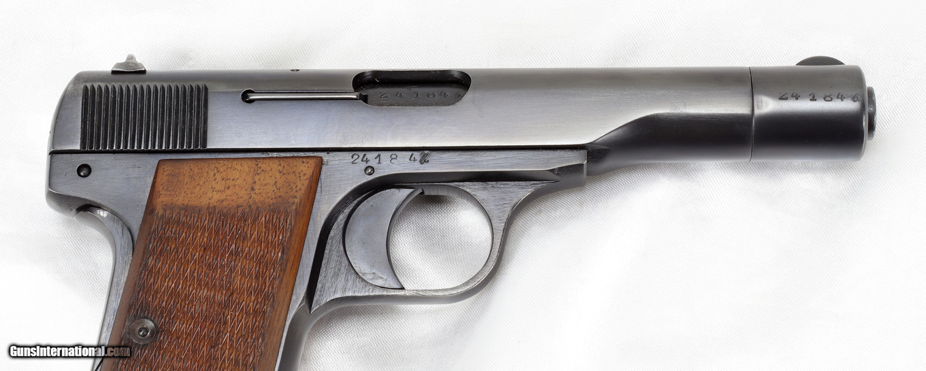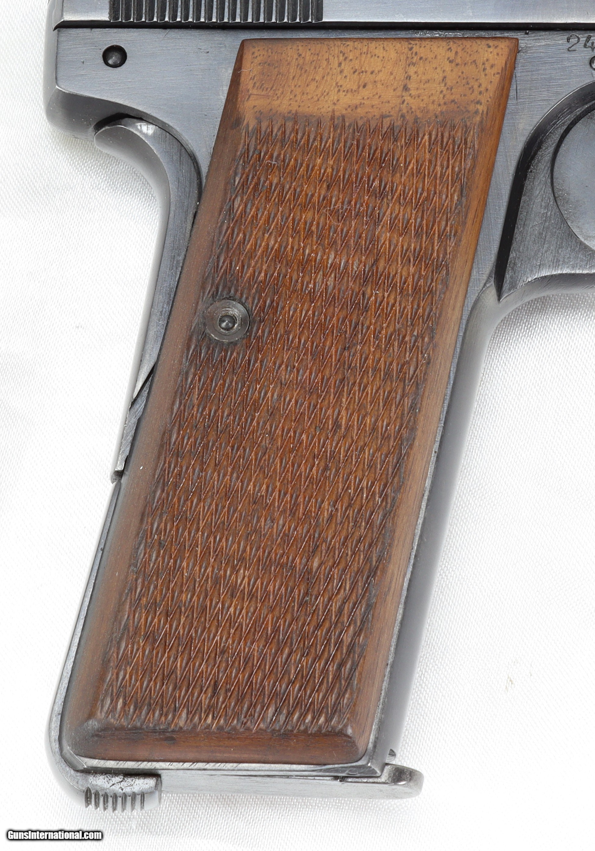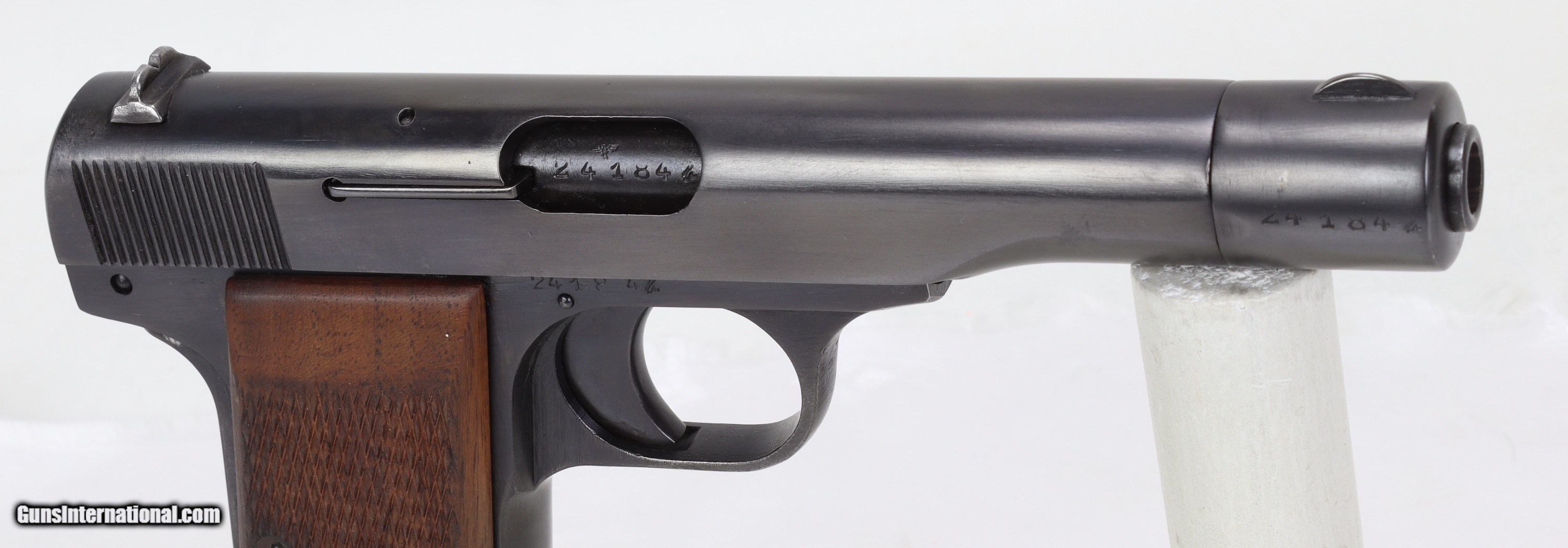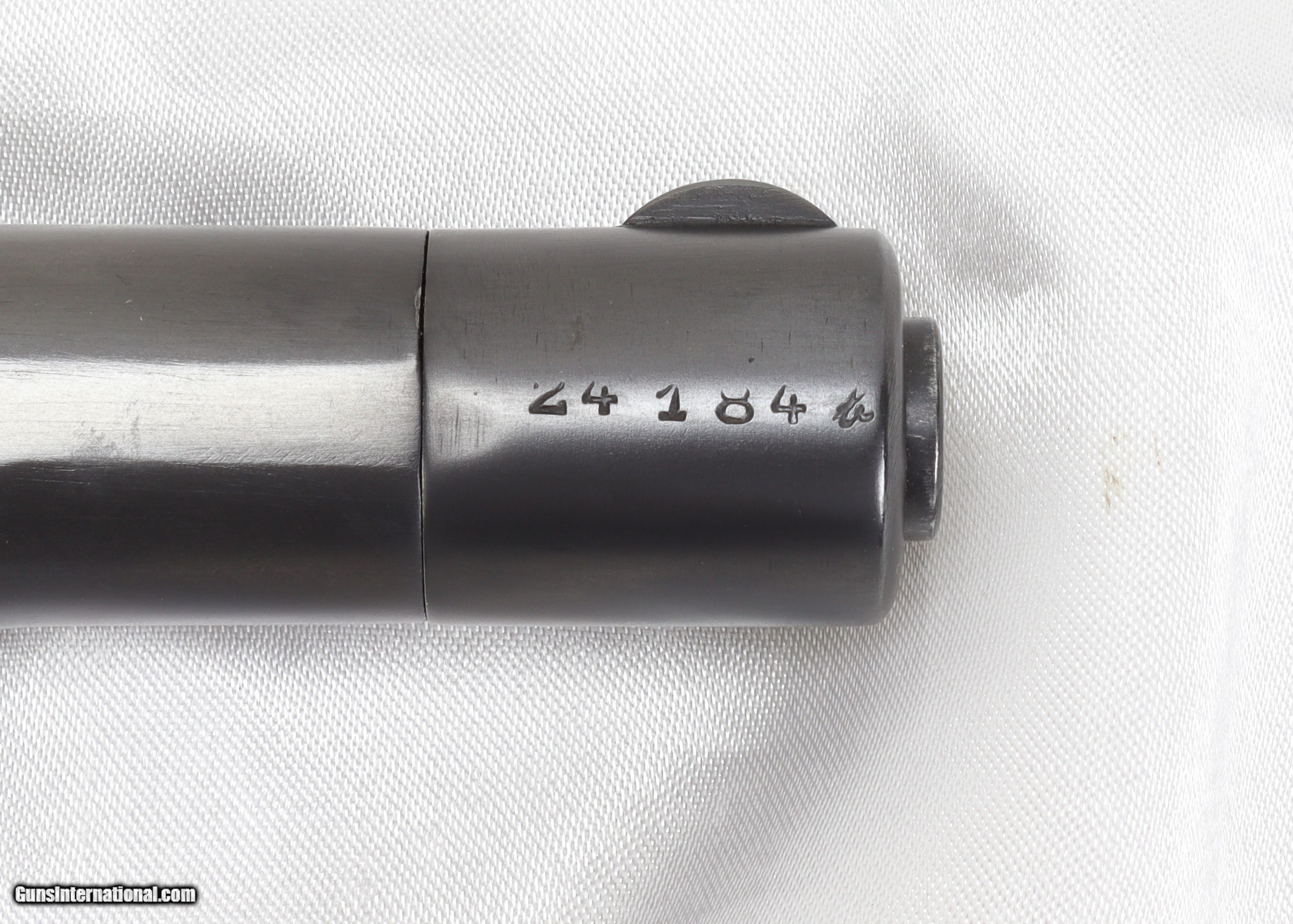 Description: FN Model 1922 Semi-Auto Pistol in .32ACP / 7.65. SN #24184b. Mfg. 1940-1944 Est. GERMAN WaA140 PROOFS AND NAZI MARKINGS.4 1/2" Barrel with an EXCELLENT Bright Bore with SHARP RIFLING. The Blued Metal finish is in VERY GOOD condition with some light handlings marks and wear. The Walnut Grips show some light wear but are in VERY GOOD condition for their age. 9 shot magazine capacity. Includes a nice leather Drop Holster with markings inside of " Nur fur lange Browning Pistole Kal. 7.65". Weight: 1.47 lbs. Trigger Pull: 5 lbs. 6 oz. More photos available upon request. Ships to Lower 48 W/ Insurance $35.00. SOLD Curio/Relic: Yes Handgun Caliber: .32 ACP (7.65x17mm Browning SR) Manufacturer: FN Model: 1922 Serial Number: 24184b Barrel Length: 4 1/2 Condition: VG for Age Metal Condition: VG for Age Wood Condition: VG for Age Bore Condition: Excellent Action: Semi Auto Finish: Blue Manufacture Date: 1940-44 |