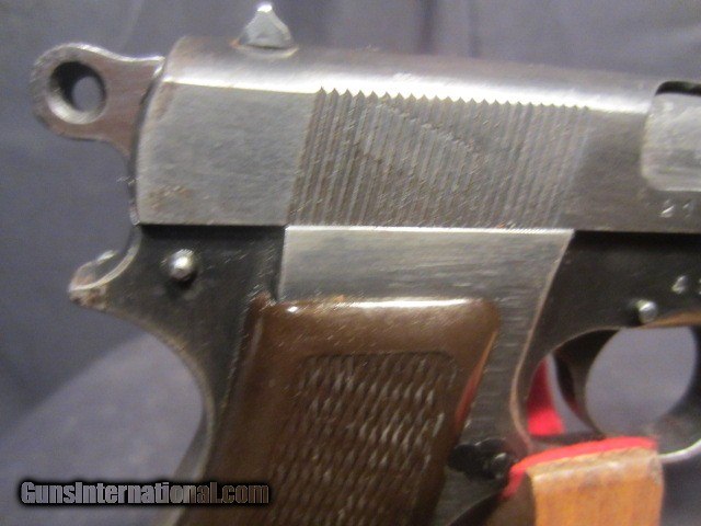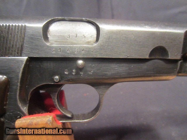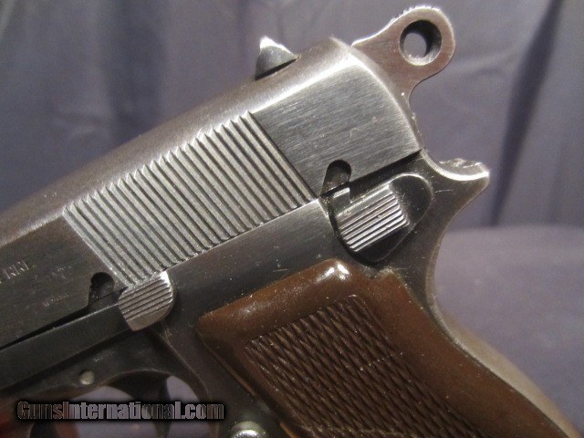 Description: FN P35 HIGH POWER NAZI MARKED. FINISH 80% OF ORIGINAL FACTORY BLUE CALIBER 9MM NAZI PROOF W 140 NO RUST OR PITTING BORE VERY GOOD. LEFT GRIP HAS HAIR LINE CRACK, SEE POINTER. ORIGINAL MAGAZINE HAS EAGLE 140 MARKED. BARREL SERIAL DOESNT MATCH MATCH RECEIVER OR SLIDE. MECHANICS EXCELLENT. GRIPS ARE WALNUT AND MATCHING COLORS. NEED MORE INFORMATION BEST TO CALL OUR OFFICE 716-941-3946 SOLD Curio/Relic: Yes |