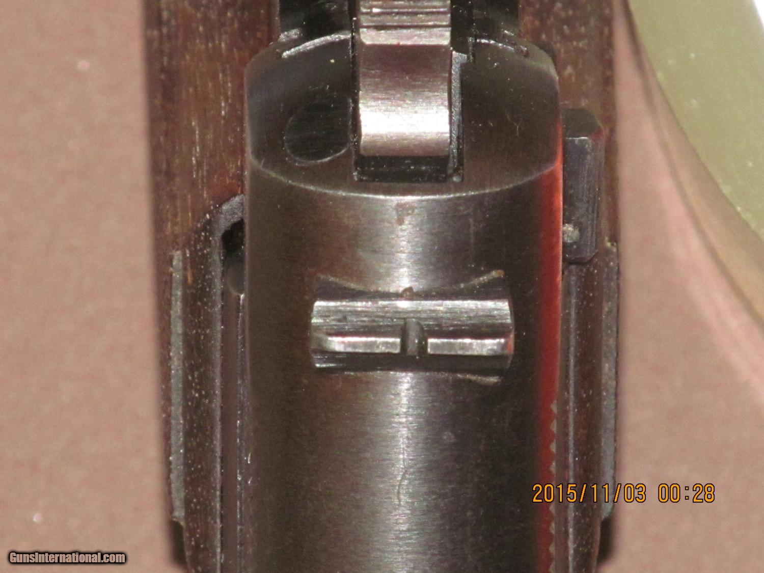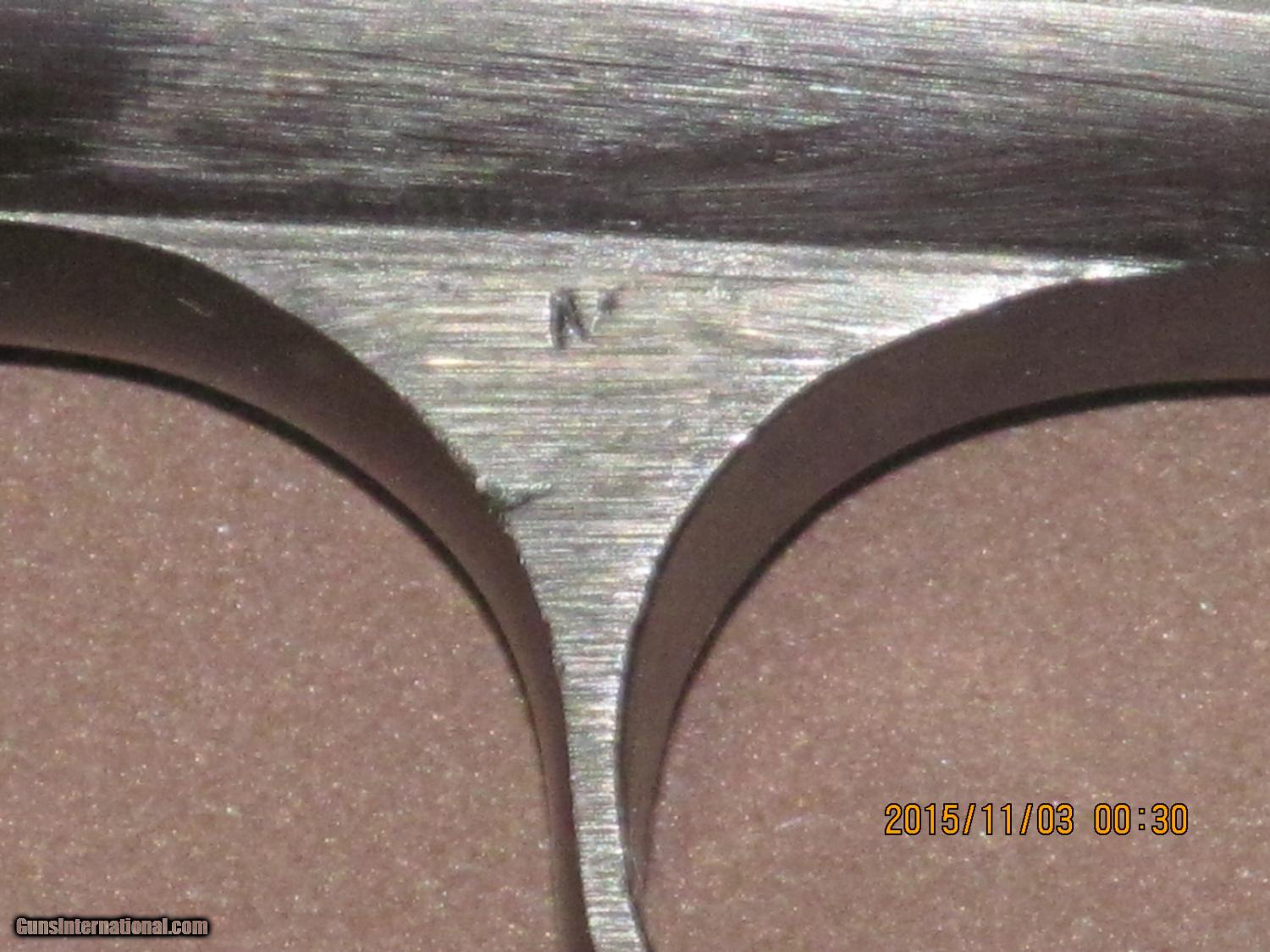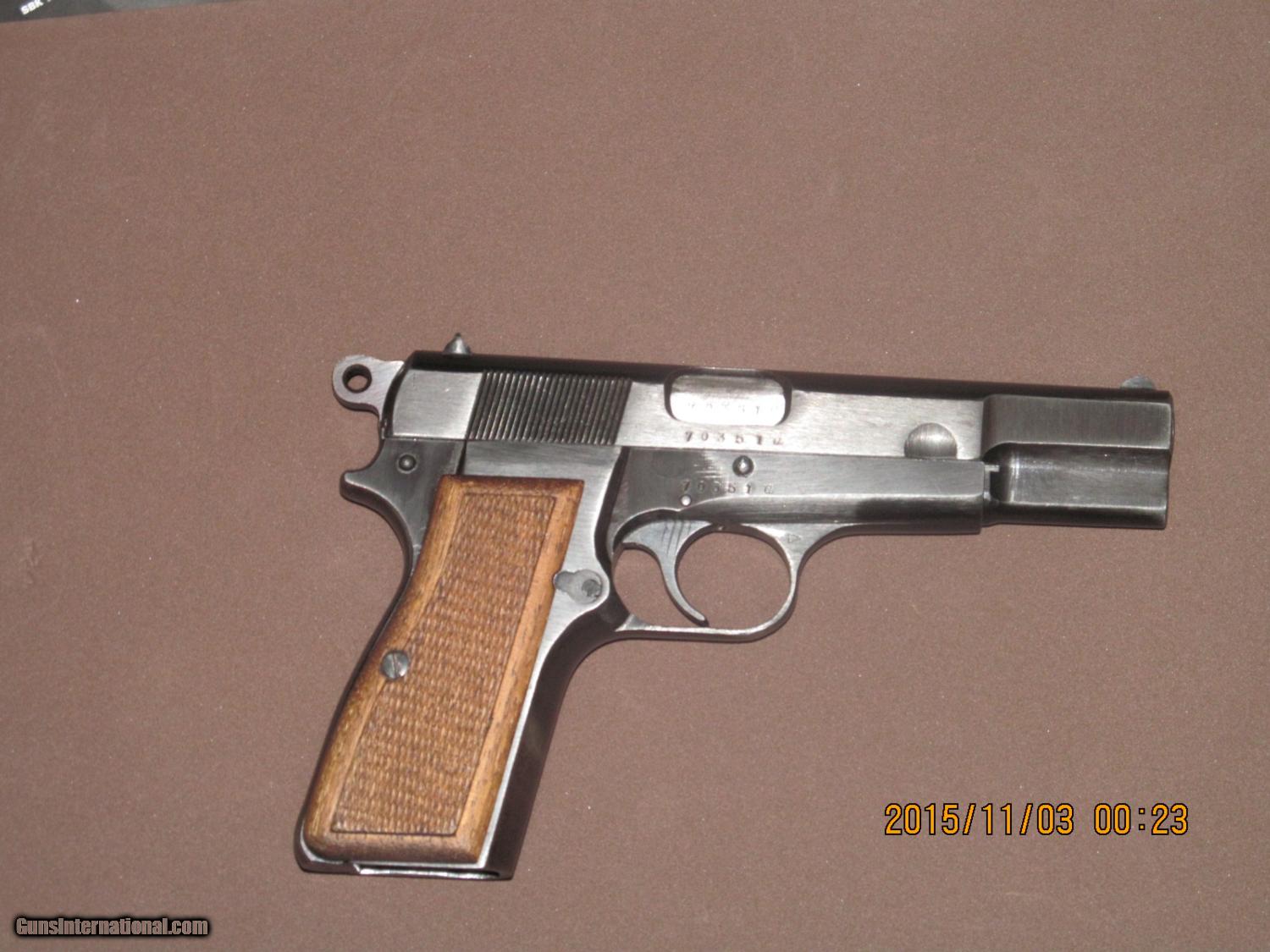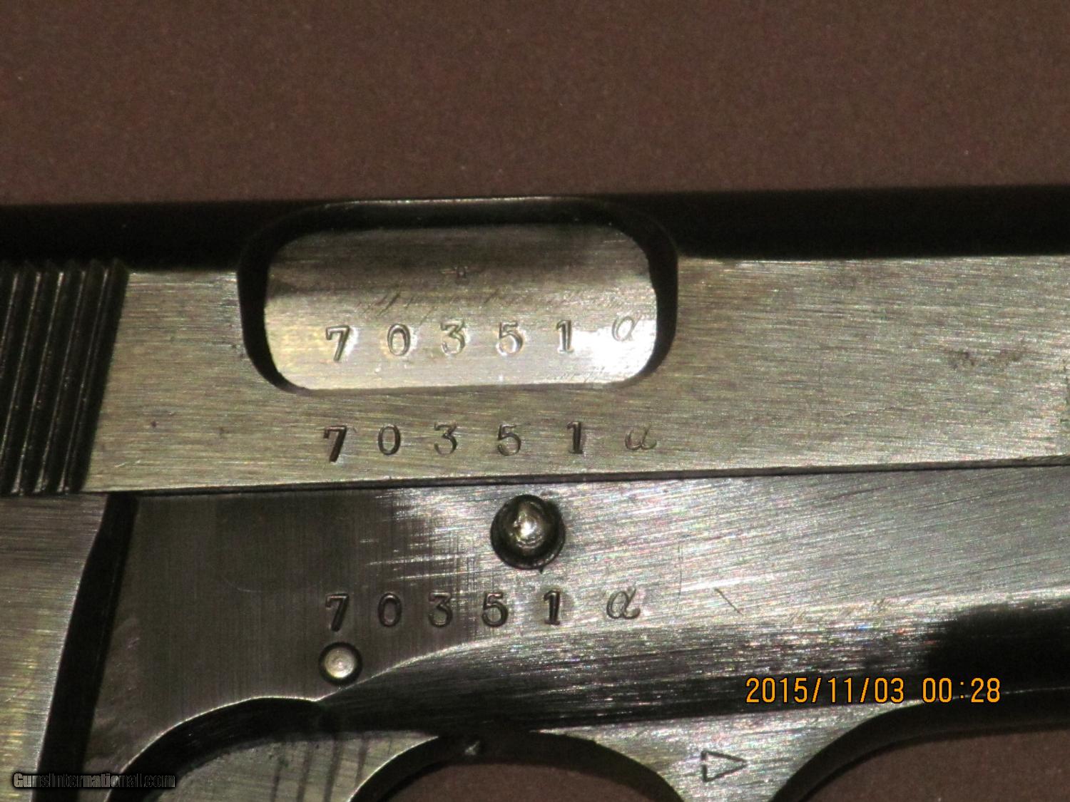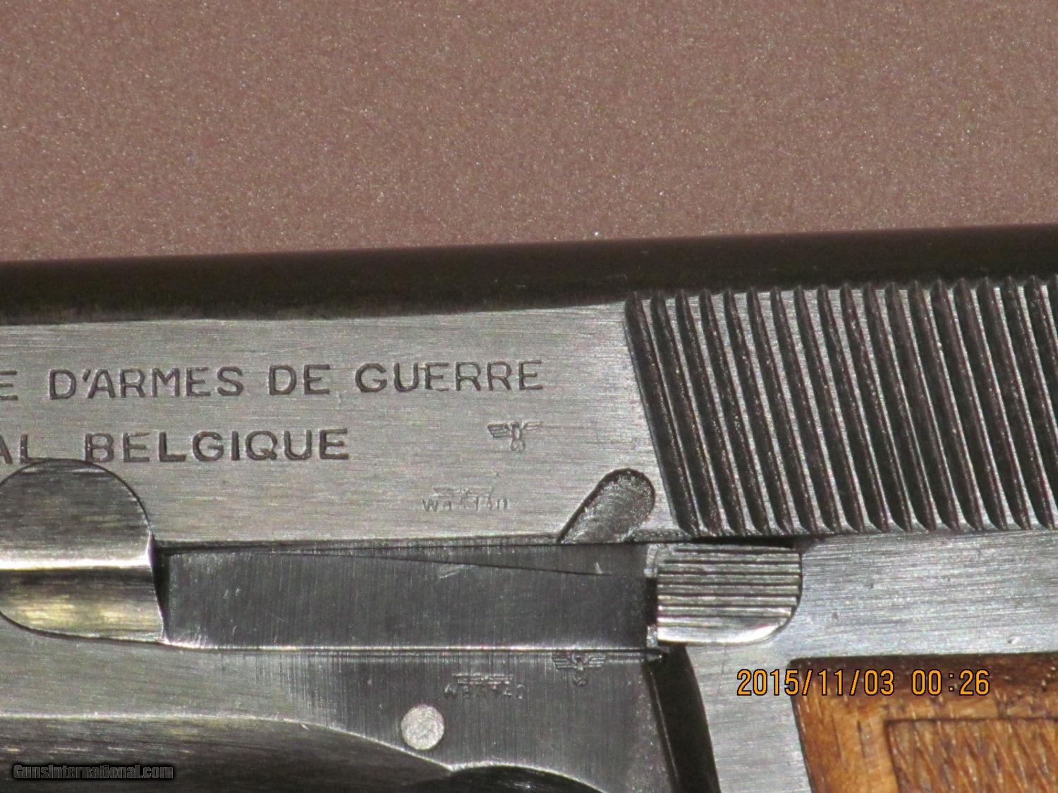 Description: FN Hi- Power Nazi marked. Shows Fabrique National D' Armes; DE GUERRE; Heratal Belgique. Browning's Patent Depose. Left side slide above safety has W8A340 , also on frame. Barrel has Nazi markings above serial number. Numbers matching. P proof behind rear sight; M left front of trigger guard; arrow on right front of trigger guard.Magazine well bottom marked 6,8 and a triangle with a marking inside. M R on the nottom of the barrel. Both grips are red inside with a 2 A on one and an A on the other? Magazine disconnect has been removed and has a new magazine. Blue is 98% with very good markings. Bore is very good with some light frosting in the grooves. LOWER PRICE FOR YEAR END!! SOLD Curio/Relic: Yes |