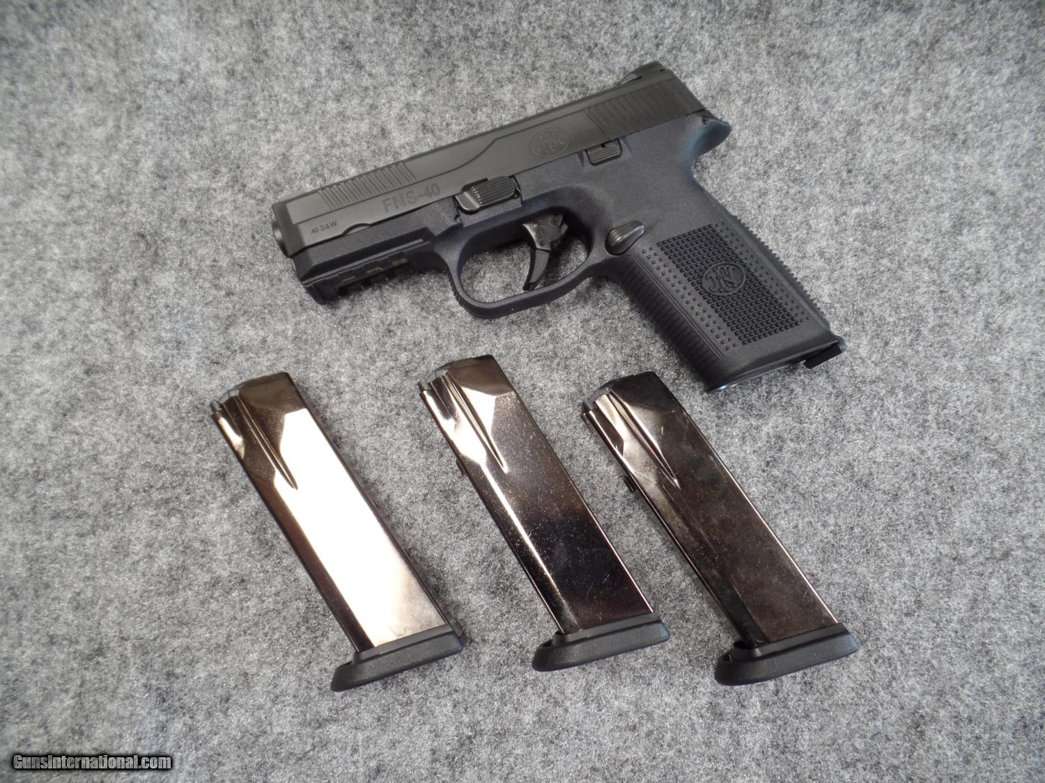 Description: FN USA Model FNS40 40 S&W Semi Auto Pistol This gun comes with 3 magazines along with the original box and paperwork. This gun is in excellent condition. The bore is very good and appears to be in like new condition. SPECS: MANUFACTURER: FN USA MODEL# 66760 MODEL: FNS40 CONDITION: USED ACTION: Semi Auto CAPACITY: 14 + 1 CALIBER: .40 S&W SIGHTS: 3 point White GRIP: Polymer BARREL: 1 in 16” RH Twist BARREL LENGTH: 4” OVERALL LENGTH: 7.25” WEIGHT: 27.5 lbs with empty 14 rd magazine COMES WITH: 3 mags box and papers MADE IN: USA SERIAL# GKU00840XX Please see pictures and feel free to ask questions. USA SHIPPING ONLY PAYMENT: We only accept the following methods of payment: Postal Money Order & Certified Bank Check SHIPPING: ALL FIREARMS ARE CHARGED A FLAT $35.00 shipping No International Shipping, USA Shipping Only SALES TAX: 6% for Georgia Residents will be added to invoice We do not ship firearms to CA, DC, MA, MD, NY & Chicago, IL We do not ship magazines / guns in excess of 10 Rds to CA, NYC, Washington DC or 10 Rd pistol magzines to HI 12 Rds to Chicago, IL or 15 Rds to CO and NJ and 20 Rds to MD (see additional municipalities below if applicable*) FIREARM SALES: A signed copy of the Federal Firearms License of the dealer you wish your item to be shipped to will need to be submitted with your payment within 10 days of close of sale. ORDER INSTRUCTIONS: If you wish to purchase please call the phone number listed or send us an email with the following information: