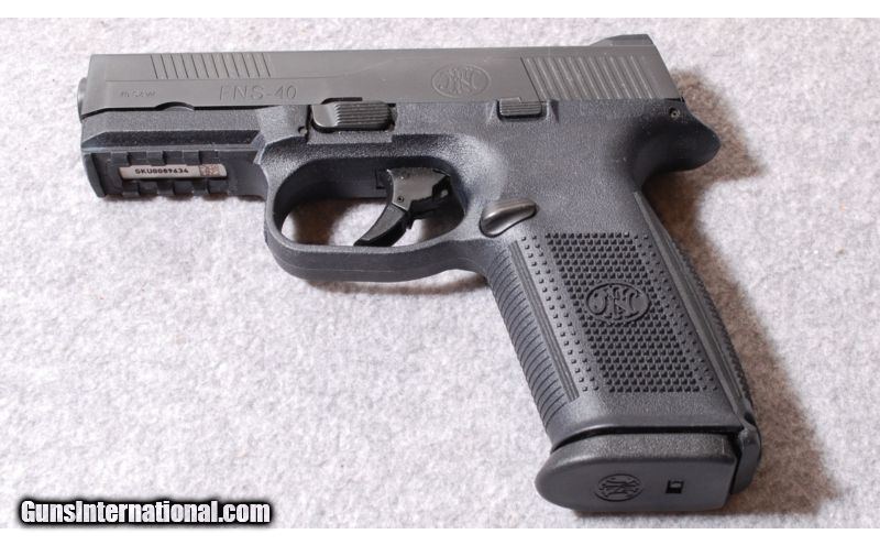 Description: Chambered in the hard-hitting .40 S&W, the FNS™-40 offers the simplicity of double-action striker-fired operation with fully ambidextrous operating controls for ease of use with either hand and from any shooting position. Both the slide and barrel are stainless steel with front serrations, while the checkered polymer frame has two interchangeable backstraps and lanyard eyelets. The MIL-STD-1913 under-frame rail accepts tactical lights and lasers. SOLD Caliber Info: .40 S&W Metal Condition: Good very few very Lite User Marks Barrels: 4 Triggers: Factory Trigger Stock: Synthetic / Black Weight: 1.5 Lbs. Sights: 3 white dot Extras: Holster, 2 extra mags Item Location: Rapid City, SD |