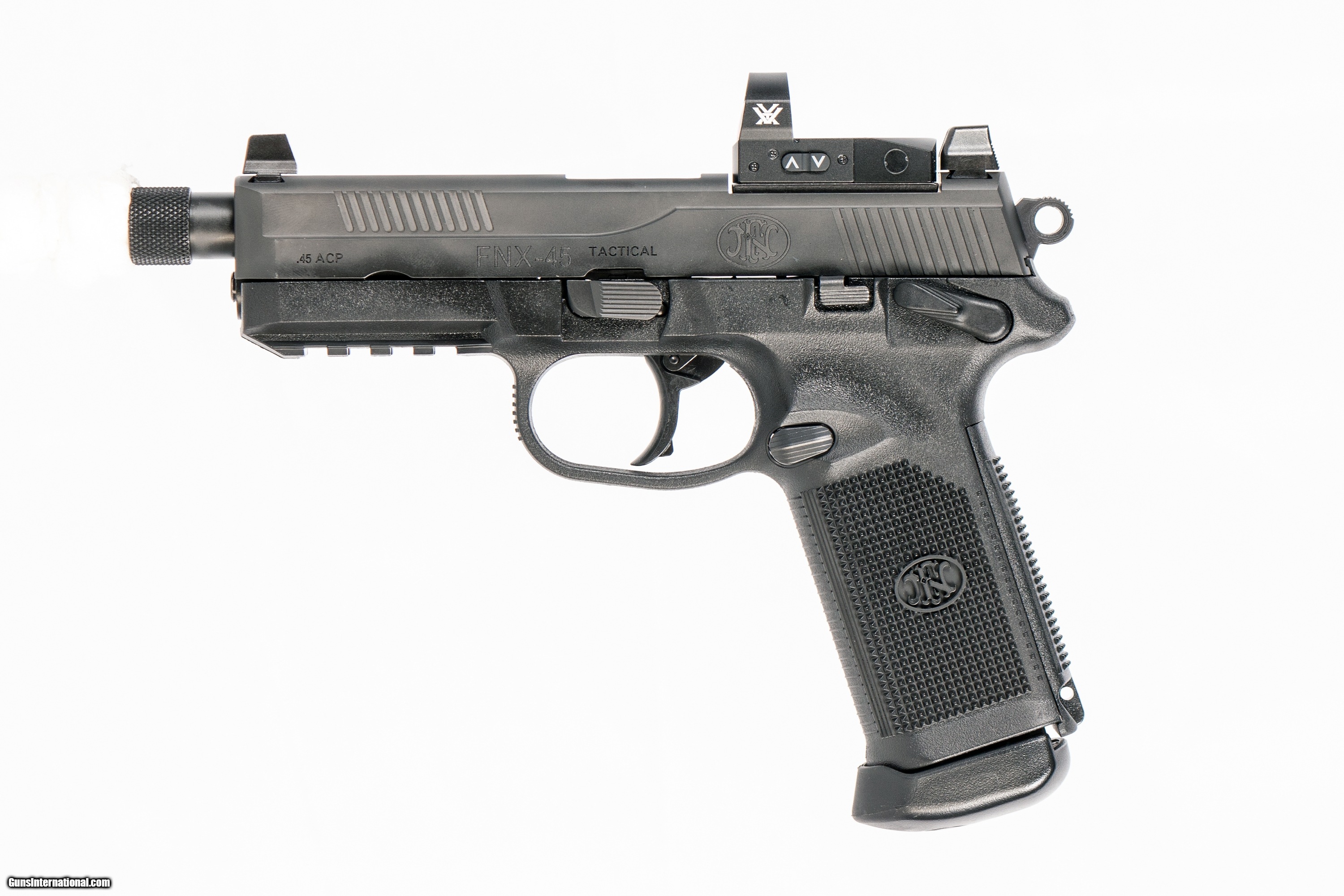 FNH FNX-45 Tactical chambered in 45 ACP with a 5 1/4 inch threaded barrel with a bright and shiny bore with a vortex venom red dot soft case and one extra magazine. This firearm is in excellent condition and is covered by Dury's Lifetime Warranty.