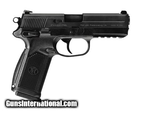 FNH FNX-45 Double Action/Single Action .45 ACP 4.5 Inch Barrel Black Finish Black Slide Combat Sights 15 Round FNX-45 Double Action/Single ActionStainless steel construction. External extractor with loaded chamber indicator. Front and rear cocking serrations. Cold hammer-forged stainless steel barrel construction. Polished chamber and feed ramp. Polymer frame. Replaceable steel rails. Two interchangeable backstraps with lanyard eyelets. MIL-STD 1913 accessory mounting rail. Serrated trigger guard. Ambidextrous decocking/manual safety lever and magazine release. Magazine is polished nickel coated steel body with low-friction follower and polymer base pad.