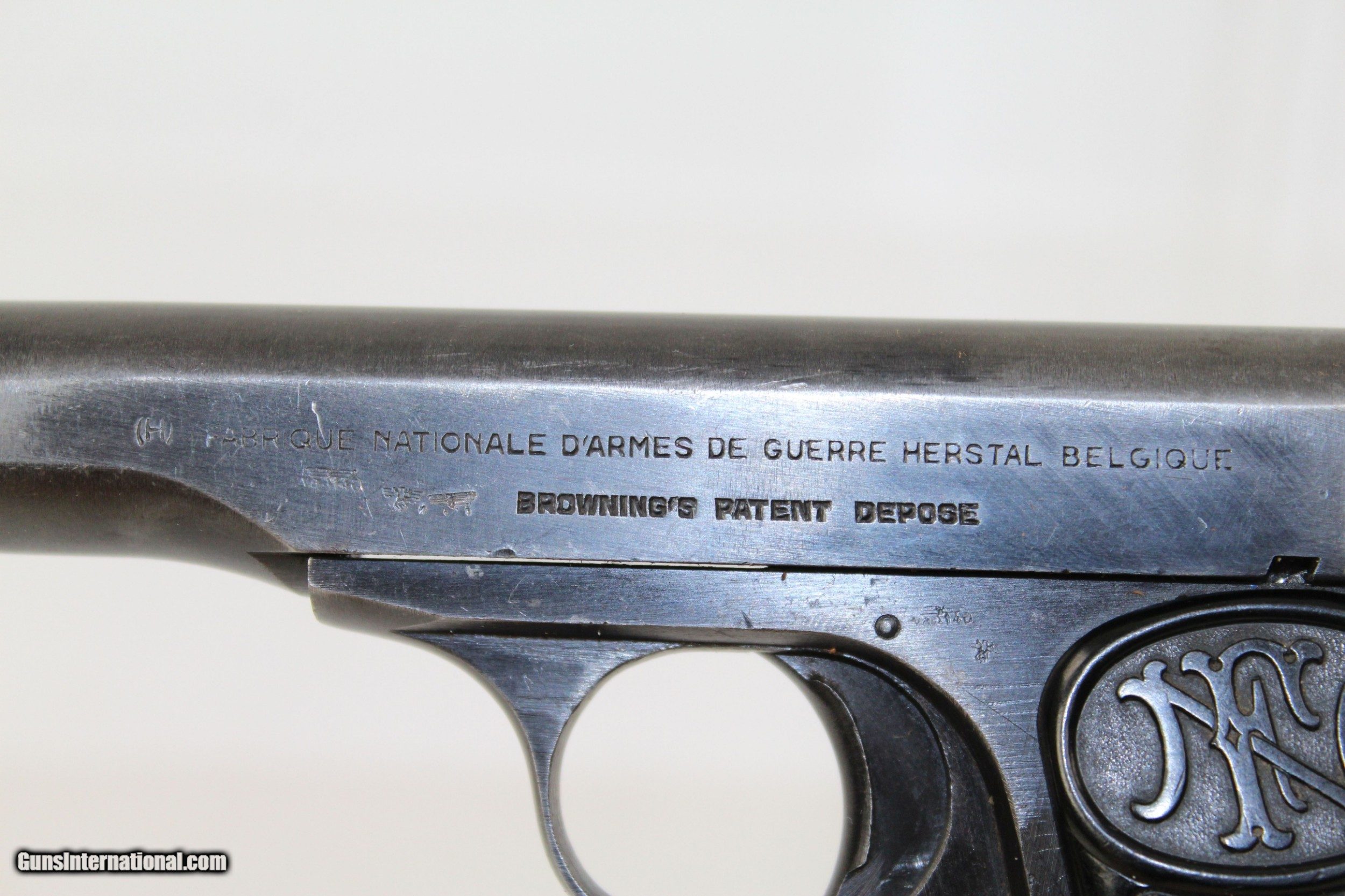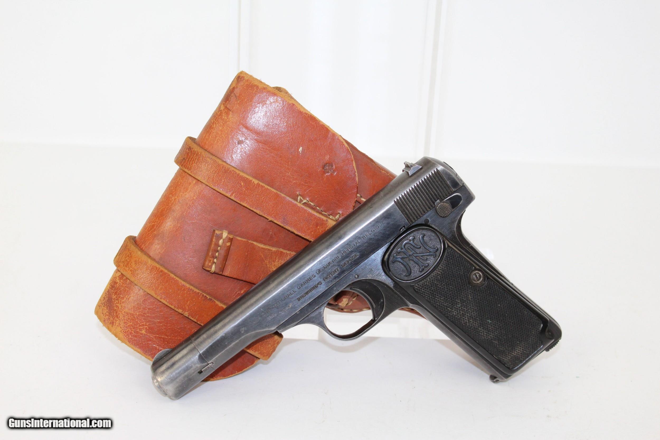 Description: NAZI GERMAN Fabrique Nationale Model 1922 Pistol With Leather Holster Here we present a Browning FN Model 1922 Pistol, made in Nazi Occupied Belgium, circa 1943, during World War II. Germany invaded Belgium on May 10, 1940 and consequently had their weapons manufacturing capabilities appropriated for the Third Reich. This pistol was appropriated by U.S. Corporal Paul Mahaney on 2 March 1946, according to the capture form. This was almost a year after Victory in Europe Day. Also listed on the form are a pair of binoculars and a hunting knife. Belgium has long been known for its weapons manufacture made for export all over the world. In 1889, Fabrique Nationale d'Armes de Guerre (National Factory of Weapons of War), was created, and in 1897, FN employed world famous gun designer John Moses Browning. Browning would go on to design the FN 1900 & 1910. The 1922 was the younger but larger brother of the 1910 (incidentally, it was the 1910 that Gavrillo Princep used to assassinate Arch Duke Ferdinand and Princess Sophie to kick off World War I). Many countries adopted the 1922 for their militaries, including Yugoslavia, Greece, Holland, France, Denmark, and Finland, amongst others. This specimen is one of those that was manufactured during the occupation for Nazi Germany. It was made for service in the German Army, Luftwaffe and police. It features checkered walnut grips and German acceptance marks. . The left side of the slide reads “FABRIQUE NATIONALE D’ARMES DE GUERRE HERSTAL BELGIQUE/BROWNING’S PATENT DEPOSE”. The overall condition is very good. 90% of the original blue finish remains. The markings are clear and legible. The bore is bright. The grips are in great shape. The action on this pistol is excellent. This firearm is classified as a Curio & Relic. Barrel is 4-1/4 inches. Caliber: .32 ACP (7.65mm Browning) Overall condition as seen in photos. Very Fast. Very Safe. FREE SHIPPING. Will need to be sent to your local FFL or C&R licensee. This firearm is classified as a Curio & Relic. Guaranteed AUTHENTIC & Includes CERTIFICATE OF AUTHENTICITY. ancestryguns $1500 #6595 SOLD Curio/Relic: Yes |