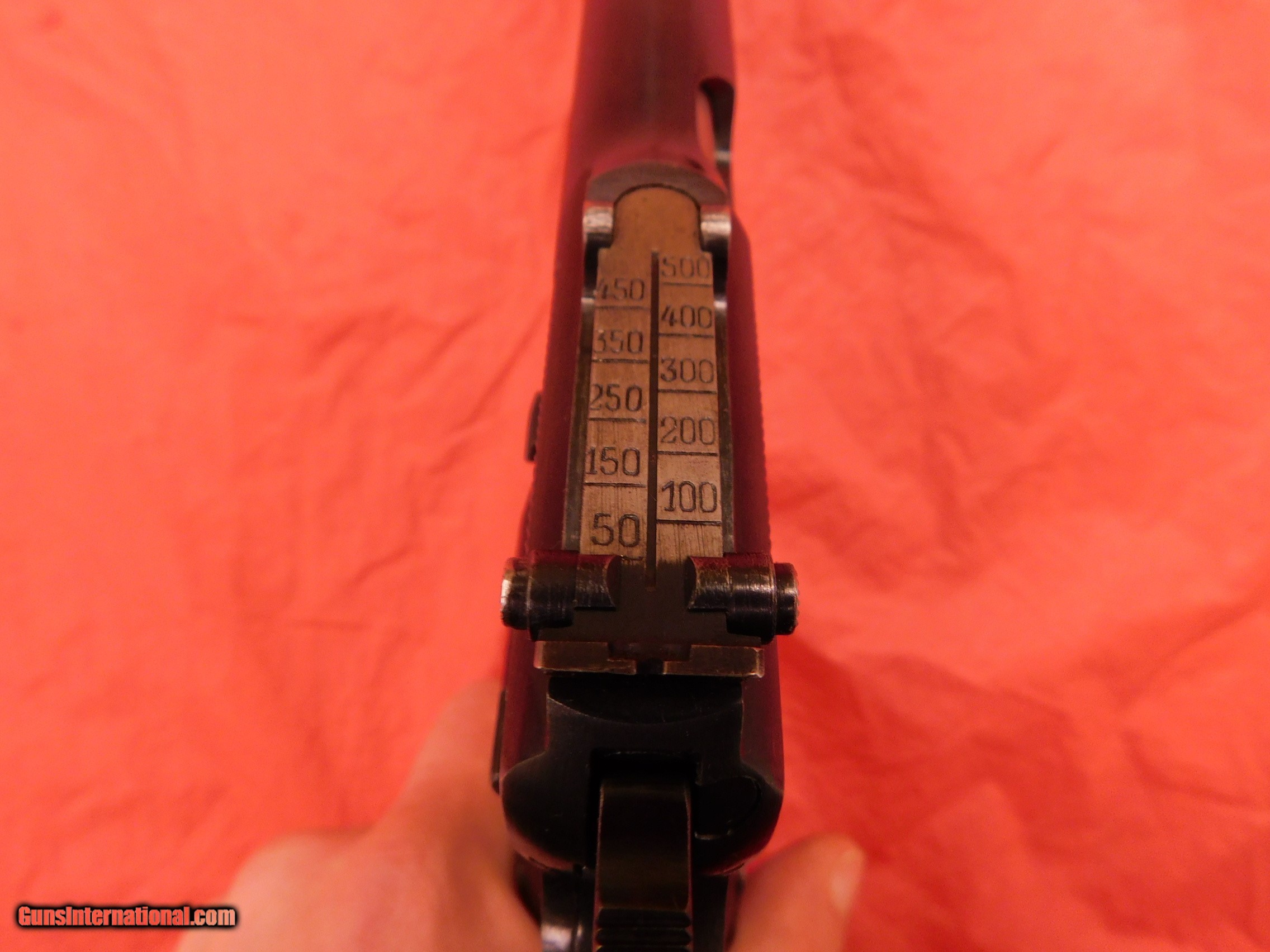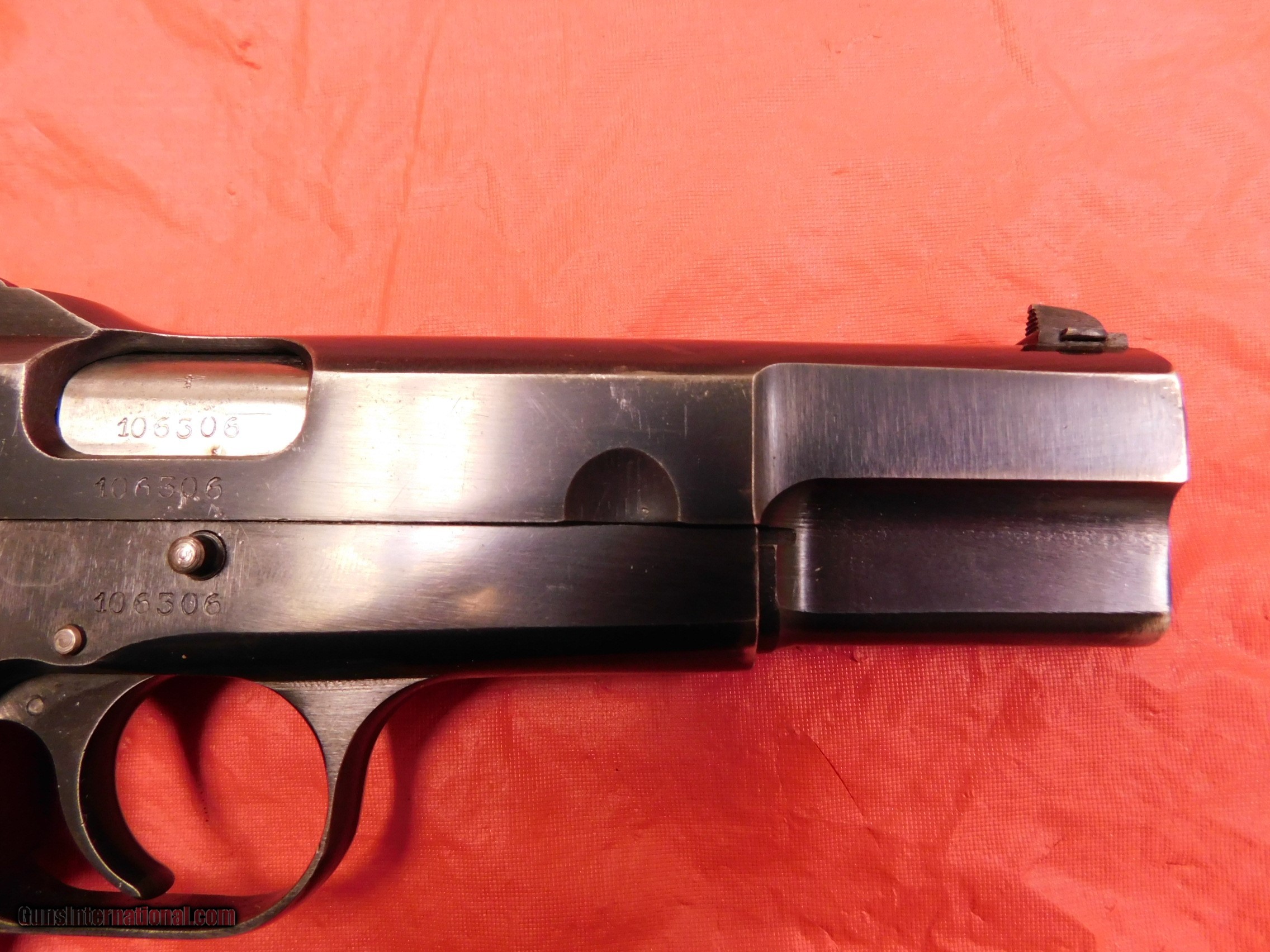 Description: Nazi tangent sight hi power pistol, WaA140 proofed, with holster. Gun in excellant condition about 98%, an example of an early occupation production 1942 WaA140 marked. Pistol is all matching with an excellant bore. Comes with an early holster marked CGN41(tough to find) made at Rohrbacher Lederfabrik. Both mags are marked 140. This model was issued largly to the Waffen SS. This is an excellant example of a rare GI bring back in great condition. Price $$2495 and $25 shipping and handling. SOLD Manufacturer: Fabrique Nationale Model: Hi Power Serial Number: 106306 Caliber Info: 9mm |