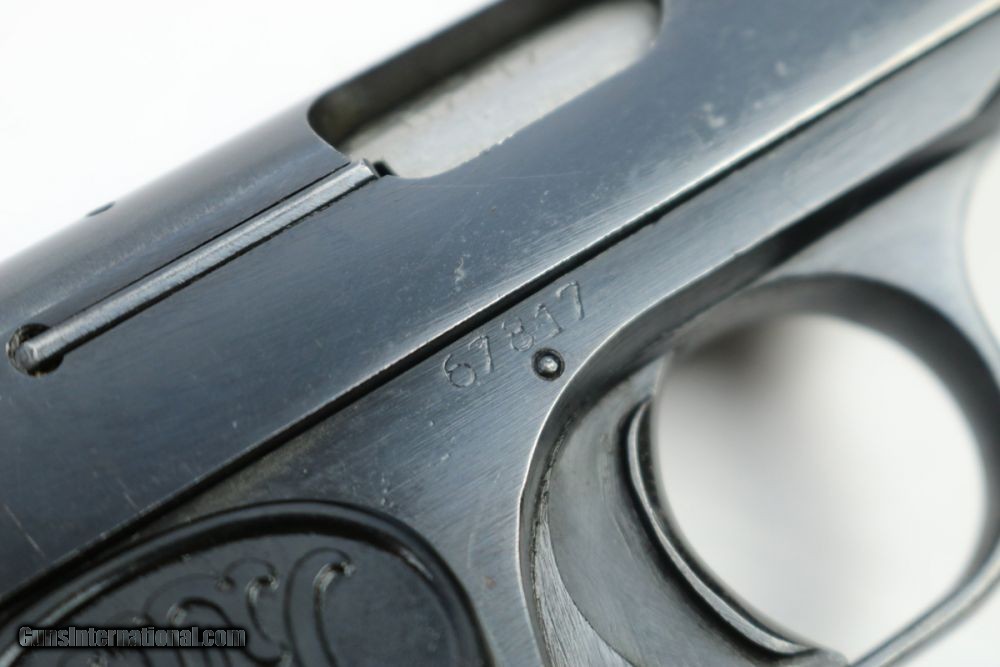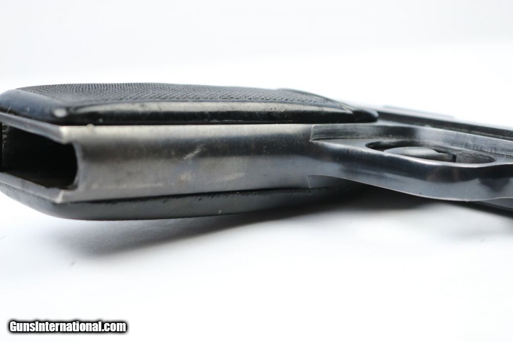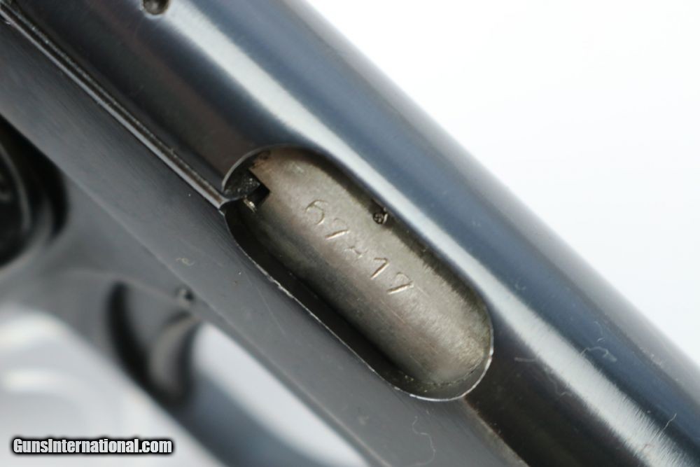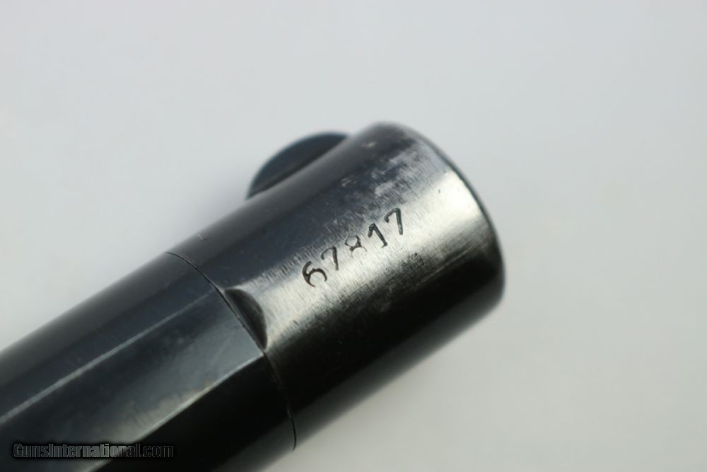 Description: This is an original WW2 production, 3rd variation FN model 1922 pistol, complete with two magazines and a holster. The gun is waffen WaA140 proof stamped on the frame and slide, and is all matching serial numbered except for on the magazine (not numbered). The pistol is in about 92% original condition with wear on the muzzle and slide, but this is only bluing loss. There's no rust or pitting. The front and back straps have brown patina and thinning of the finish. The bore is in minty condition. Comes with a "HK" stamped krieghoff holster. Guaranteed all original and fully functional. SOLD Curio/Relic: Yes Manufacturer: FN Model: Model 1922 Serial Number: 67817 Caliber Info: 7.65mm Bore: 10/10 Condition: 92% Manufacture Date: 1943-44 |