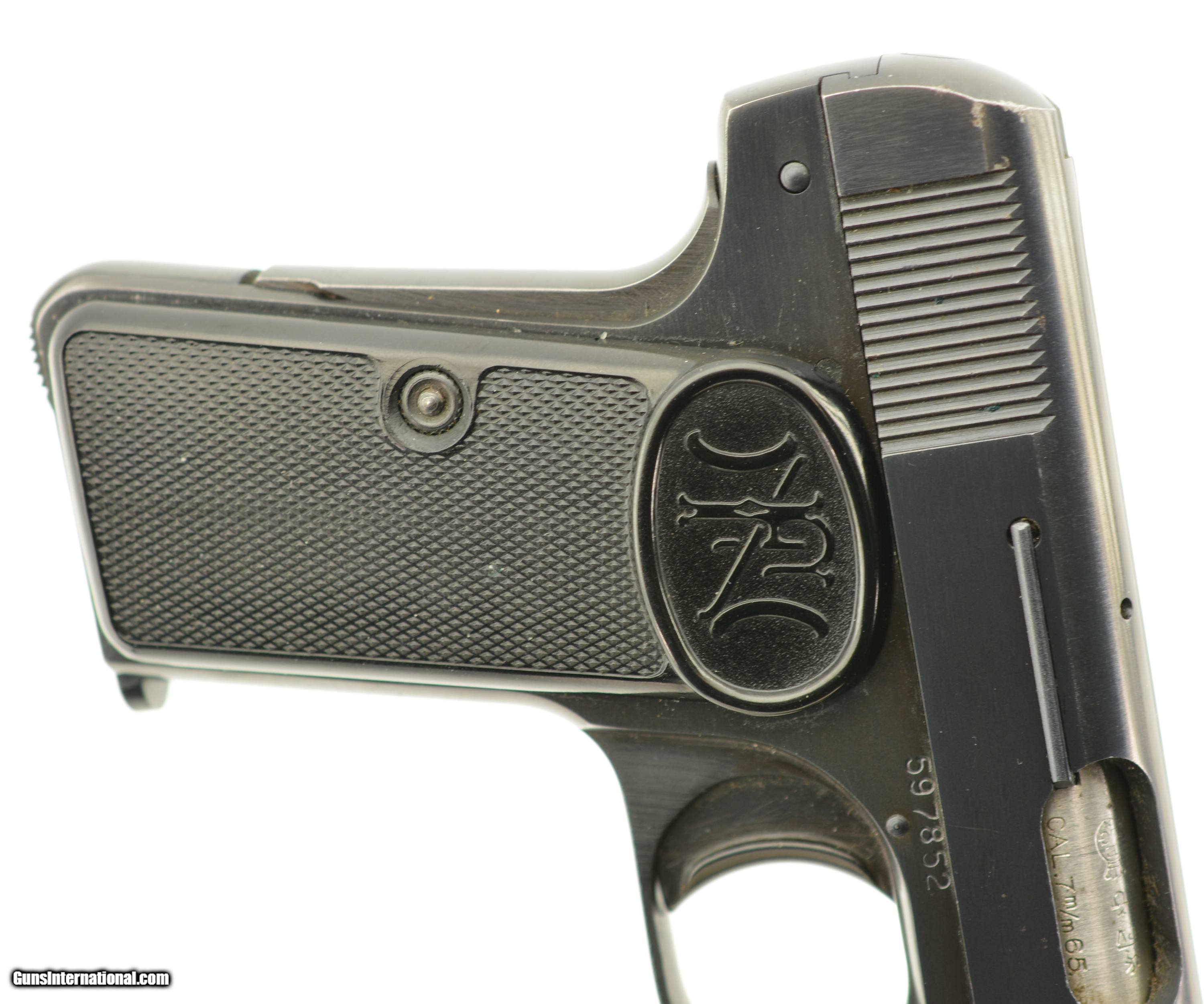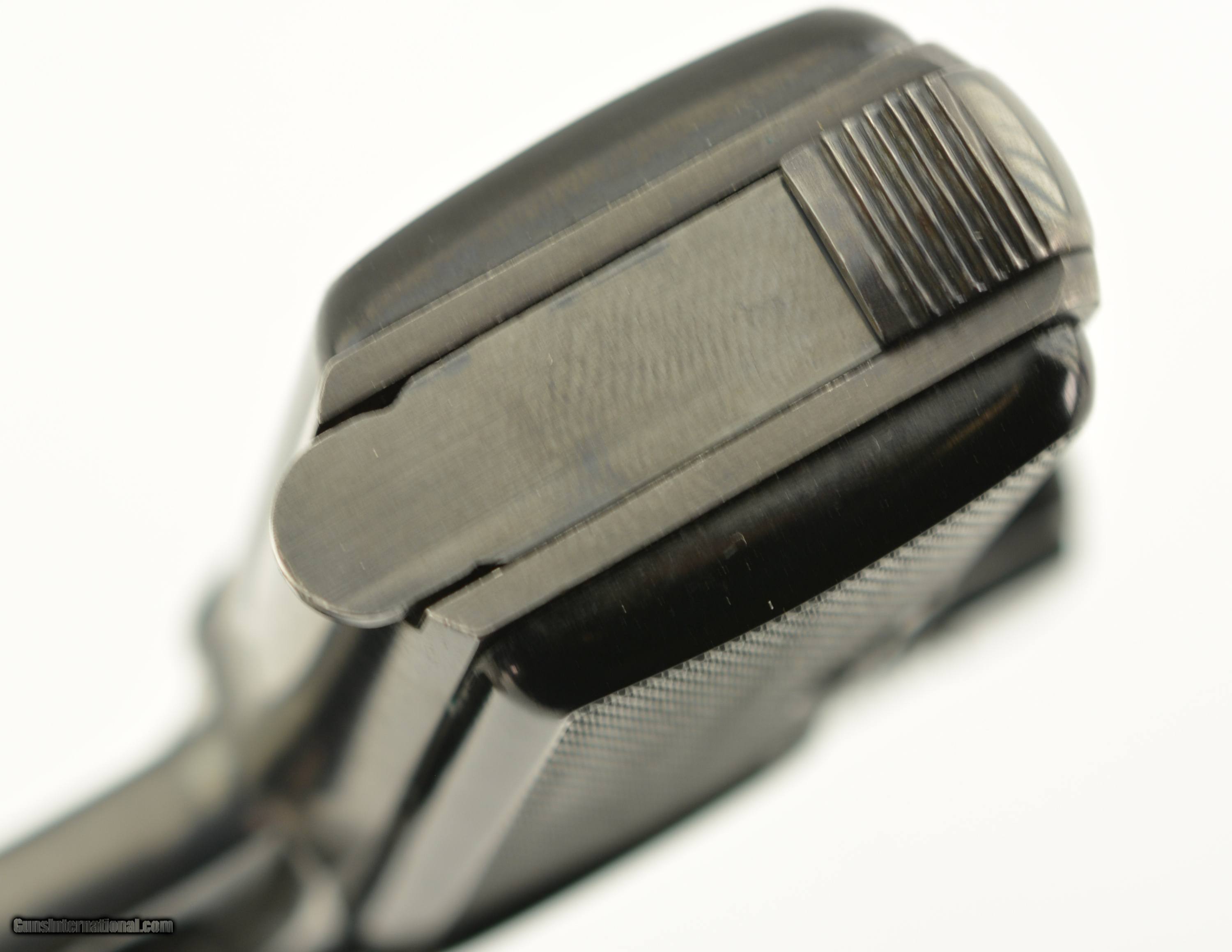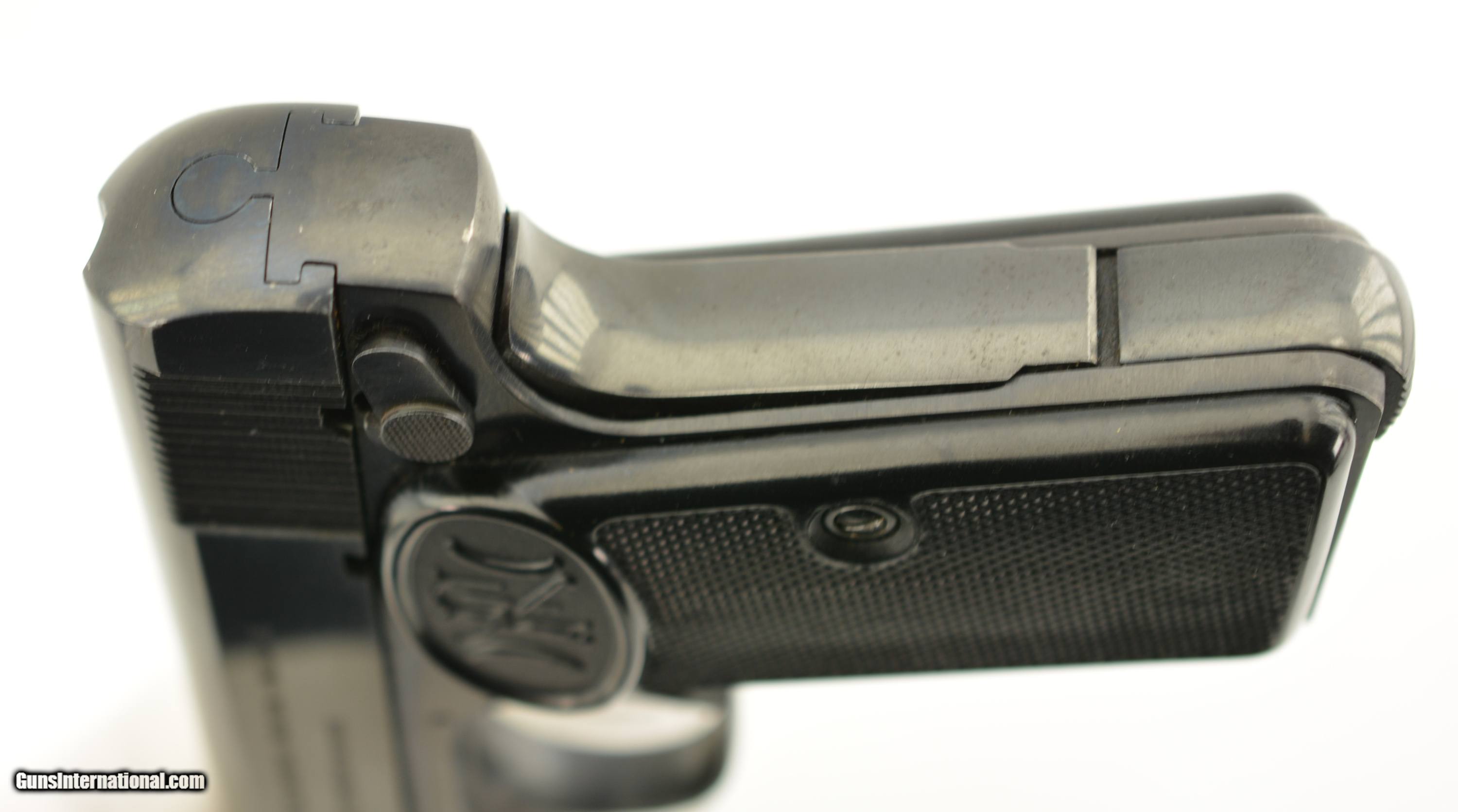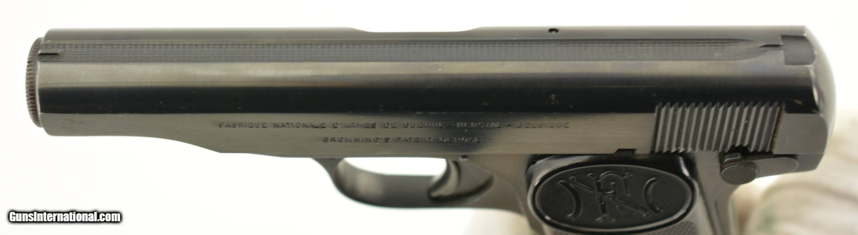 Description: Serial #597852, 7.65mm (.32 ACP), 3 1/4" barrel with an excellent, bright bore. This is a ca. 1960, Belgian-made pistol with matching numbers that retains 97-98% of the original blue finish that has silvered very slightly along some of the high and exposed edges. All of the markings and Liege proofs are crisp and clear, including the small "Akah" (Albrecht Kind GmbH) retailer stamp on the left side of the trigger guard bow. The checkered black plastic "FN" grips are likewise in excellent shape, with little wear or flattening of the points, and two magazines are included (one early FN-marked; and one later production FN-marked). This is an excellent example of a desirable Browning-designed pistol, with a scarce German retailer’s marking. FFL or C&R SOLD Manufacturer: FN Model: 1910 Serial Number: 597852 Caliber Info: .32 Gauge Info: .32 |