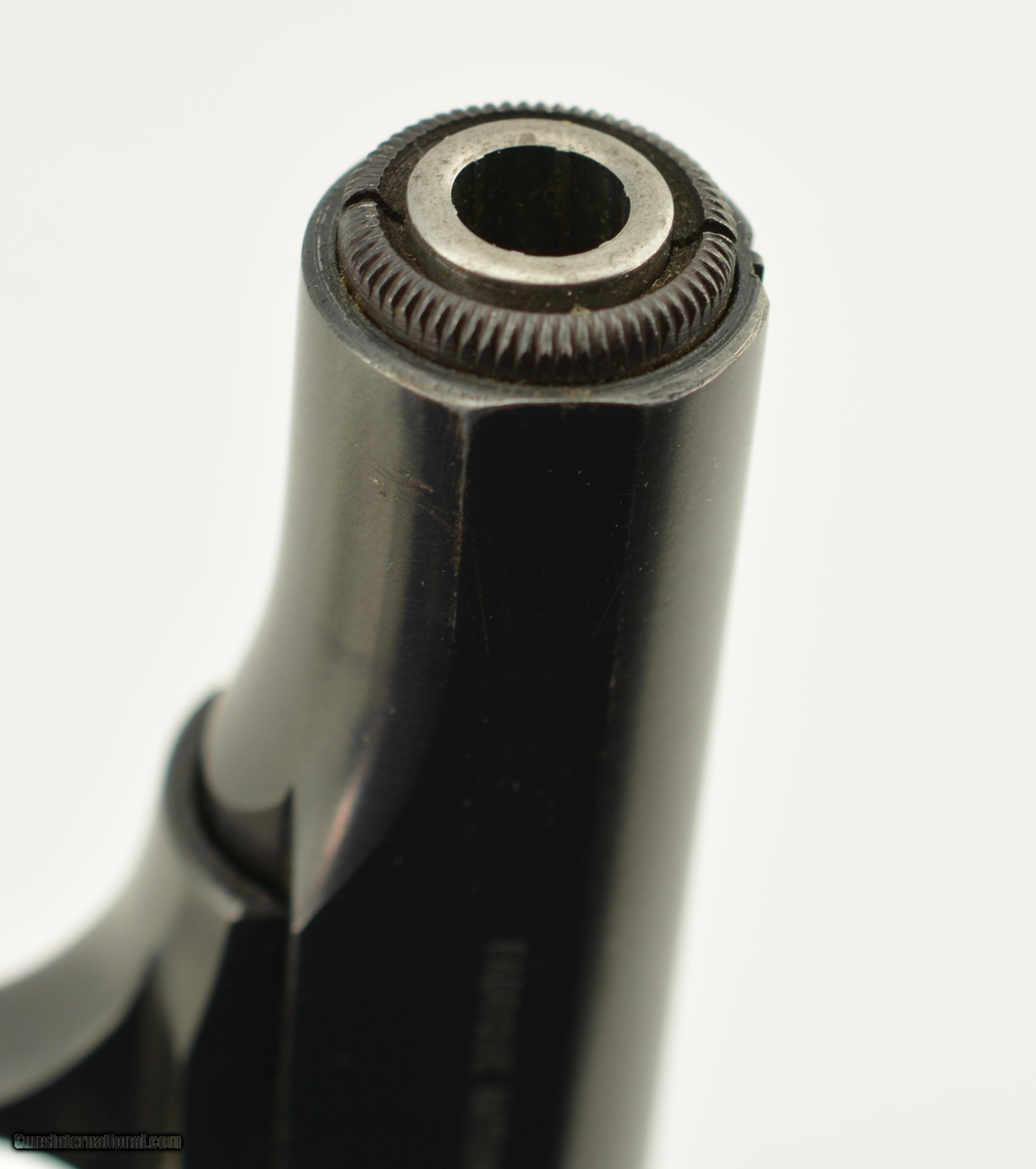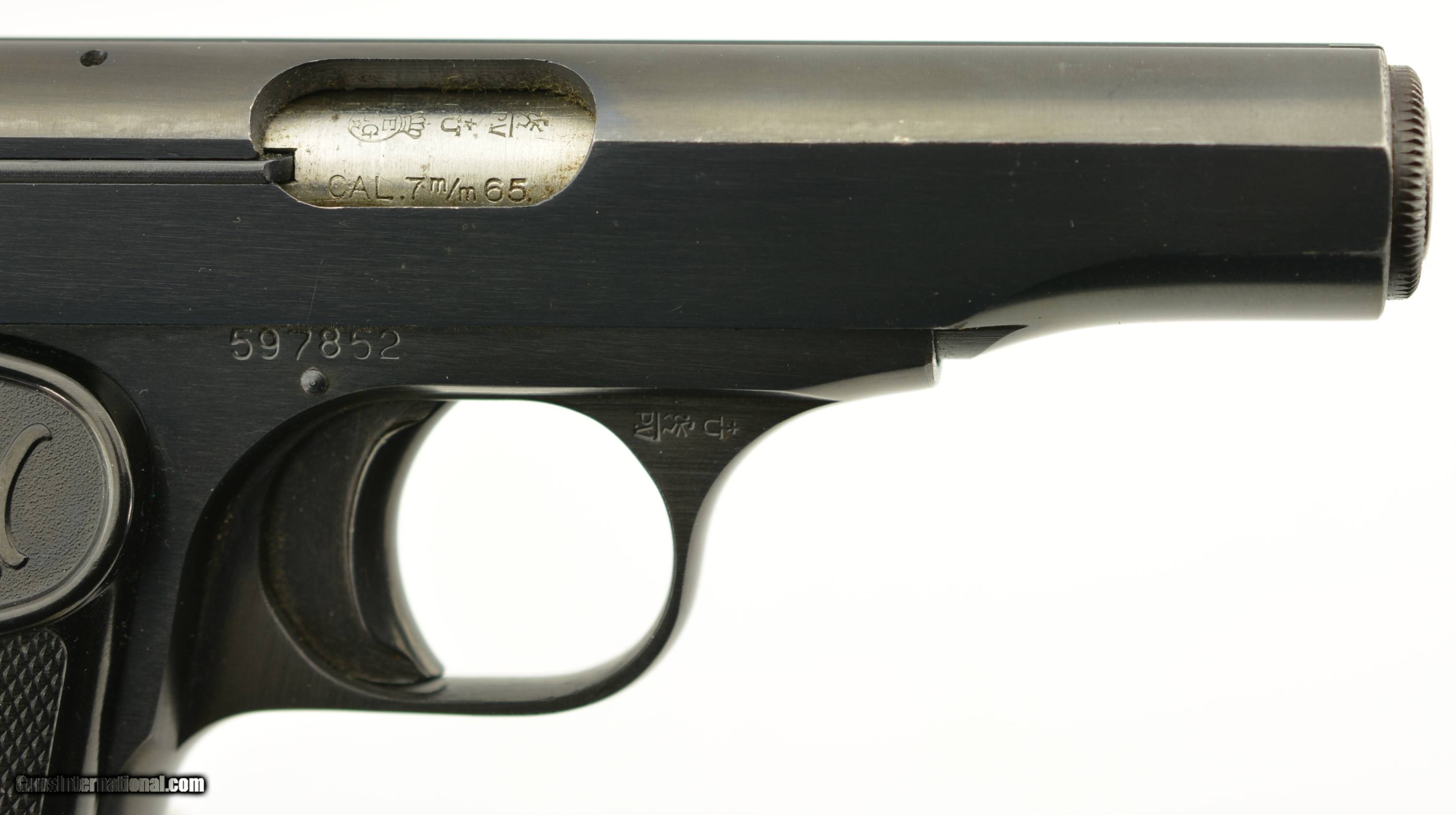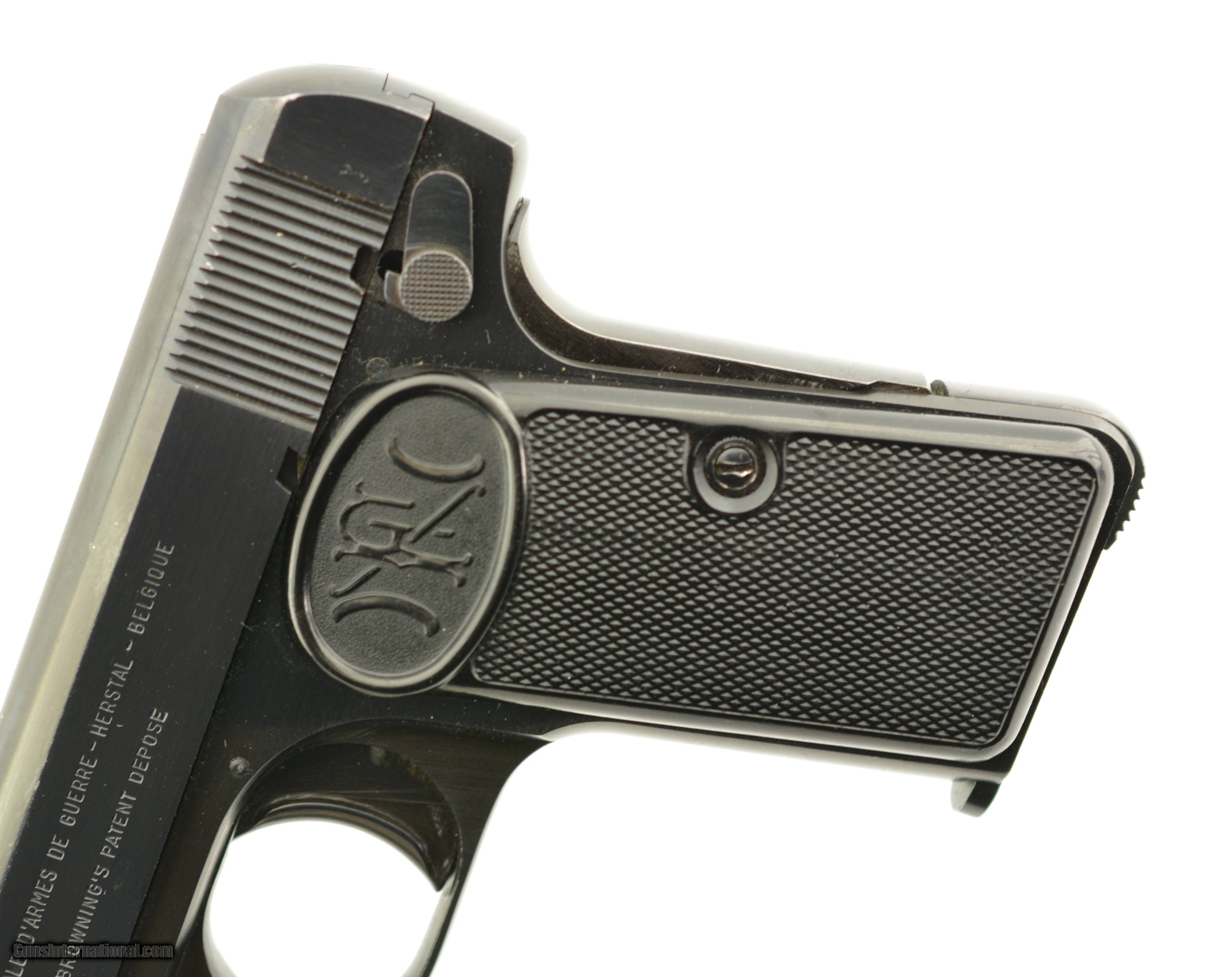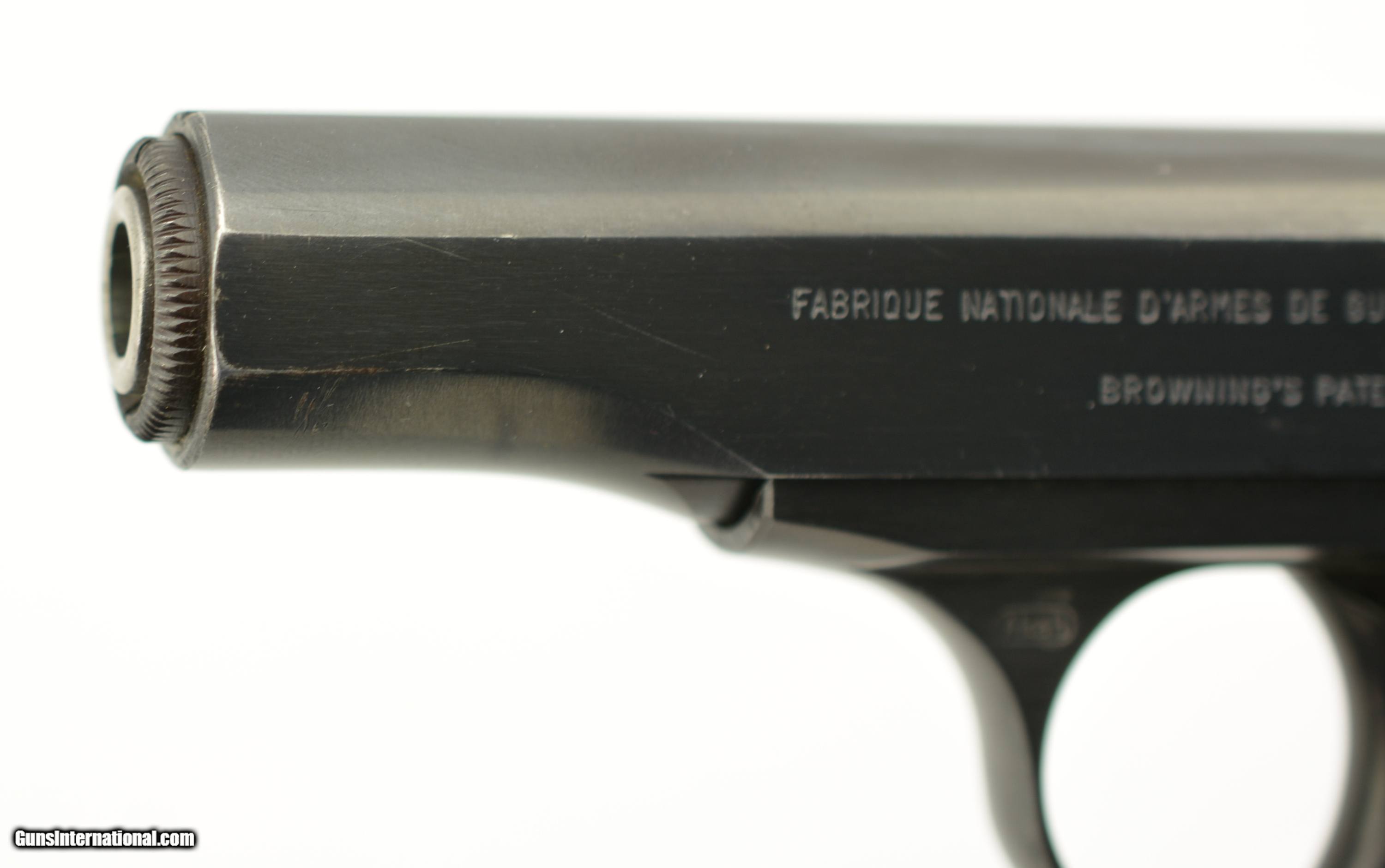 Description: Serial #597852, 7.65mm (.32 ACP), 3 1/4" barrel with an excellent, bright bore. This is a ca. 1960, Belgian-made pistol with matching numbers that retains 97-98% of the original blue finish that has silvered very slightly along some of the high and exposed edges. All of the markings and Liege proofs are crisp and clear, including the small "Akah" (Albrecht Kind GmbH) retailer stamp on the left side of the trigger guard bow. The checkered black plastic "FN" grips are likewise in excellent shape, with little wear or flattening of the points, and two magazines are included (one early FN-marked; and one later production FN-marked). This is an excellent example of a desirable Browning-designed pistol, with a scarce German retailer’s marking. FFL or C&R SOLD Manufacturer: FN Model: 1910 Serial Number: 597852 Caliber Info: .32 Gauge Info: .32 |