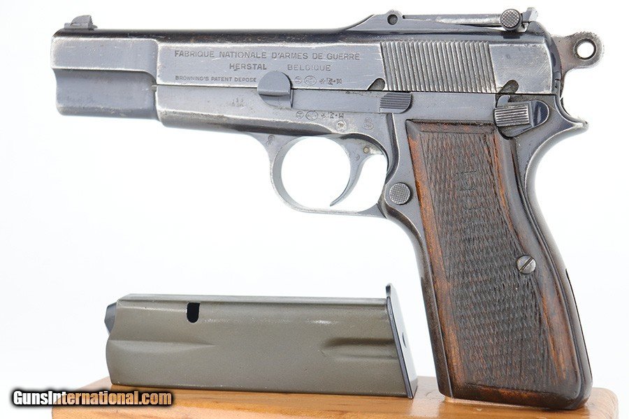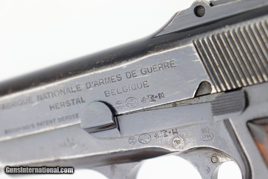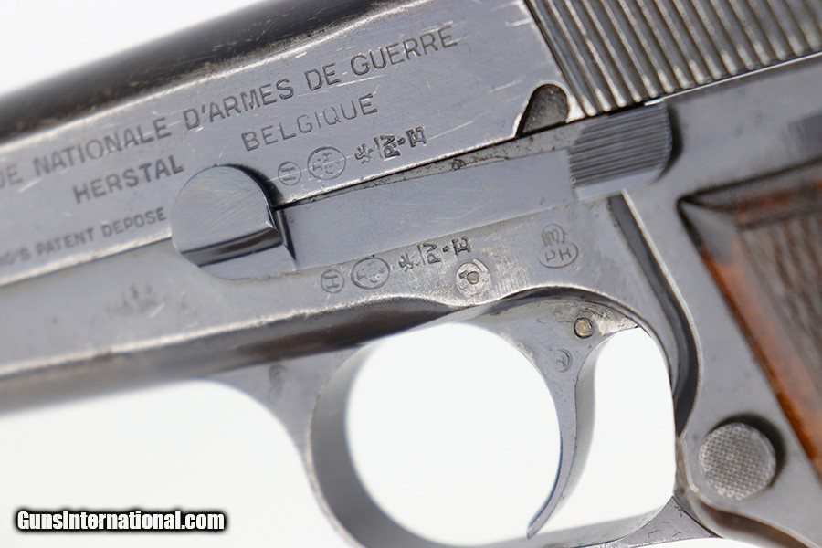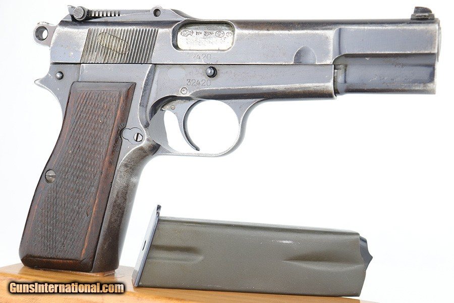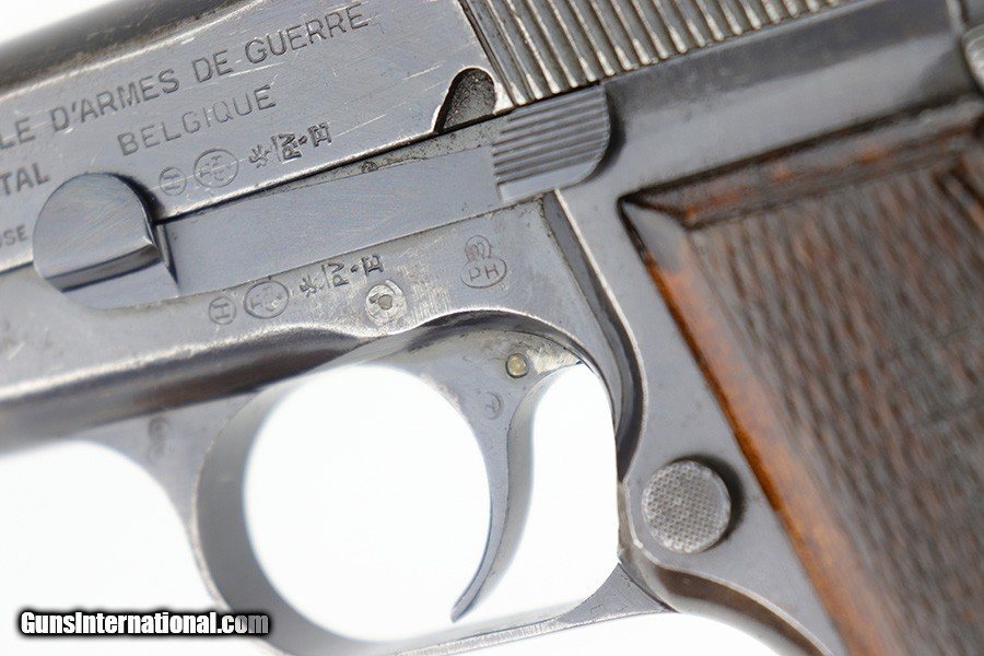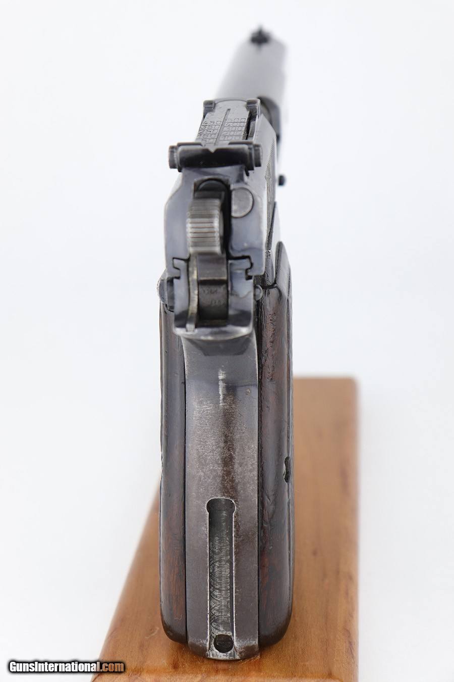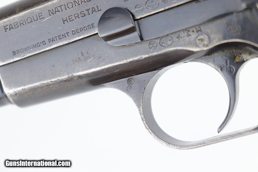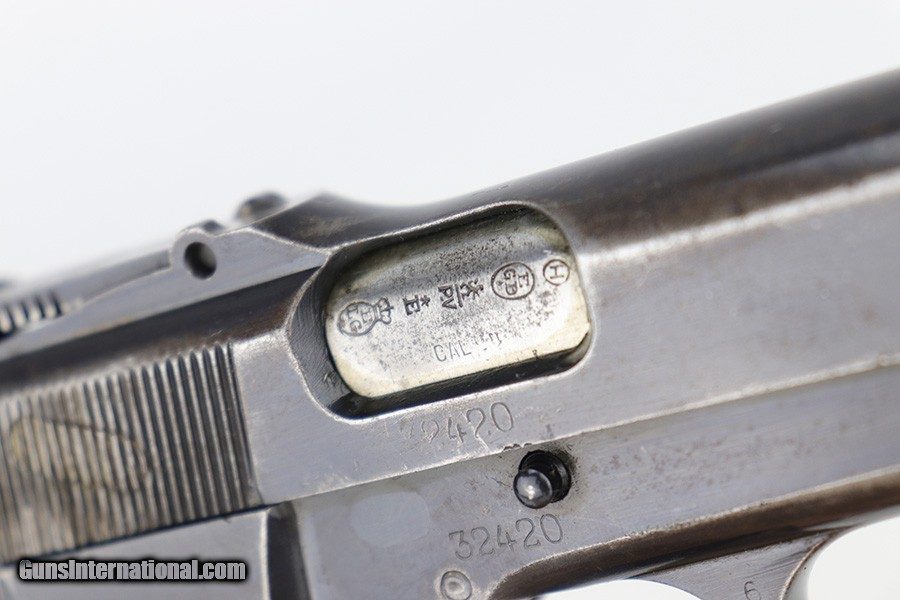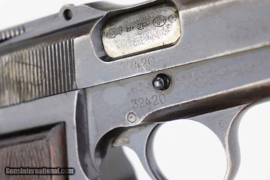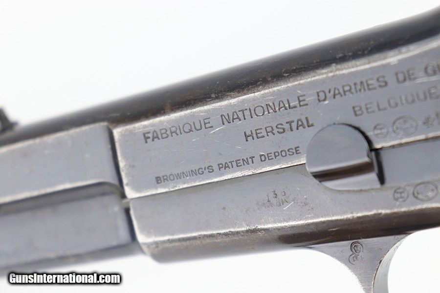 Description: This is a prewar FN Browning High Power with tangent rear sight, slotted frame and a stock/holster combo. The pistol is matching with original blue that rates at about 70%. There's finish loss on most of the high edges, and pronounced wear/patina on the front strap. Early Belgian proofs throughout, but oddly there is a '135 / WaA' stamp on the frame that we haven't seen before. It is presumably not a real waffenamt, but also a strange way to possibly fake one. Proper prewar grips with painted red backs. The grips don't have any cracks but it does appear some initials are scratched in the left panel. Bore has decent rifling but some frost and freckling throughout. The stock holster is unmarked but has seemingly the same initials scratched in as the left grip does. It's otherwise unmarked, and the metal parts appear to be re-blued. SOLD Curio/Relic: Yes Handgun Caliber: 9x19mm Parabellum (9mm Luger, 9x19mm NATO) |