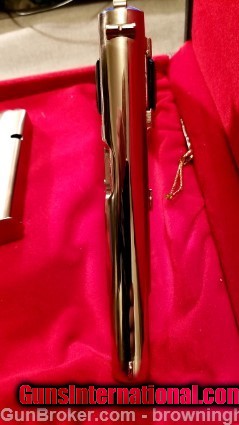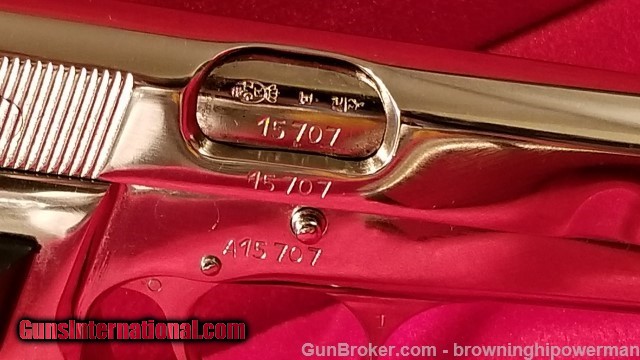 Description: Historic & ultra-rare early 1945 FN Herstal production (verified) post-occupation Belgium FN High Power "A" Prefix internal extractor thumbprint 9mm pistol in absolutely gorgeous and cosmetically flawless nickel with the original magazine and one additional period-correct 13 round magazine in identical nickel! Comes with an original 1950's excellent condition period- correct West German Federal Police black leather service holster and a new custom-made 1960's true reproduction Browning High Power Presentation case! This was one of the RARE "A" Prefix "no-magazine safety" FN Hi Powers in 9mm ONLY manufactured for a brief time period between the end of the Nazi FN factory occupation in late 1944 and the advent of full post-war High Power production for the Belgium armed forces and all the other post-war pre-NATO Western powers military contracts beginning in 1946 with the reintroduction of the pre-war magazine safety required by the Belgium armed forces. This is a UNIQUE opportunity for the astute collector to acquire a complete package of a truly rare and historic Hi Power for your collection! NO layaways or trades accepted. The frame, slide and barrel are 100% "NUMBERS MATCHING"! I offer the buyer the option of purchasing a set of ivory or faux ivory matching grips, we can add those to your purchase. This is a true NUMBERS-MATCHING 1945 (Spring production)"A" PREFIX FN HI POWER- slide, barrel, etc. The pictures don't completely convey its cosmetic awesome brilliance in 2-dimensional image form. It's TRUE High Power"gun porn" for all you fanatical collectors, own a 100% functional piece of firearms history made in the immediate aftermath of the final German V-2 rocket barrage on the FN Herstal complex (they hit Antwerp too), these "A" Prefix High Power's were made to Commercial standards, with a combination of pre-war parts honed and polished where the absolute mechanical quality is like a Swiss bank vault from the 1930's! Shipping is from my local FFL to your designated FFL. Flat rate of $60.00. No International sales. SOLD Curio/Relic: Yes Manufacturer: Fabrique Nationale Model: High Power Serial Number: A15707 Caliber Info: 9mm Condition: EXCELLENT Metal Condition: EXCELLENT Bore Condition: EXCELLENT Action: Single Finish: Nickel Sights: Fixed Manufacture Date: 1945 Case: Black Browning Presentation Case |