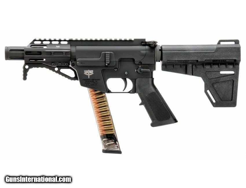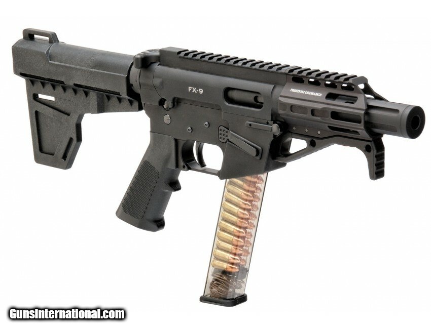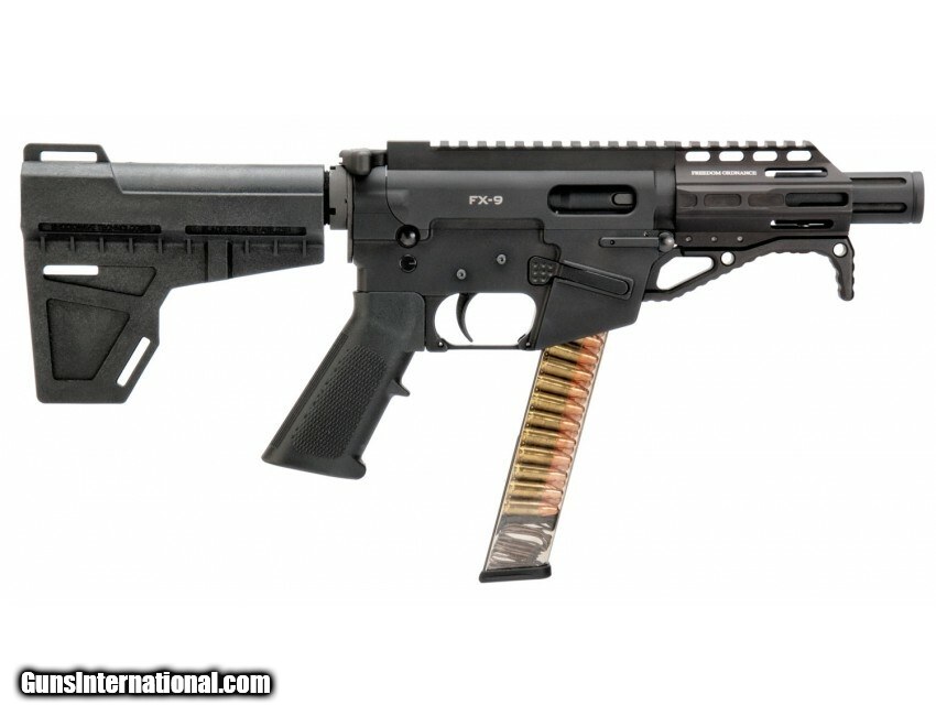 Description: Manufacturer: Freedom Ordnance Model: FX-9 SKU: FX9P4 Action: Semi-Auto Caliber: 9mm Capacity: 31 Rounds Barrel Length: 4.5" Nitride 4150 Chromoly Steel, Threaded 1/2x28 NEW- 3.5" Freedom M-Lok Free Float Handguard Weight: 4.45 lbs Overall Length: 18.5" The FX-9 pistol (Freedom Xtreme-9mm pistol) has a familiar set of operating controls for the avid AR-15 user, it accepts AR-15 stocks / braces and buffer tube assemblies, as well as most free float AR-15 rail assemblies. The FX-9 is machined from billet material, anodized type III aluminum components . Steel components are full hard nitride and nickle boron nitirded including the barrel, bolt, ejector, last round hold open, feed ramp and extractor for extended wear properties and corrosion resistance. The upper and lower receiver are more than 1.00" shorter than a standard AR-15 upper and lower receiver making it more compact and lighter than a standard mil-spec AR-15 design. Features: