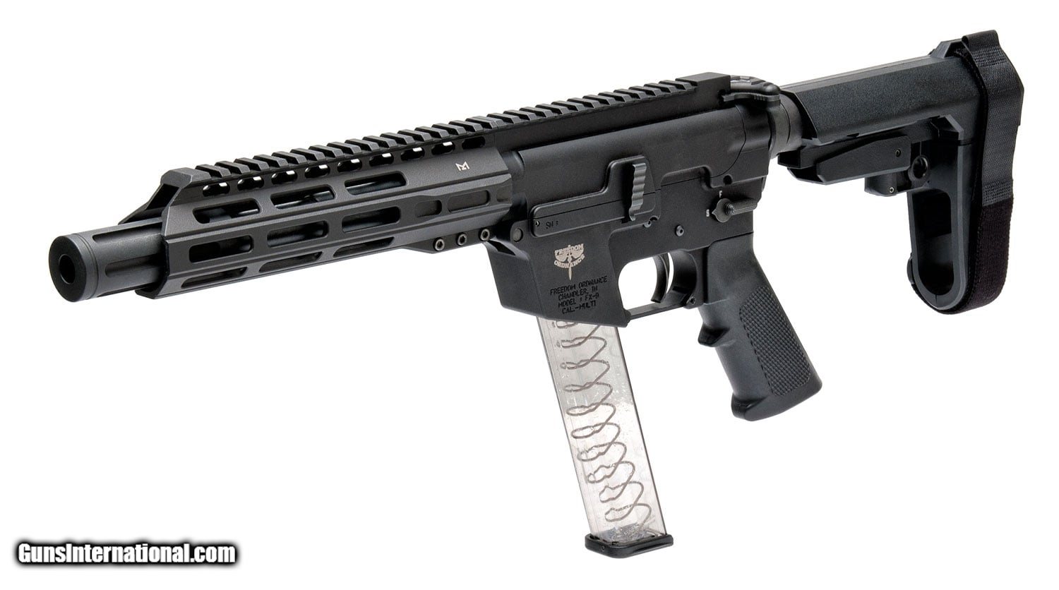Description: Guns Listing ID: 41288 The FX-9P8S pistol (Freedom Xtreme) has a familiar set of operating controls for the avid AR-15 user, it accepts AR-15 stocks and buffer tube assemblies, as well as most free-float AR-15 rail assemblies. It features a SB Tactical SBA3 pistol brace and 7.5\" M-Lok Ultra Slim rail. The FX-9P8S is machined from billet material, anodized type III aluminum components, and full hard nitride steel components including the barrel, bolt, ejector, last round hold open, feed ramp, and extractor for extended wear properties and corrosion resistance. The upper and lower receiver are more than 1\" shorter than a standard AR-15, making it more compact and lighter. The FX-9p8S uses standard, double-stack Glock-style 9mm magazines. SOLD Manufacturer: FREEDOM ORDNANCE Model: FX-9P8S Caliber Info: 9MM LUGER (9X19 PARA) Condition: new Barrels: 8 BARREL Finish: BLACK |