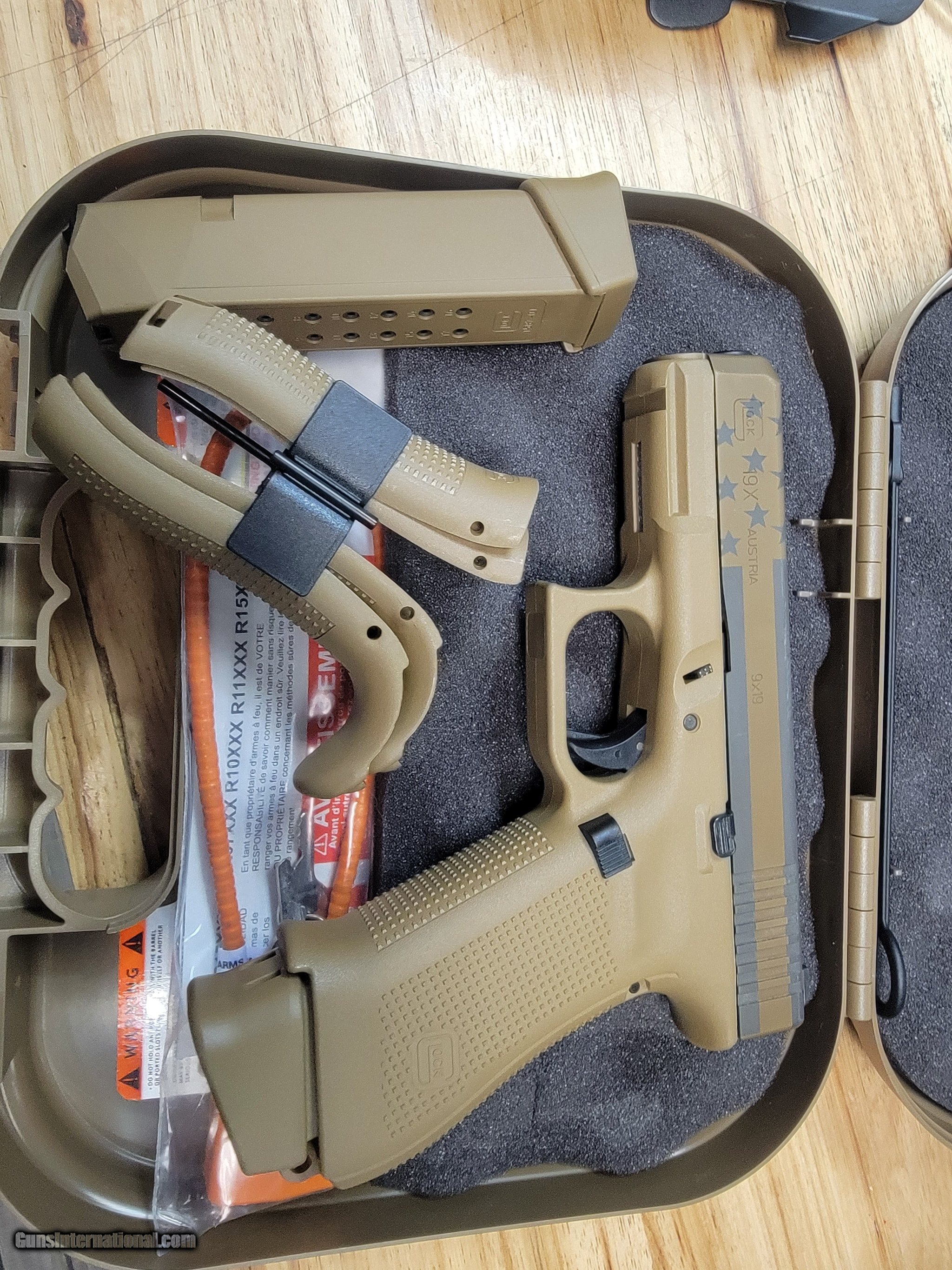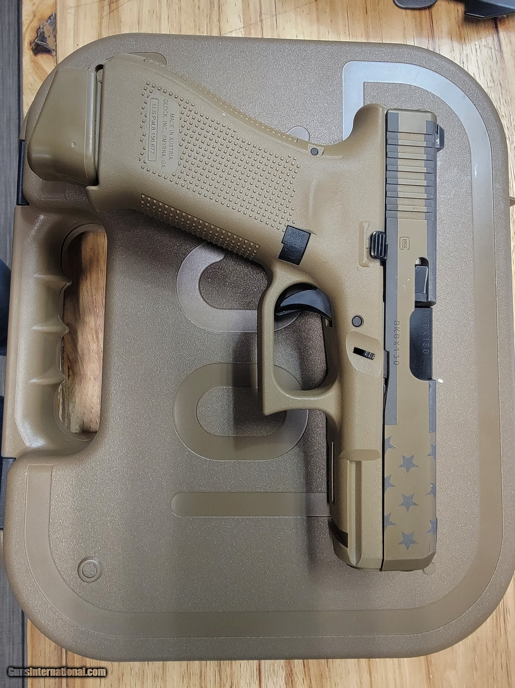 Description: Guns Listing ID: 698848 #3963 In Mint shape Davidson‚‚s Exclusive: American Flag Laser Etched Slide GLOCK, Inc. introduces their first ever “Crossover” pistol, the GLOCK 19X, which combines the best features of two of its most popular and most trusted field-tested platforms. The full-size frame and the compact slide have joined forces to produce the ideal pistol for all conditions and all situations. The G19X was developed for the military and is a practical everyday pistol that will do what you need it to do, when you need it to, every time, in every condition. That confidence now comes in a different color, with GLOCK‚‚s first-ever factory-colored slide, The GLOCK 19X‚‚s nPVD slide coating prevents corrosion, resists chemicals, and stands up against the elements. The pistol includes a standard 17-round magazine and two +2 magazines, along with a coyote-colored pistol case. The GLOCK 19X enjoys the same design improvements as the other new Gen5 pistols, making it innovative on all fronts, but it also features a number of firsts and is destined to absolutely be one of GLOCK‚‚s most popular offerings to date. Confidence now comes in the coyote color with the first-ever factory colored slide. The nPVD slide coating of the GLOCK 19X prevents corrosion, resists chemicals, and stands up against the elements. Additional design features of the G19X include the GLOCK Marksman Barrel (GMB) with enhanced polygonal rifling and an improved barrel crown for increased accuracy, ambidextrous slide stop levers and no finger grooves for better versatility, Glock night sights, and a lanyard loop for retention. The pistol includes a standard 17-round magazine and two 17+2-round extended magazines along with a coyote-colored pistol case. The aggregate effect of all the G19X design enhancements gives any user the assurance to succeed and survive in all situations. A perfect “Crossover to Confiden SOLD Manufacturer: GLOCK Model: 19 x G19x with night sights FDE Caliber Info: 9MM Condition: Used - Non-Certified Barrels: 4.02 BARREL Finish: TAN |