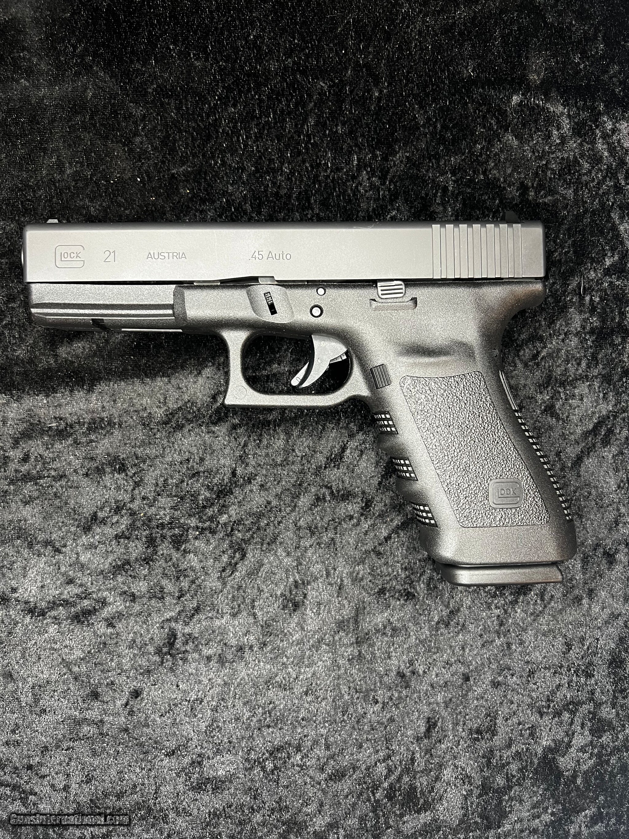 Description: Guns Listing ID: 1108661 The “big bore” 45 Auto caliber has since long been regarded with a special reverence. Many shooters feel a special relationship with this timeless caliber. The GLOCK 21SF presents everything one would expect of a 45 Auto pistol. The SF design reduces the circumference of the receiver, offering increased ease-of-use and control, especially to shooters with smaller hands. Comes with 2 10-round mags, case and loader. SOLD Manufacturer: GLOCK Model: Glock 21 SF Caliber Info: .45 ACP Condition: Used - Non-Certified Barrels: 5 BARREL Finish: BLACK |