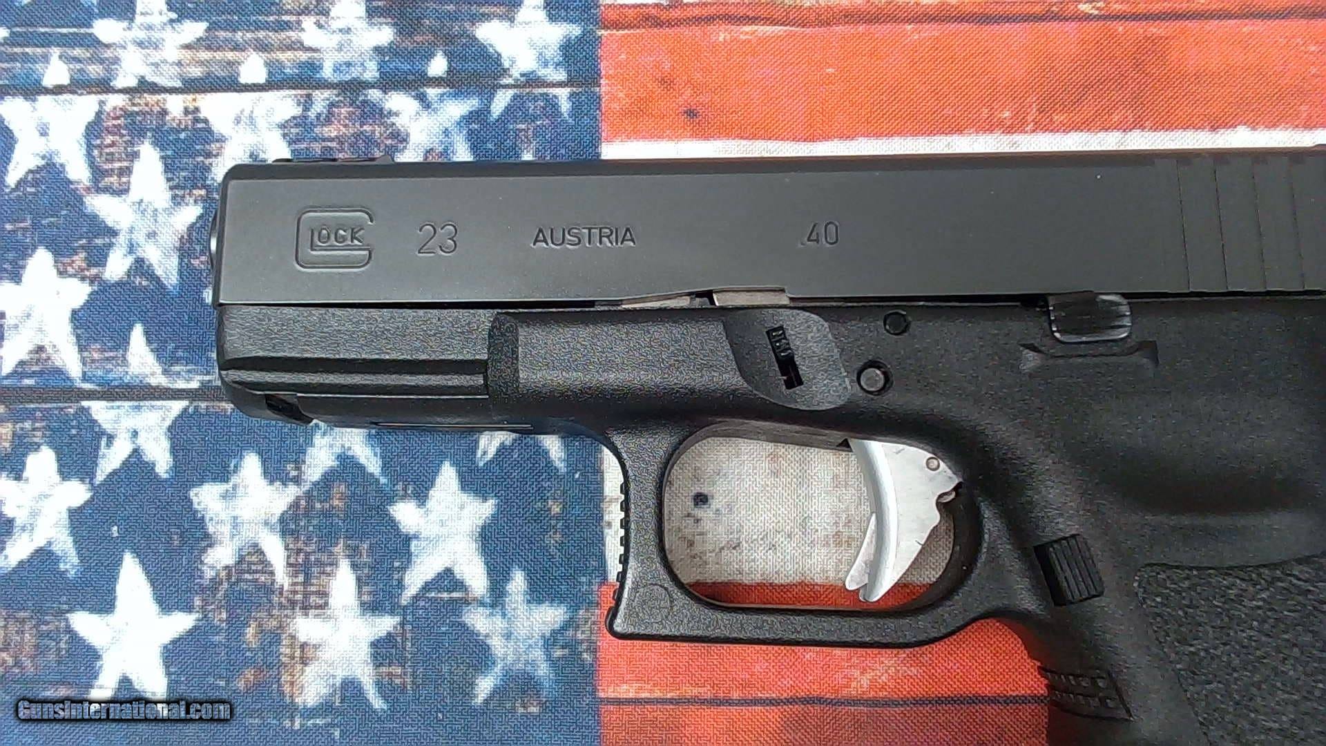 Description: Guns Listing ID: 709099 This is an Glock is in excellent condition. It has an upgraded trigger (no brand visible) and upgraded \"HiViz\" front sight. The rear sight is a standard Glock - white outlined sight, however, the \"white\" edging has been removed. Firaem comes with Glock hard case and one magazine. No other accessories included. Glock 23, GEN 3, Semi-automatic, Striker Fired, Polymer Framed Pistol, Compact, 40 S&W, 4.01\" Barrel, Matte Finish, Black, Fixed Sights, 13Rounds, 1 Magazines SOLD Manufacturer: GLOCK Model: G23 Caliber Info: .40 S&W Condition: Used - Non-Certified Barrels: 4 BARREL |