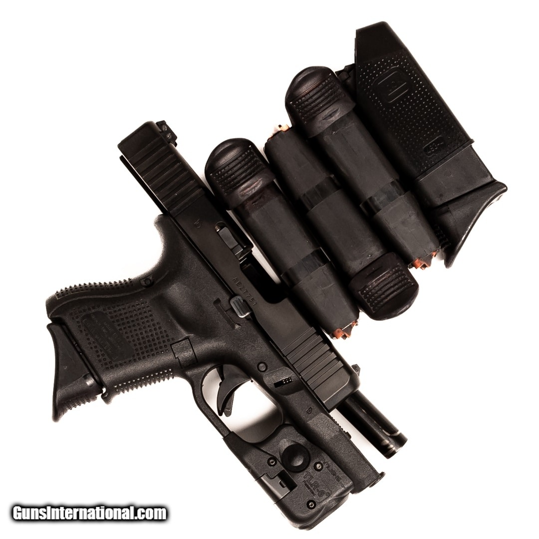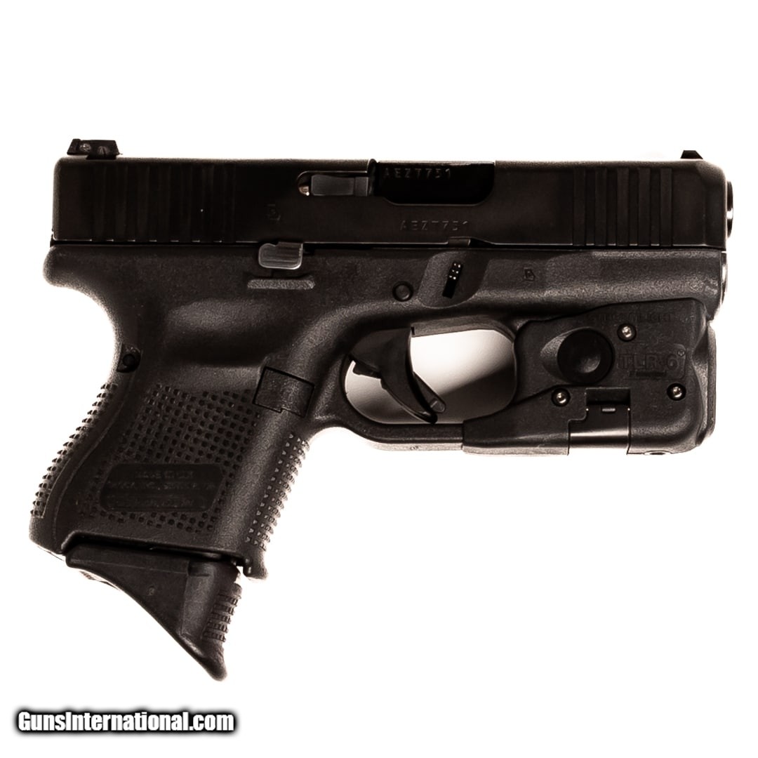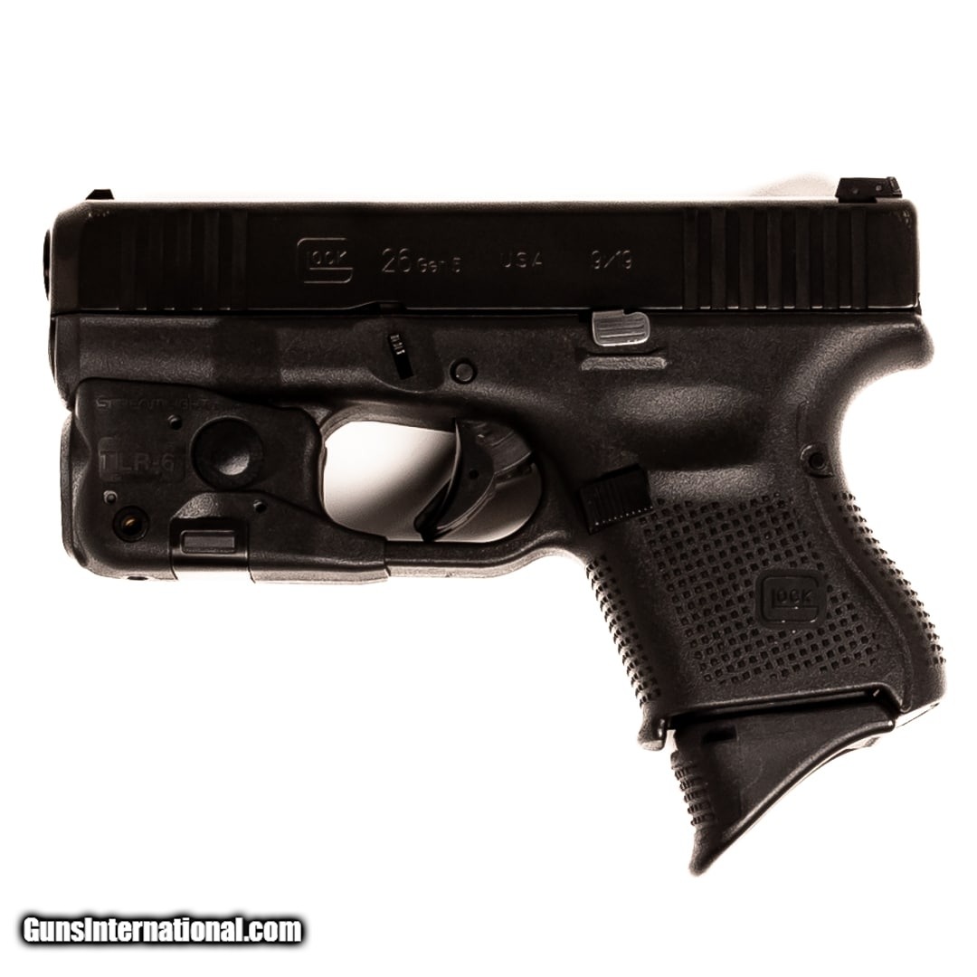 Description: Guns Listing ID: 815546 Also known as the \"Baby Glock,\" the Glock 26 is a sub-compact, semi-automatic handgun that‚‚s highly accurate and dependable. It has remained one of the most popular carry options since its initial introduction. In addition to offering Glock‚‚s signature polymer frame, features include a stippled grip, flared magwell, and ambidextrous slide stop levers. This G26 Gen 5 features a Streamlight TLR-6 laser/light combo. Purchase includes the original case, manual, five 10-round magazines with grip extension, and a loader. Get the best bang for your buck when you get a Certified Used Firearm . When you see the Certified Used stamp on any of our firearms, you can be confident that you’re getting exactly what you want – a gun only in very good to excellent condition and held to the highest quality standard. All Certified Used Guns come with a ‘no questions asked’ return policy . PLUS, ALL CERTIFIED USED GUNS SHIP FRE SOLD Manufacturer: GLOCK Model: 26 GEN5 Caliber Info: 9MM LUGER (9X19 PARA) Condition: Used - Certified Barrels: 3.4 BARREL Finish: BLACK |