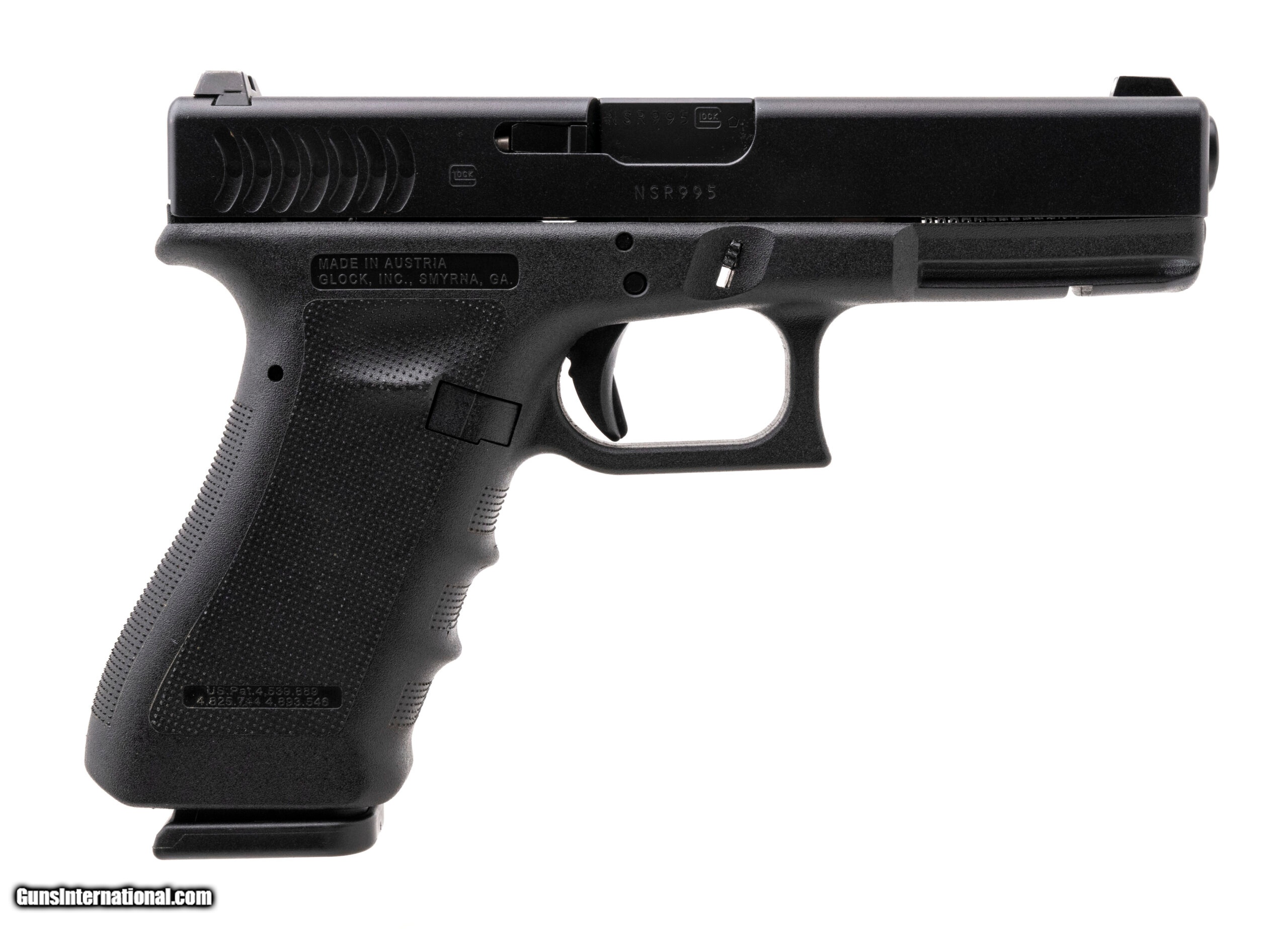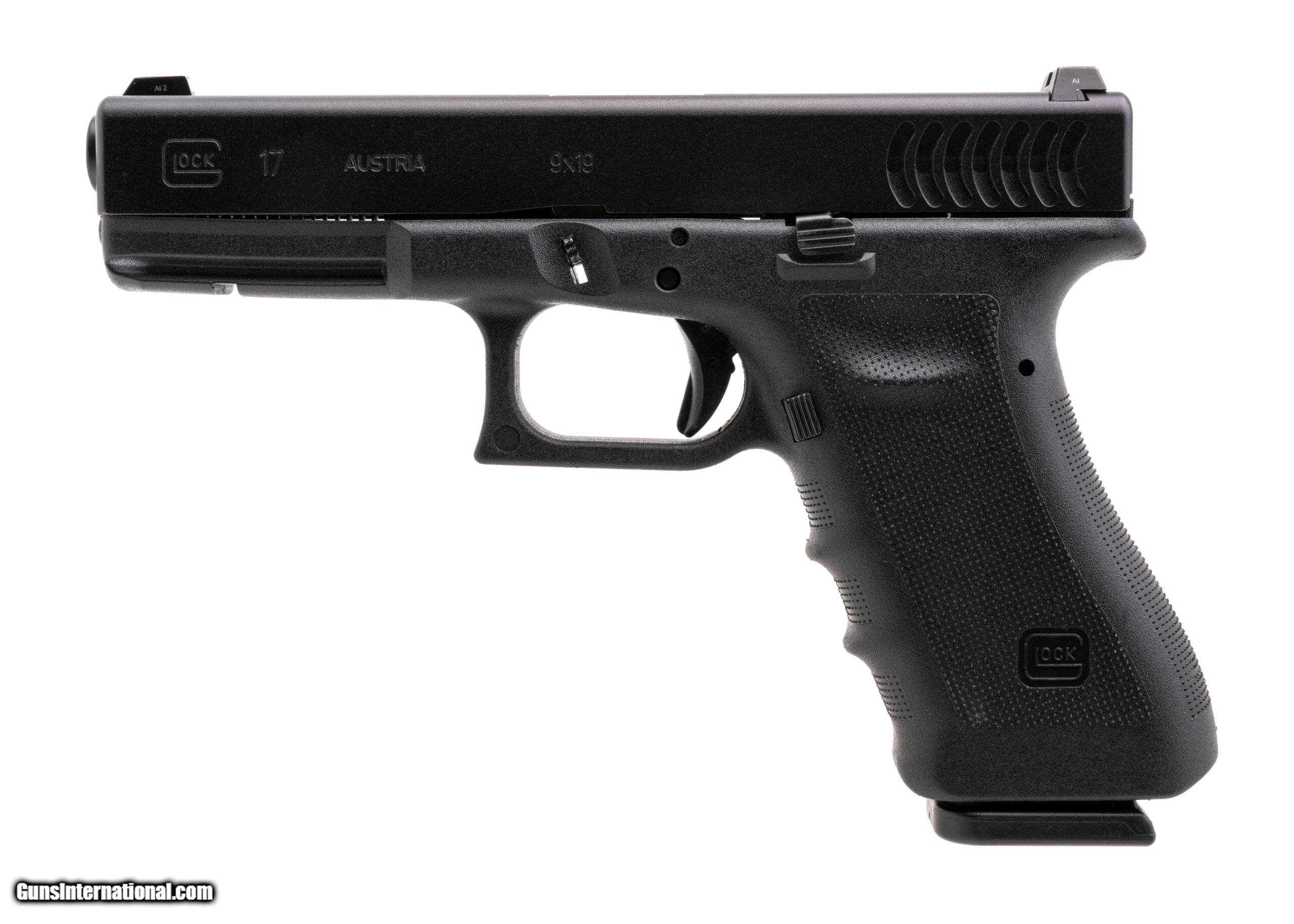 Description: "SN: NSR995. Modern production, 9mm with a 4.49"" barrel. Bore is bright with strong rifling. Scarce model 17 with fish gill serrations and night sights. Overall condition is excellent. SOLD |