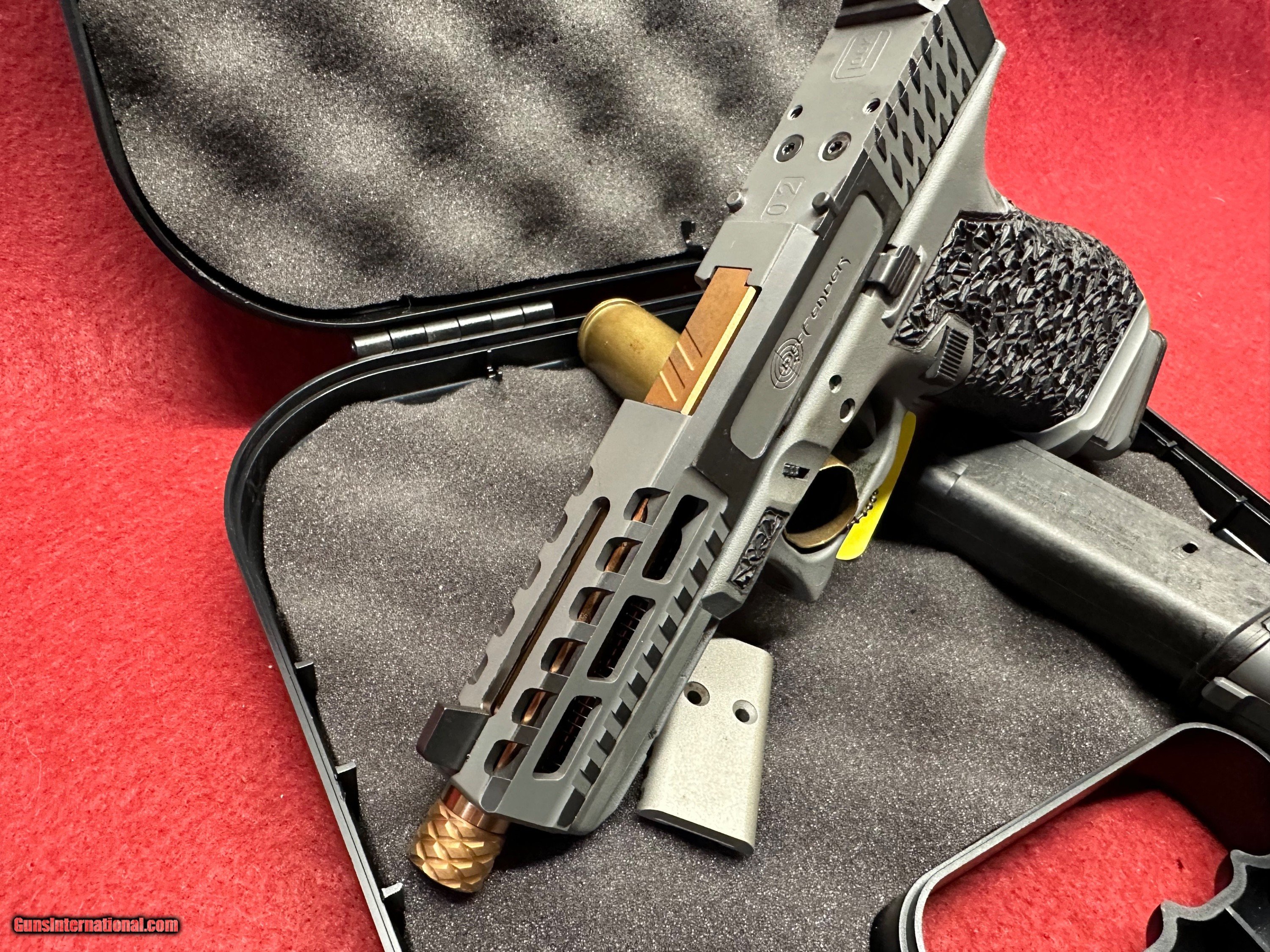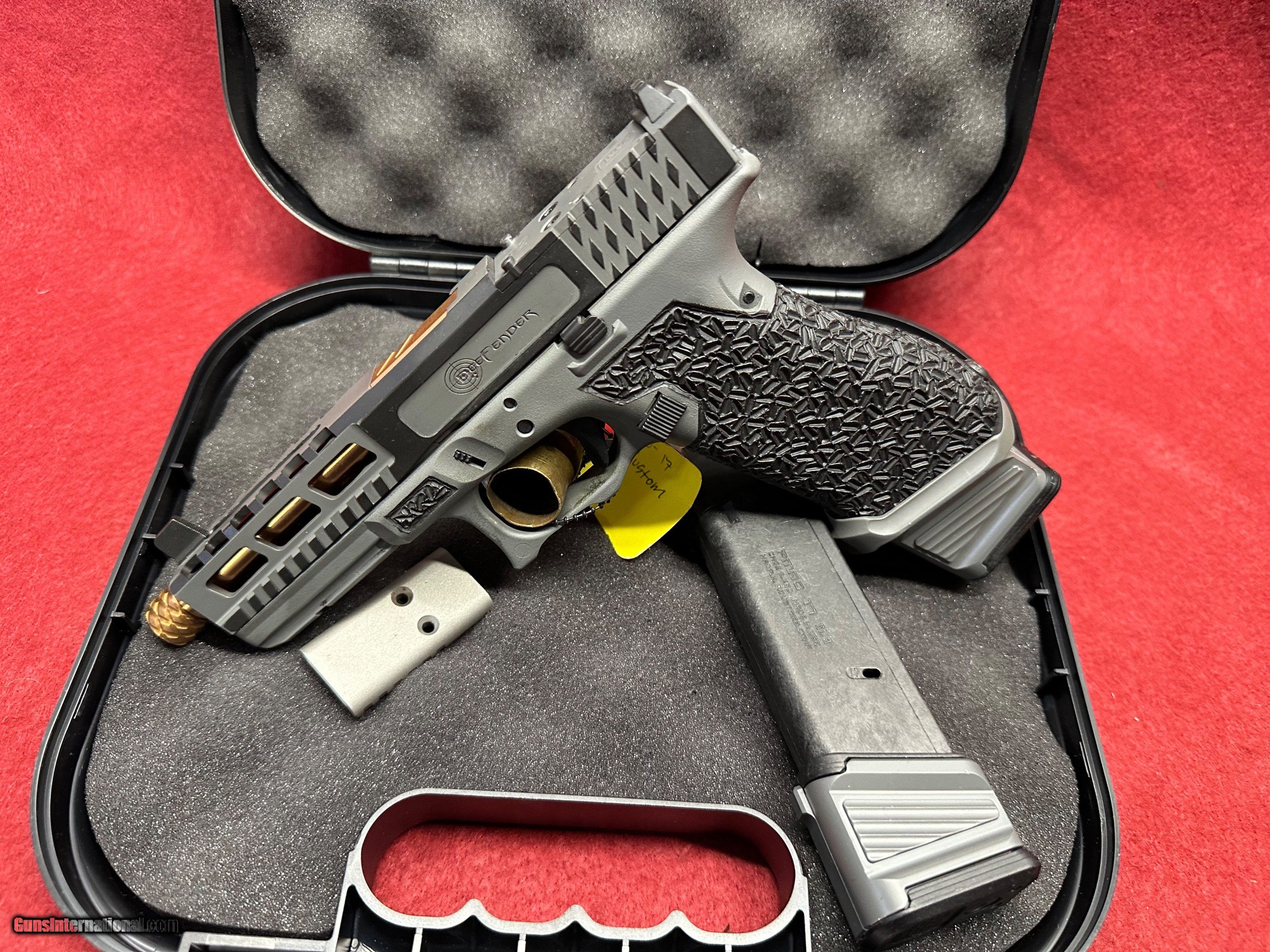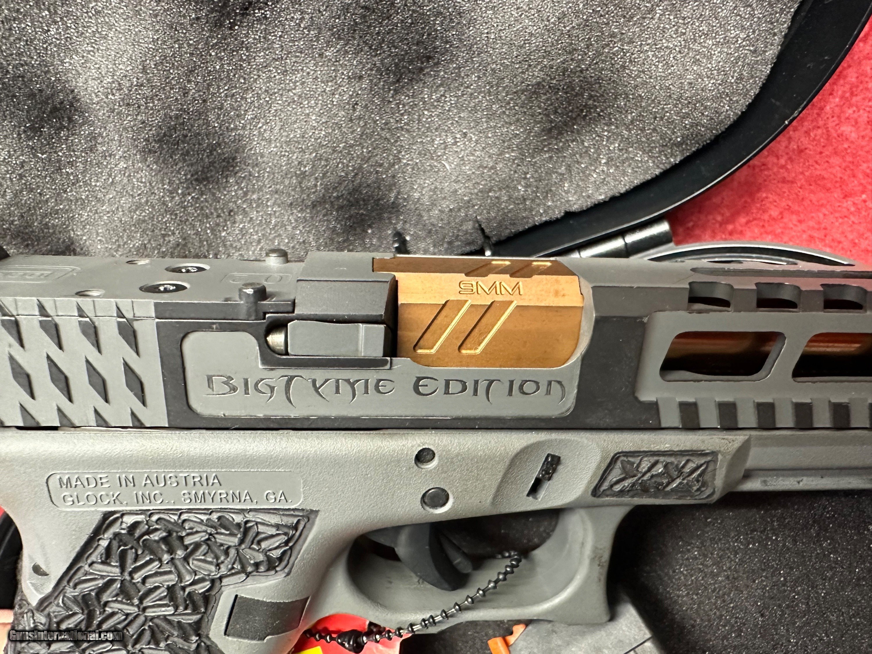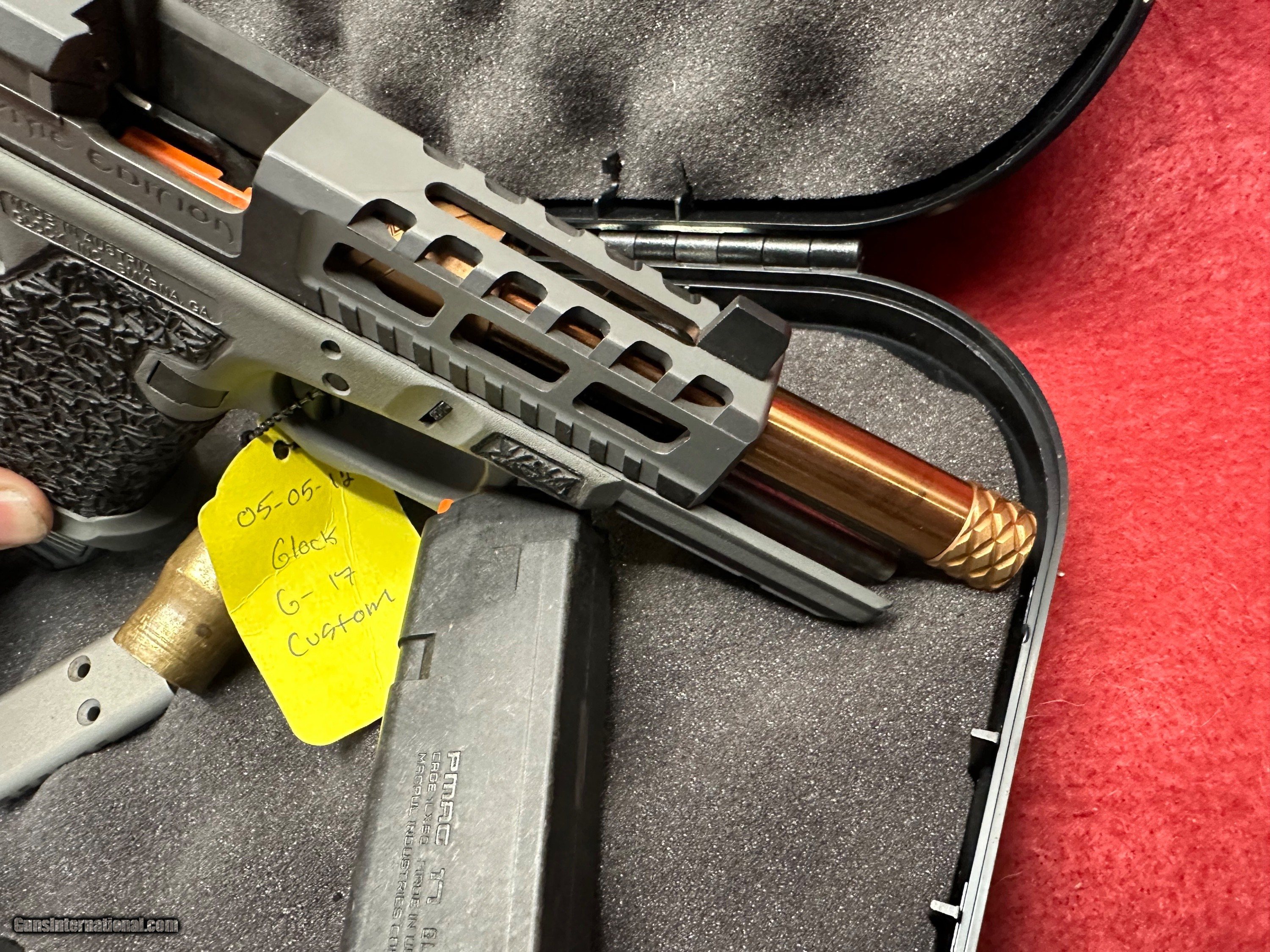 Description: This Glock was a custom build that one of my clients in the shop traded in. Everything about it was custom ordered from the cerakote finish to the truly unique stippling pattern. Weighing in at only 1.5oz with the magazine. This pistol comes with two P-Mag magazines with custom extensions that physically hold 22 rounds in each (make sure your state allows hi-cap mags). The slide is heavily ported on the sides and the top allowing the Titanium Nitrate coated barrel to peek through. The barrel is threaded for a comp or a silencer and the front sight is elevated for the same purpose. The rear sight looks to be factory height and may need to be replaced if you are not running optics on your pistol. Well over 2K invested in the customization. Comes with a No2 optic plate coated to match the pistol design and a optic plate blank cover Flat 25.00 shipping fee No Credit Card Fees SOLD Handgun Caliber: 9x19mm Parabellum (9mm Luger, 9x19mm NATO) Manufacturer: Glock Model: 17 Serial Number: BHGU673 Barrel Length: 5 Condition: Very Good Extras: Original Case, 2 mags, Optic Plate, Optic Plate Cover Item Location: Buxton Maine |