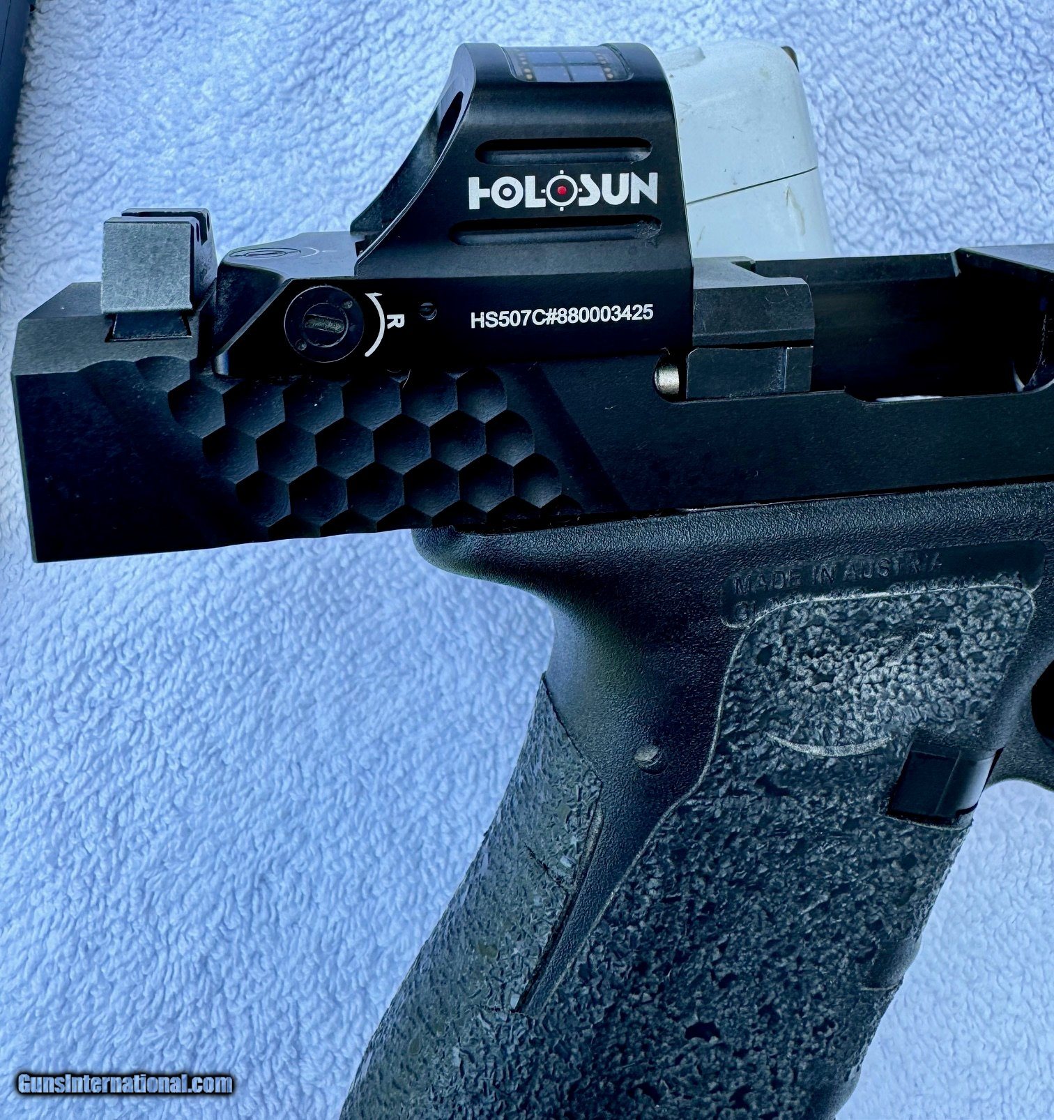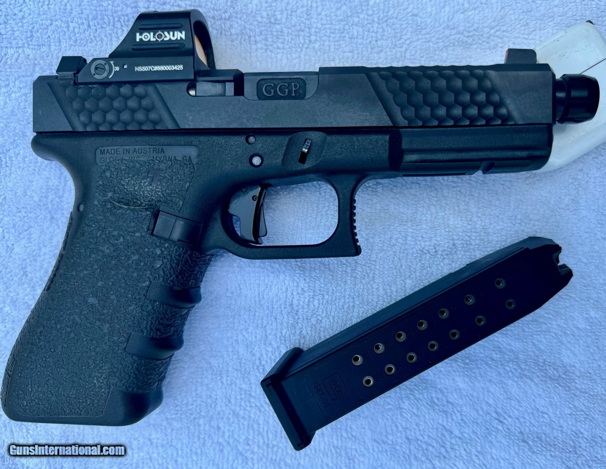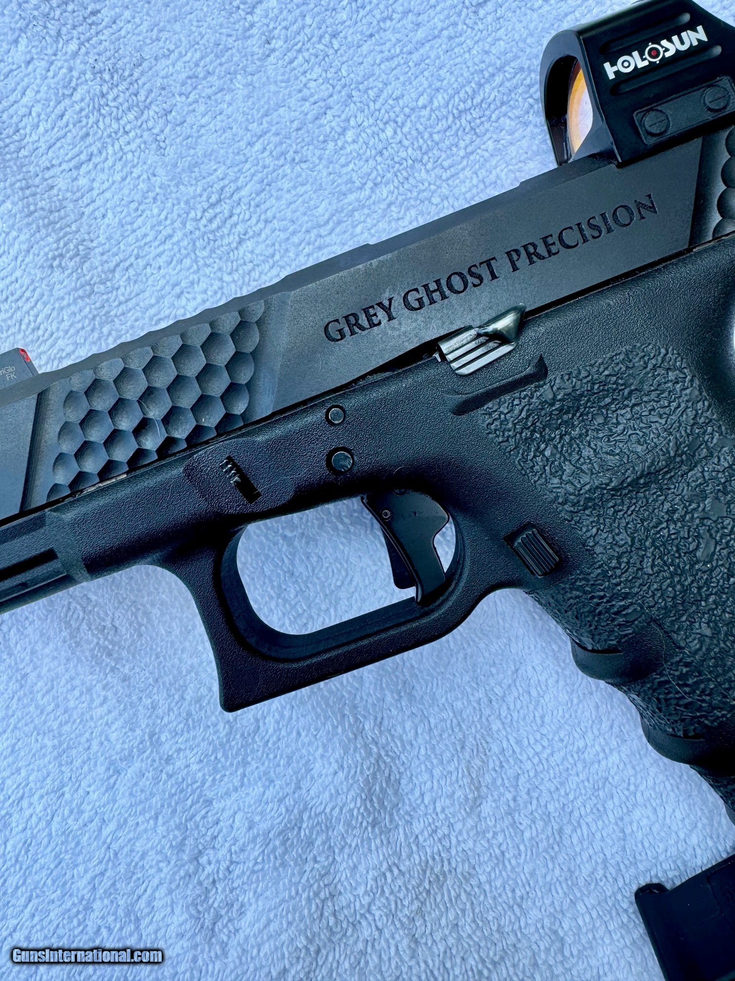 Description: Guns Listing ID: 1368255 Glock Model 17 with loads of upgrades! Grey Ghost Precision front & rear scalloped serration slide with optics cut-out (retails $400+), Grey Ghost Precision 5-inch threaded barrel (retails $180+), upgraded tactical trigger, Holosun HS507 tactical red-dot optic (retails $350+), Ameriglo 2-dot rear night sights with orange dot front night sight (retails $75+ installed), tactical rail, extended slide release and textured grip tape. Comes with one (1) 17-round Glock magazine. SOLD Manufacturer: GLOCK Model: 17 Caliber Info: 9MM LUGER (9X19 PARA) Condition: Used - Non-Certified Barrels: 5 BARREL Finish: BLACK |