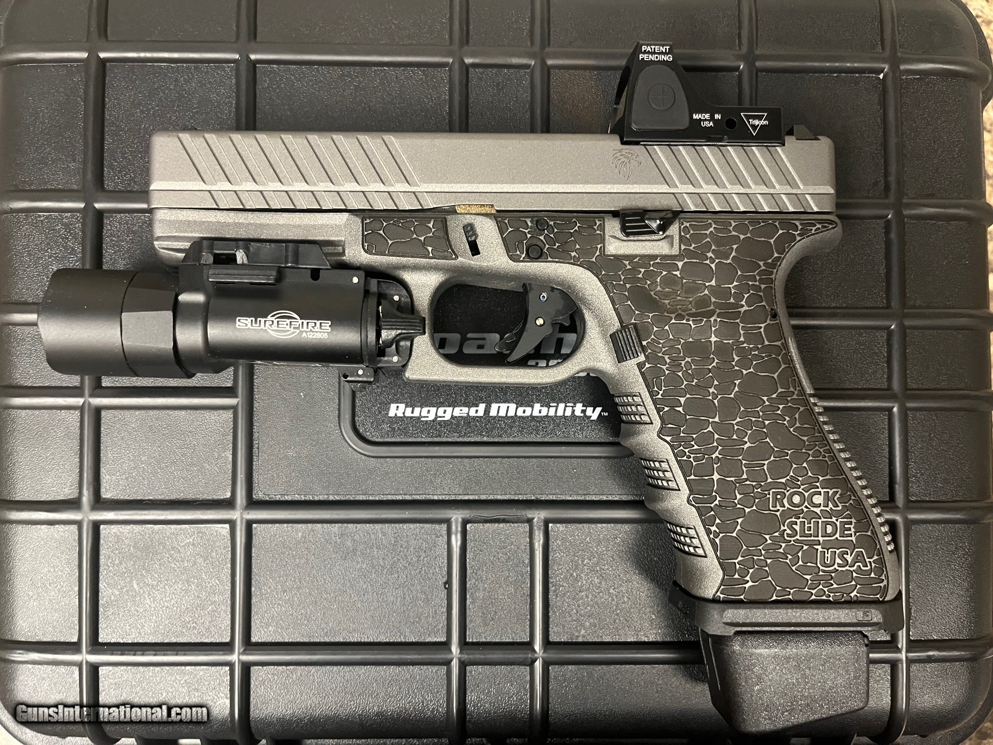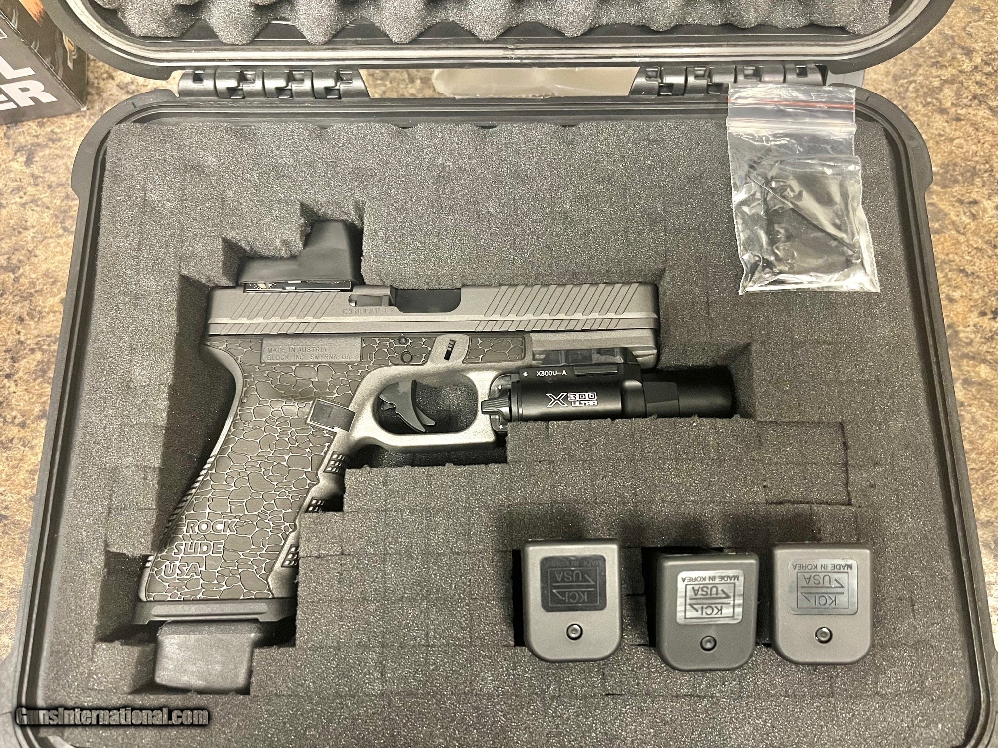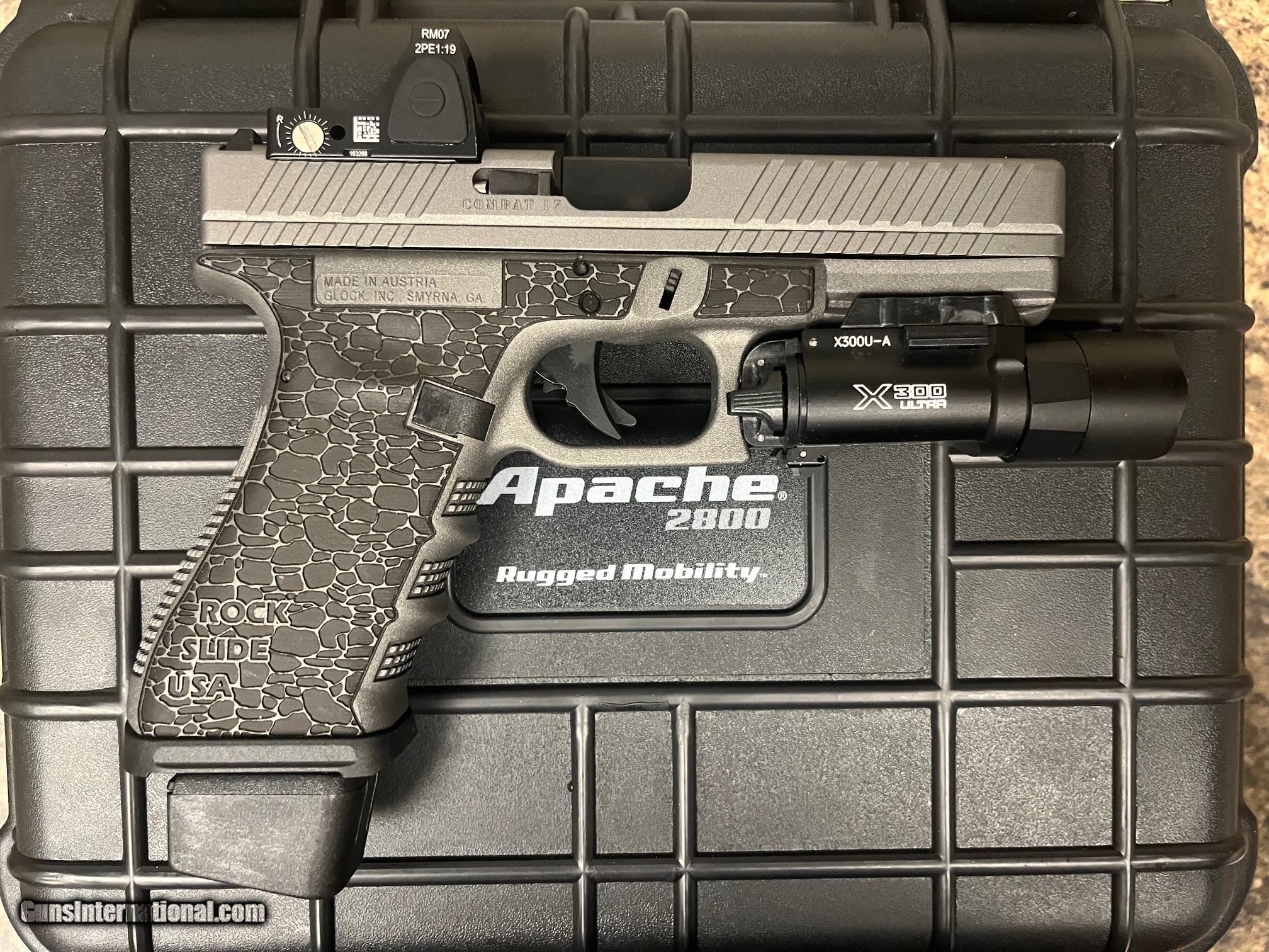 Description: Guns Listing ID: 1226348 Glock 17 Gen3 Custom 9mm pistol, (3)17rd KCI mags, (1)19Rd mag, Trijicon RM07 optic, Rock Slide USA Custom stippled frame, Combat 17 Slide, Strike Industries magwell and slide plate, grey cerakote, Surefire X300 Ultra light, hard case with custom pluck foam SOLD Manufacturer: GLOCK Model: 17 gen 3 Caliber Info: 9MM LUGER (9X19 PARA) Condition: Used - Non-Certified Barrels: 4 BARREL Finish: GREY CERAKOTE |