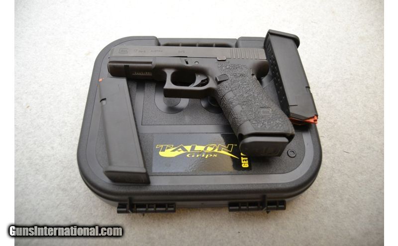 Description: Overall condition is very good. There is minor finish thinning on the top right rear corner of the slide and the hard edges of the slide releases. Frame has a small number of minor handling marks. Bore is excellent with well defined lands/grooves and healthy shine. 9mm Luger SOLD Chambers: Semi-automatic fed from detachable magazines. Metal Condition: Very good. Wood Condition: Frame is in very good condition Bore Condition: Excellent. Barrels: 4½" Blued. Triggers: Matte black polymer with integrated safety. Fore End: Single-slot rail section. Butt Pad: Talon Grips. Weight: 1.5 lbs. Sights: Standard fixed Glock with white dot front and "U" notched rear. Item Location: Green Bay |