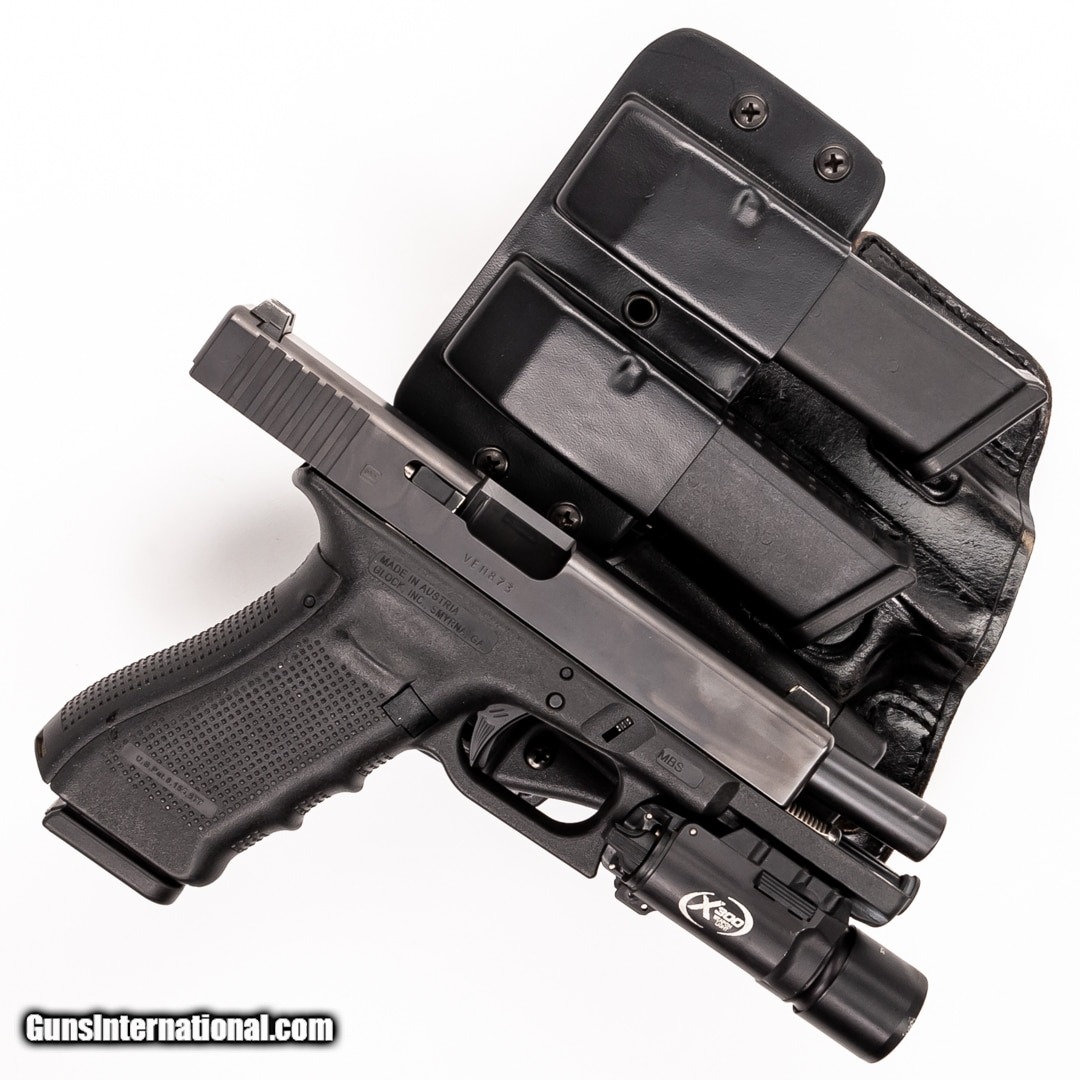 Description: Guns Listing ID: 399436 The Glock 17 series has been the standard sidearm for numerous militaries and hundreds of law enforcement agencies worldwide for decades. This is a Glock 17 Gen 4 which features textured grips with finger grooves, it also has an installed Zev Tech Fulcrum Trigger. 3-17 round magazines, a Surefire X300 light, an Aker leather holster, and a Blackhawk holster with a double mag holder are included. SOLD Manufacturer: GLOCK Model: 17 GEN4 Caliber Info: 9MM LUGER Condition: Used - Certified Barrels: 4.5 BARREL Finish: BLACK |