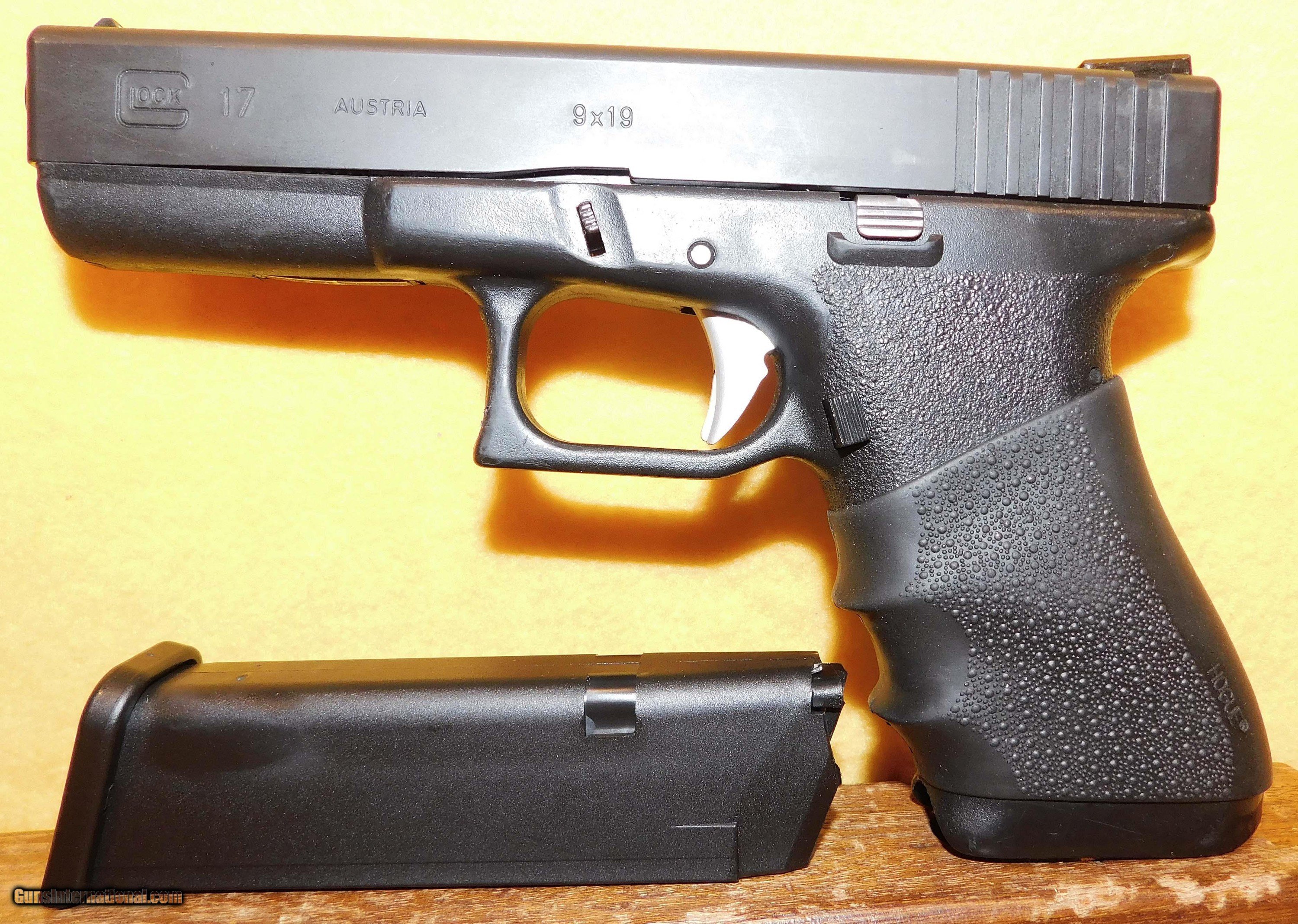 Description: GLOCK 17 IN 9MM CAL., WITH 4 .25" BARREL. COLOR MATTE. CONDITION 95%. SERIAL NUMBER FG391US. GLOCK MODEL 17 IN 9MM CALIBER, BRIGHT SHINY BORE, GRIPS EXCELLENT, COMES WITH HARD CASE, ONE TEN ROUND FACTORY MAGAZINES, MASS OK., NEW IN BOX OVERALL CONDITION, OUR STOCK # D2822 SOLD |