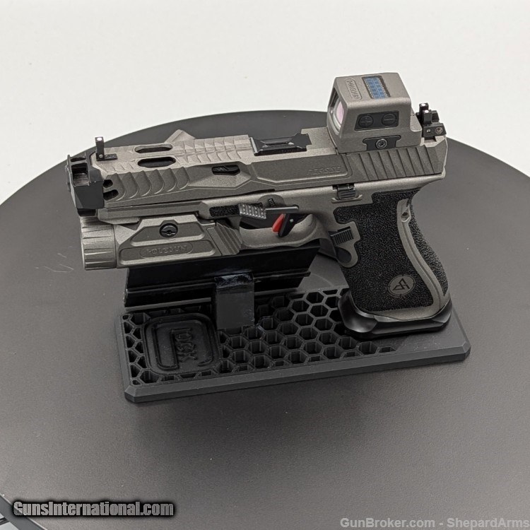 Description: Guns Listing ID: 474061 Shepard Arms Custom Glock 17 This one-of-a-kind custom Glock 17 has been meticulously crafted by the team at Shepard Arms to deliver unmatched performance, reliability, and modern style. Designed for those who demand excellence, this tactical masterpiece combines premium components with advanced customization to ensure top-tier functionality. Key Features: Killer Innovations Magazine Extension: Increases capacity with a refined, tactical aesthetic. Radian Ramjet Barrel with Compensator: Reduces recoil for faster follow-up shots and unparalleled precision. Holosun 509T ACSS Optic: Provides a crisp, high-contrast aiming solution for rapid target acquisition in any environment. Timney Trigger: Offers a clean, responsive break for superior accuracy. Holosun PID Weapon Light: Combines powerful illumination with a compact design for low-light tactical scenarios. Norsso Slide: Precision-machined to improve reliability and enhance the firearm‚‚s overall design. NineX19 Magwell: Optimized for faster reloads under pressure, ensuring flawless operation. KNS/Dead Air Sights: Co-witness ready, allowing versatile sighting options. Align Tactical Thumb Rest: Improves grip stability and control during operation. Custom Cerakote Finish & Stippling: Features a rugged two-tone finish with ergonomic stippling for a secure, comfortable grip. Why Choose Shepard Arms? This custom Glock 17 is a showcase of premium craftsmanship and tactical innovation, engineered to excel in any scenario. Whether you‚‚re on the range or in the field, every component is hand-selected to ensure peak performance. White Glove: Each firearm is rigorously tested for reliability and functionality before leaving our sho SOLD Manufacturer: GLOCK Model: Custom G17 Gen5 Caliber Info: 9MM LUGER (9x19 PARA) Condition: Used - Non-Certified Barrels: 4.5 Finish: cerakote |
