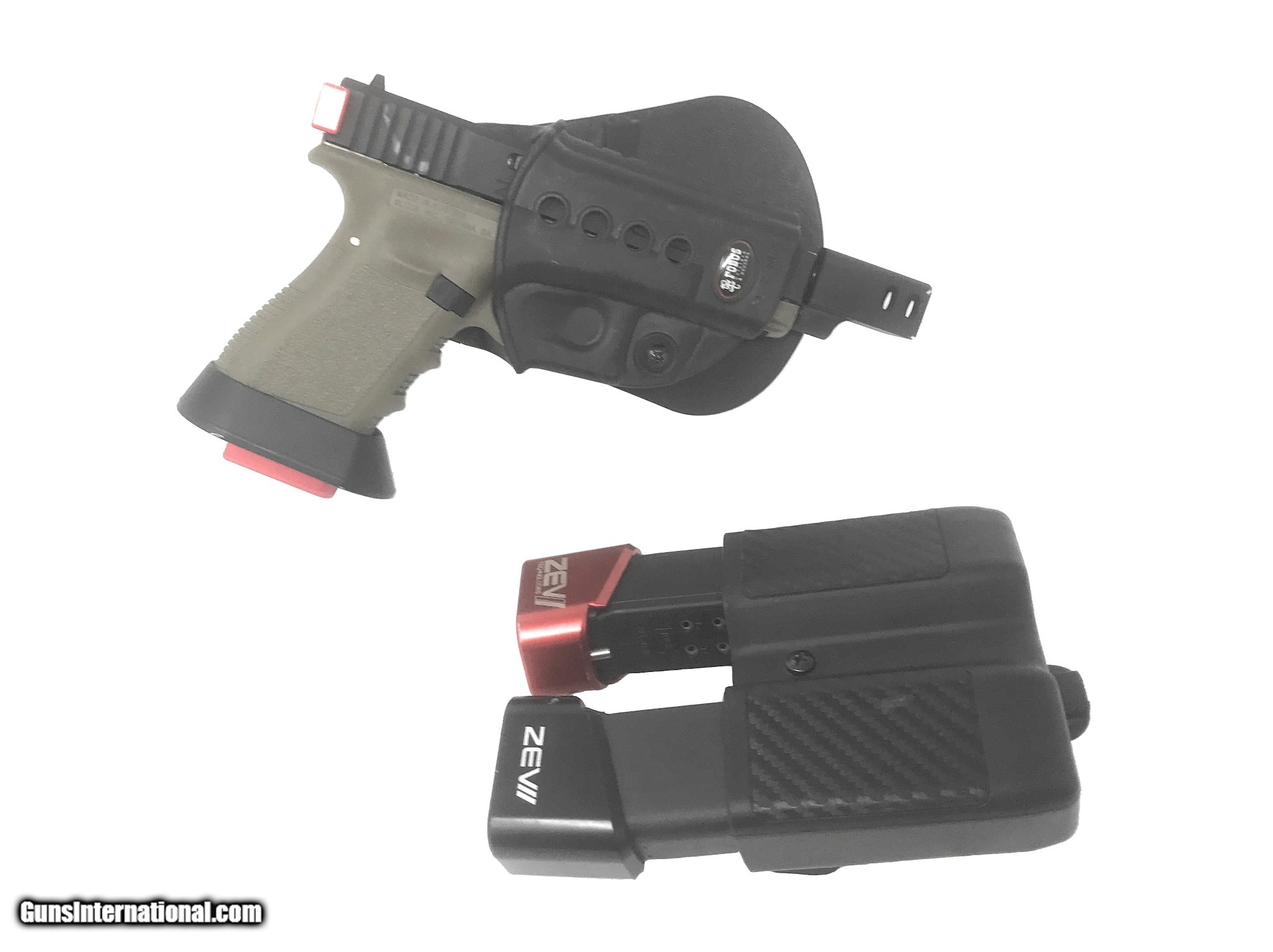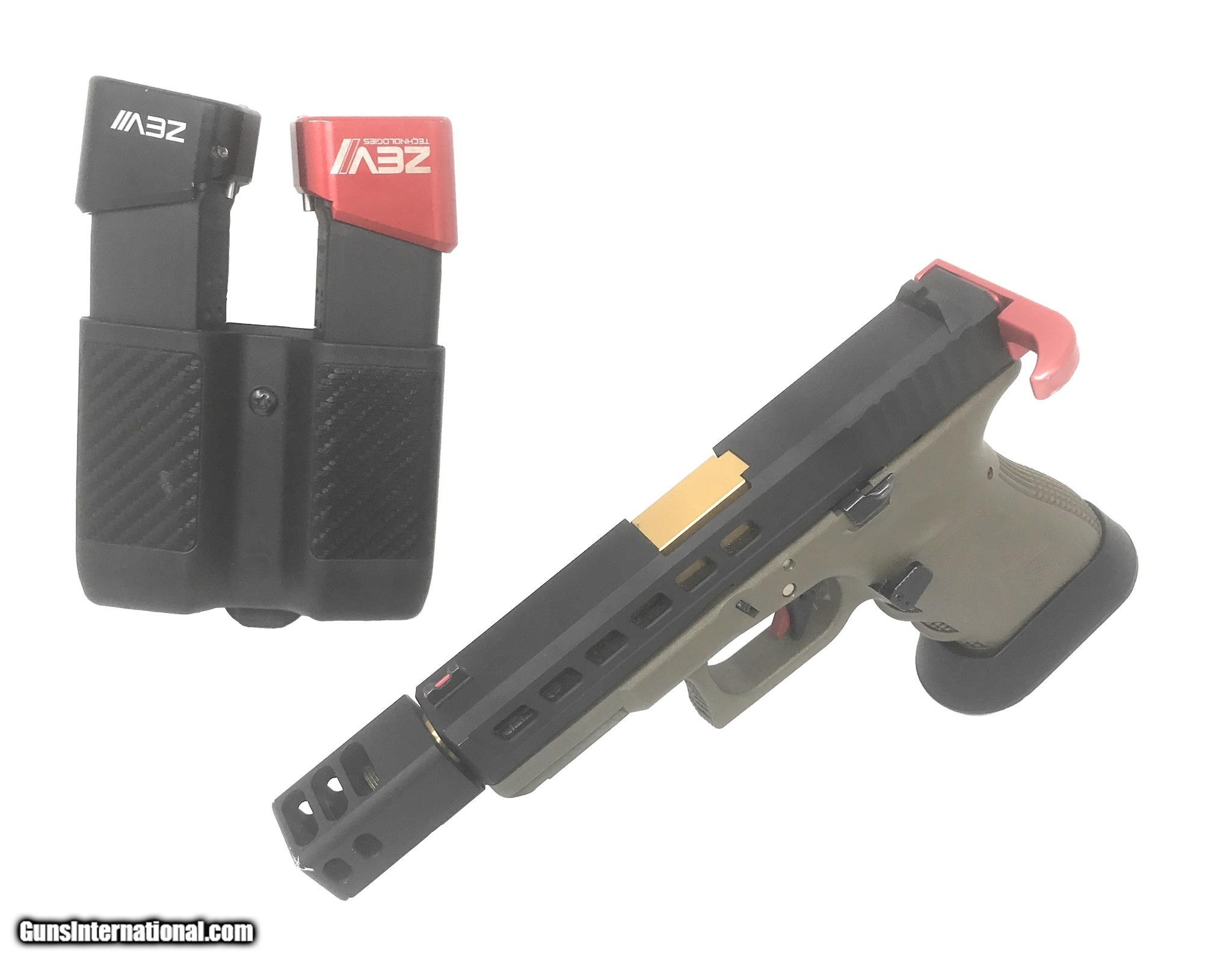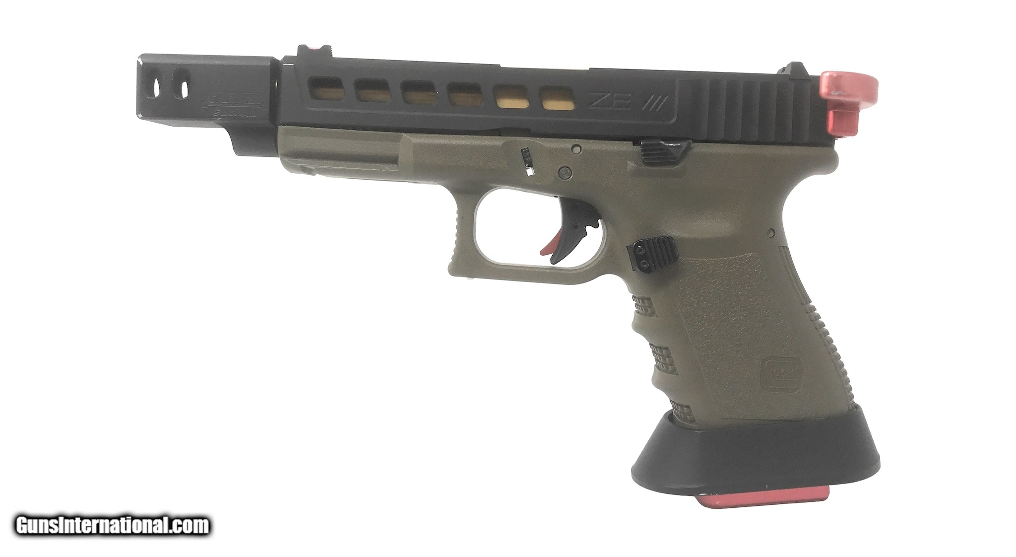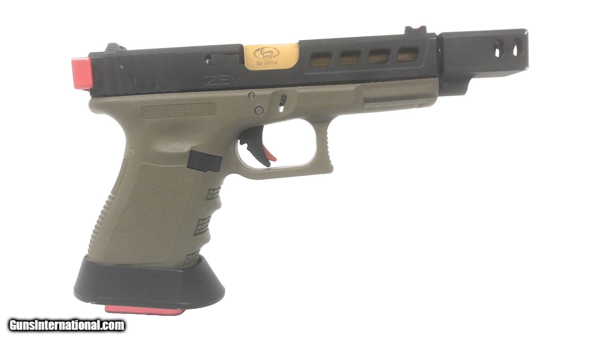Description: Guns Listing ID: 788225 Manufacturer: Glock Model: 17 Custom Type: Semi Automatic Pistol Caliber: 9mm Serial No.: XMB157 Capacity: Two 15 Rounds & One 10 Round Magazines Barrel Length: 4.75\" Front Sight: Red Fiber Optic Sight Rear Sight: fixed U Shape white Sight Action: Safe Action Grip: Green Polymer Slide Finish: Matte Black Frame Finish: Green Polymer SKU: 21080011 Features: Note: Some Modification Are Made To this Gun (Competition Style) Barrel and Compensator Combo (Carver Custom) Slide (ZEV Technologies) Slide Pull Handle (Long Horn style) Triger (No Info Available) Magwell Black (No Info Available) Magazine Basepad Red (No Info Available) Looks Like Most Of Parts Are From Carver Custom Kits (Not Confirmed) Included Total of 3 Magazines, 2 ZEV Technologies Bases And One More Unknown SOLD Manufacturer: GLOCK Model: G17 Caliber Info: 9MM LUGER (9X19 PARA) Condition: Used - Non-Certified Barrels: 4.75 BARREL Finish: TWO-TONE |
