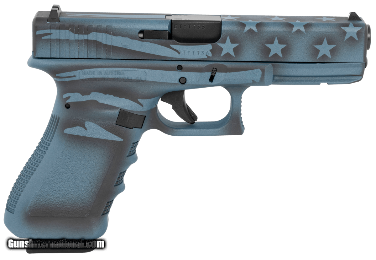 Description: Guns Listing ID: 472065 The Glock G17 pistol is safe, easy, and quick - precisely what you need in critical situations. It features Glock‚‚s Safe Action system which provides a consistent trigger pull from the first to the last round. The three automatic independently operating mechanical safeties are built into the fire control system of the pistol. All three safeties disengage sequentially as the trigger is pulled and automatically reengage when the trigger is released. The frame is made of polymer with hardened steel guides. It features an ideal grip angle and low weight. The slide stop lever and the magazine catch are easily operated with the shooting hand. The advanced surface treatment of the slide results in optimal hardness by considerably reducing wear and tear and it makes it corrosion resistant, even when operating in saltwater conditions. The matte surface minimizes light reflection. The barrel is mechanically locked and cold-hammer forged. It also has the same advanced surface treatment as the slide. Its extractor serves as a loaded chamber indicator to comply with the laws of certain states and its position may visually and physically indicate whether there is a cartridge in the chamber of the pistol. This Gen3 model has fixed sights, a 5.5-lb. trigger pull, and includes two 17-round magazines. It is USA-made SOLD Manufacturer: GLOCK Model: G17 Gen 3 Caliber Info: 9MM LUGER (9X19 PARA) Condition: new Barrels: 4.49" barrel Finish: BLUE TITANIUM FLAG |