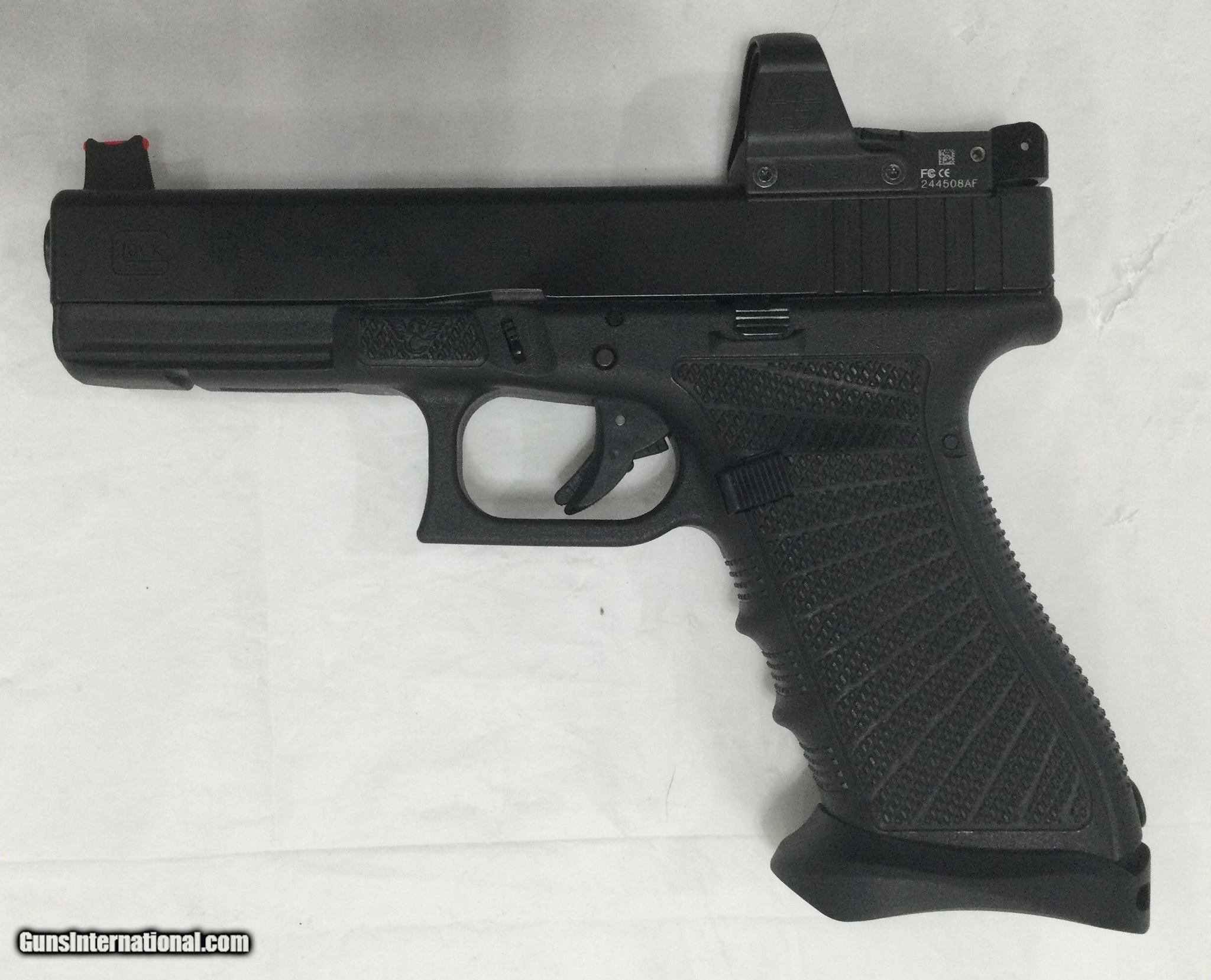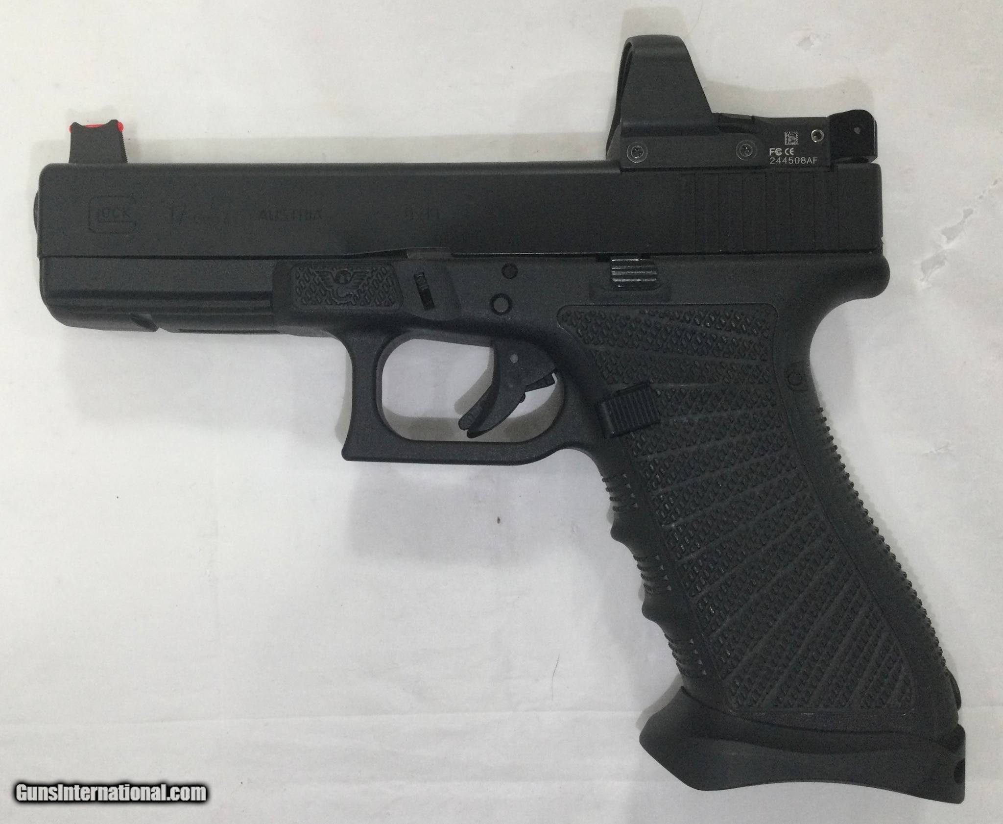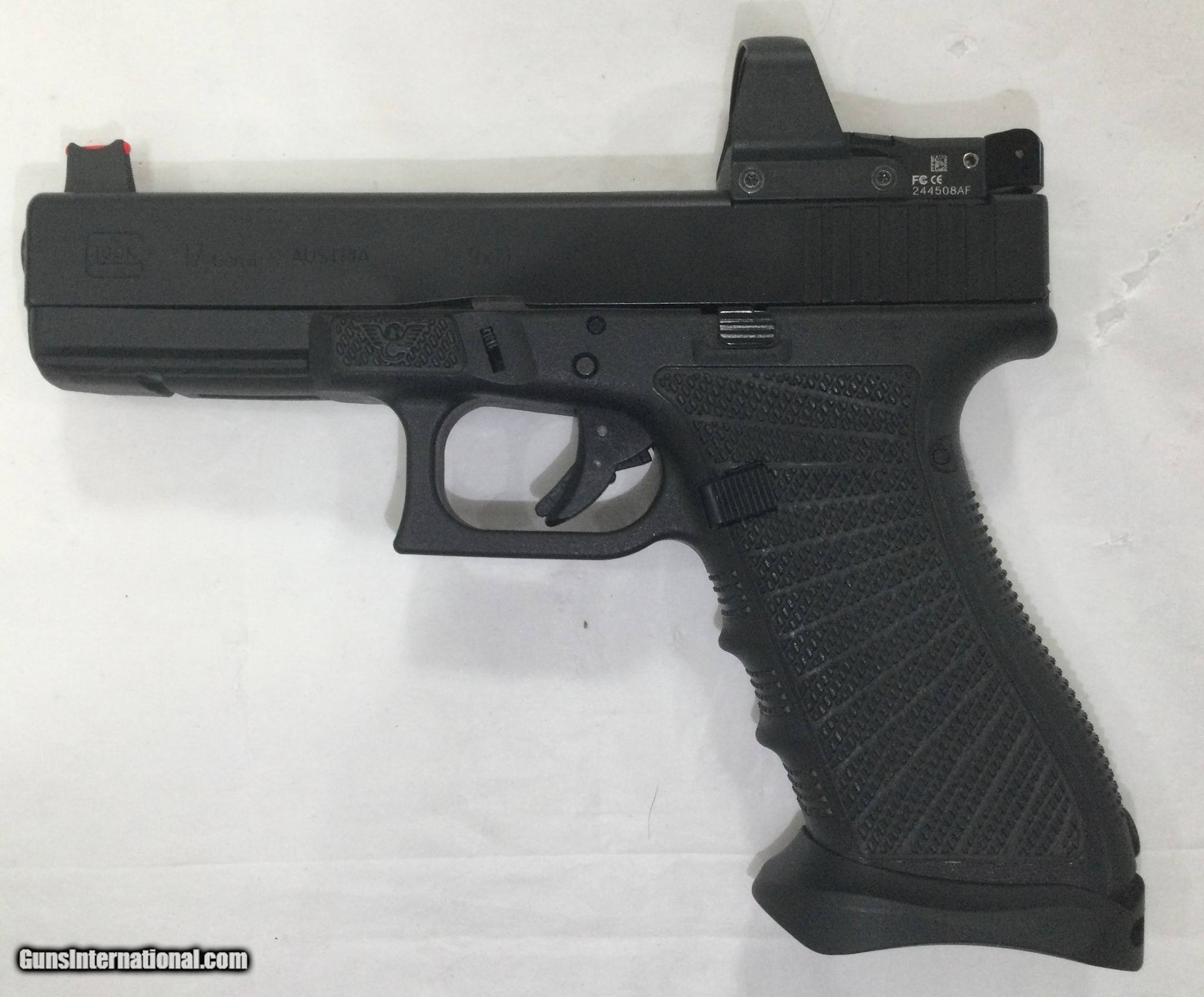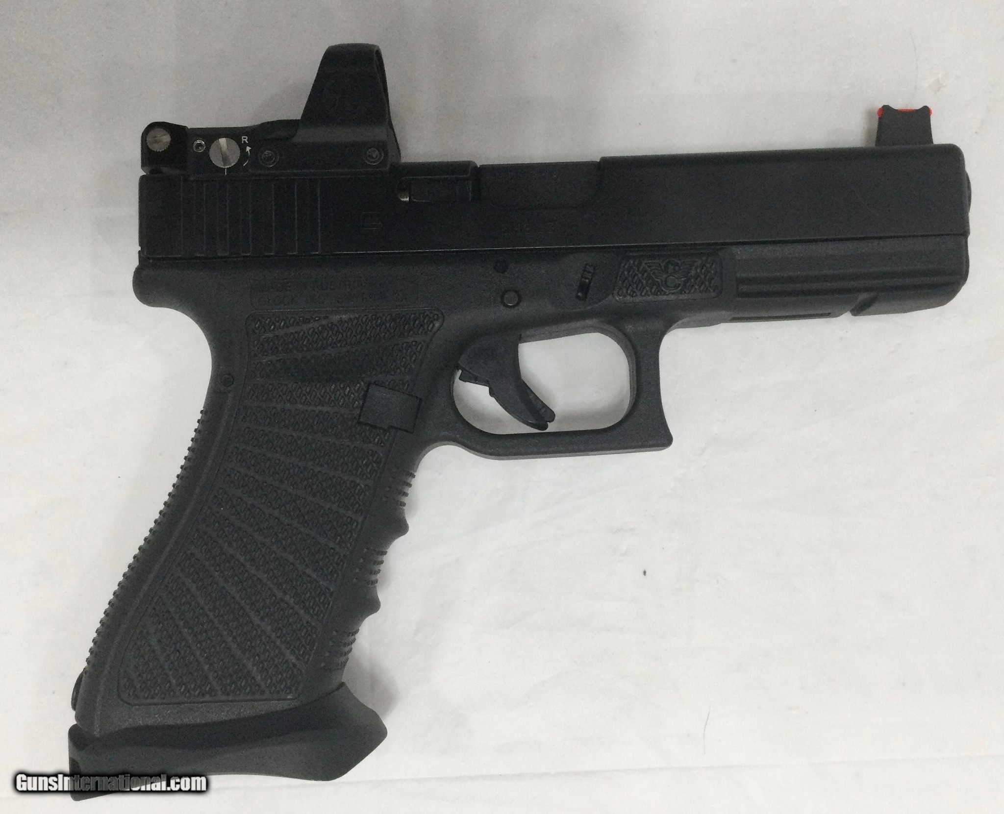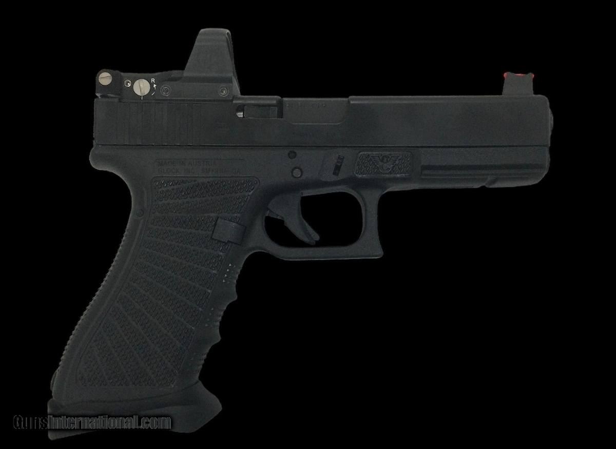 Description: Guns Listing ID: 864614 USED: CUSTOM WILSON COMBAT ARMOR-TUFF STARBURST SLIDES WITH LEUPOLD DELTA POINT PRO RED DOT ATTACHED. PROFESSIONALLY ACTION TUNED. Caliber: 9MM System: Safe Action Magazine Capacity: 17 Barrel Length: 114mm / 4.49 in Weight (without magazine or additional installments): 22.05oz Trigger Pull: 28N Additional Features: Leupold DeltaPoint Pro DeltaPoint Rear Sight Tall Snag Free Front Sight, Red Fiber Optic Stippled sides of frame (starburst Pattern) Stippled thumb pad with Logo (both sides) Has been action tuned and cut for carry optic SOLD Manufacturer: GLOCK Model: G17 GEN 4 Caliber Info: 9MM LUGER (9X19 PARA) Condition: Used - Non-Certified Barrels: 4.5 BARREL |