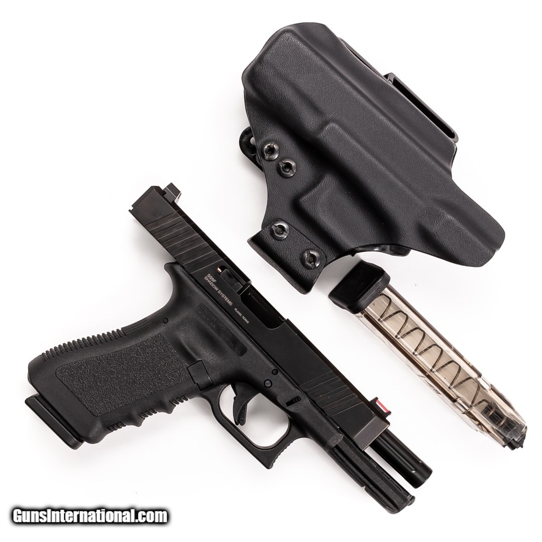 Description: Guns Listing ID: 257936 A favorite among military, law enforcement personnel, and competitors, and equally popular as a personal defense weapon, the Glock G17 Gen 3 is a semi-auto handgun chambered in 9mm. This polymer-framed pistol is robust, reliable, and performs even in the most demanding situations. Textured grips, finger grooves, and lined front and backstraps ensure a steady grasp, while the integral rail makes for the easy addition of accessories and tool-free takedown makes for easy maintenance. This Glock 17 has a Shadow Systems slide, fluted barrel, and a fiber optic front sight. It is in very good condition and comes with a Glock case, one 17-round Glock magazine, one 17-round ETS magazine, and a Neoterici Kydex holster. SOLD Manufacturer: GLOCK Model: G17 Caliber Info: 9MM LUGER (9X19 PARA) Condition: Used - Certified Barrels: 4.5 BARREL Finish: BLACK |