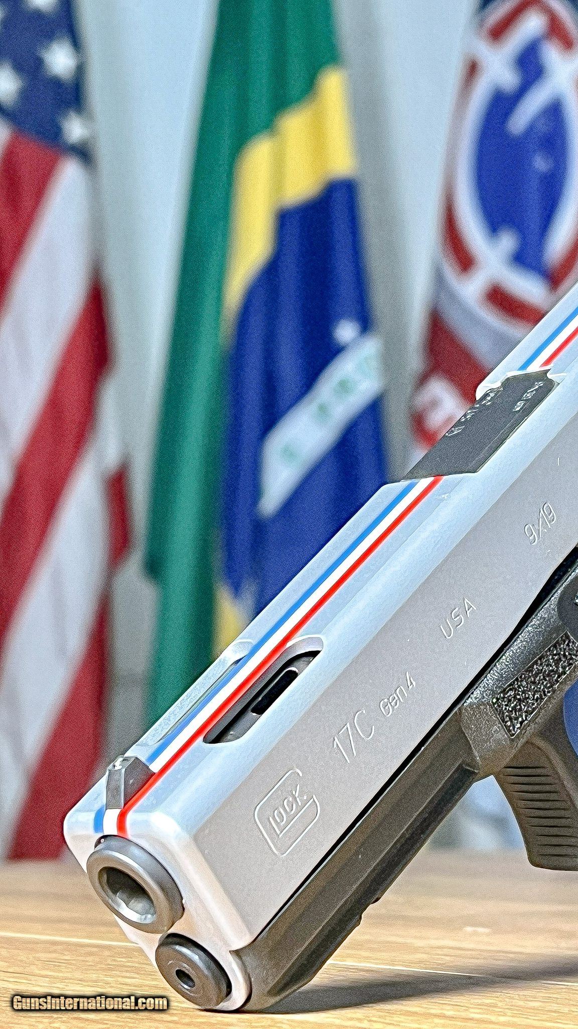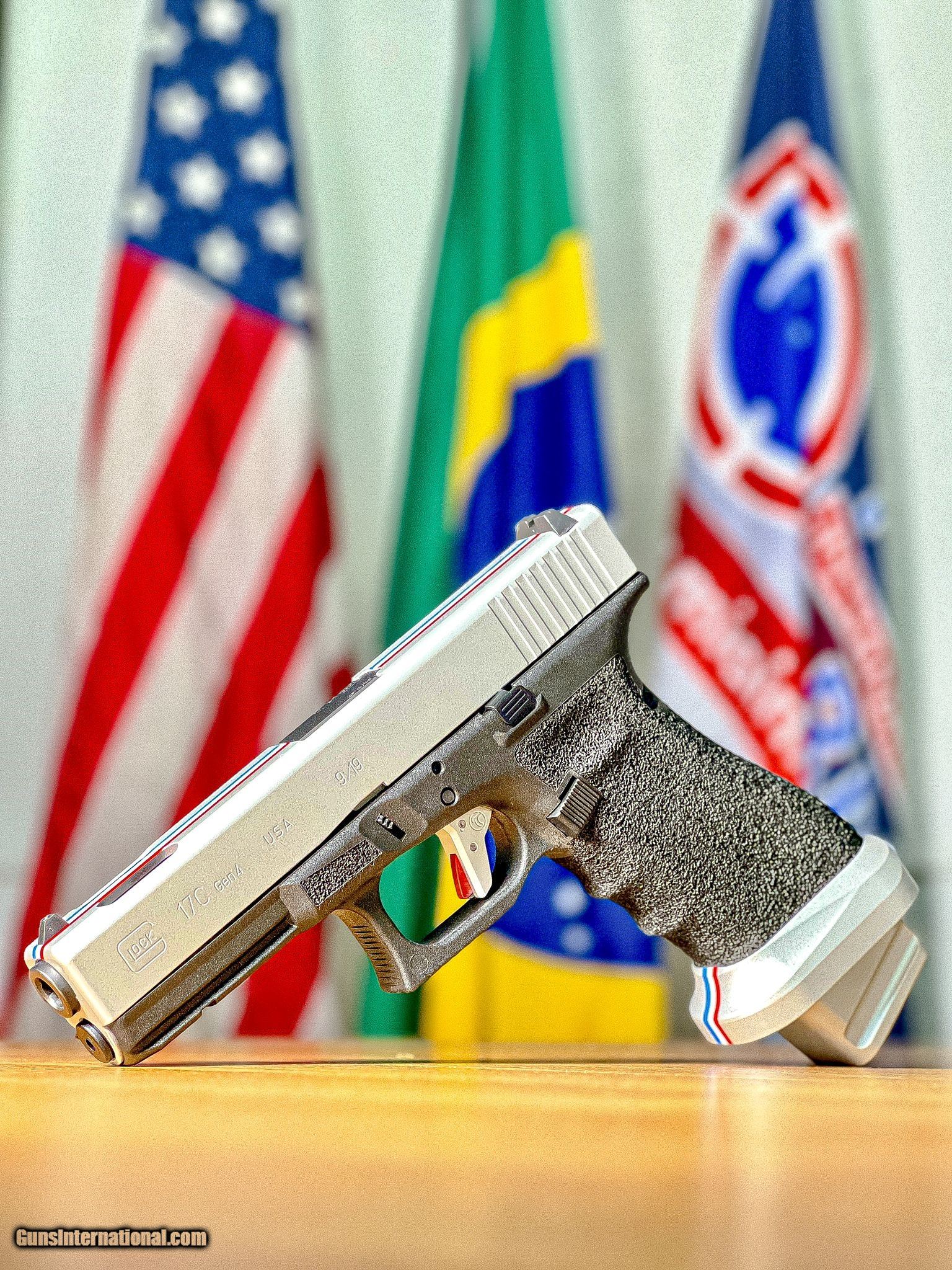 Description: Guns Listing ID: 940494 Brand NEW Pistol - This is a Custom One-of-a-Kind gun built on the super rare Glock G17C MFG MDL #: UG1759201 UPC: 764503914362 Glock, G17C Gen4, Semi-Auto, 9mm, 4.49\" Barrel, 2 Magazines of 17 Rounds - Customized by A Really Bad Design: * Cerakote Slide Silver with Red / White / Blue Stripes down the middle and between the Glock Ported Slide and Barrel * Timney Alpha Trigger Work with approx 3lbs trigger pull * Taran Tactical MagWell with custom color, to match the gun and follow the RWB stripes * 2 Warner +4 Base Pad, Giving you a capacity of 21 Rounds * Full wrap Handmade Stippling for better grip Our sister company, A REALLY BAD DESIGN, is available to do this complete or partial work on your Glock if you wish! Contact us for more information and pricing. SOLD Manufacturer: GLOCK Model: G17C Ported Custom Glock Gucci Caliber Info: 9MM LUGER (9X19 PARA) Condition: Used - Non-Certified Barrels: 4.49 BARREL Finish: OTHER |