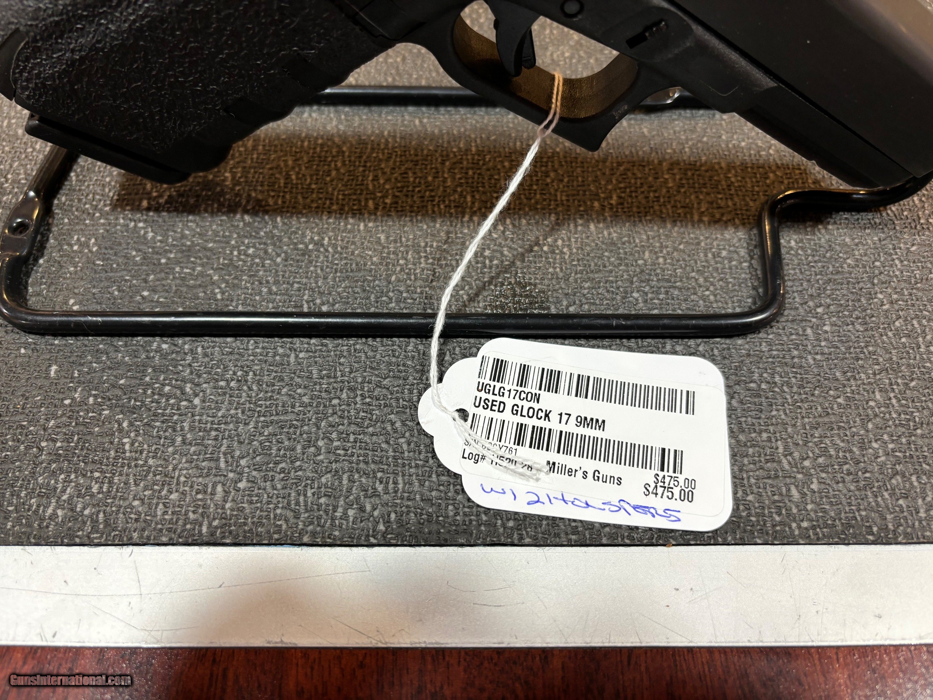 Description: USED Glock 17 Gen 4 9mm 17 round capacity (1) magazine included No box/manual (2) holsters included SOLD Handgun Caliber: 9x19mm Parabellum (9mm Luger, 9x19mm NATO) Manufacturer: Glock Model: 17 Serial Number: BBCY761 Condition: Good/Fair |