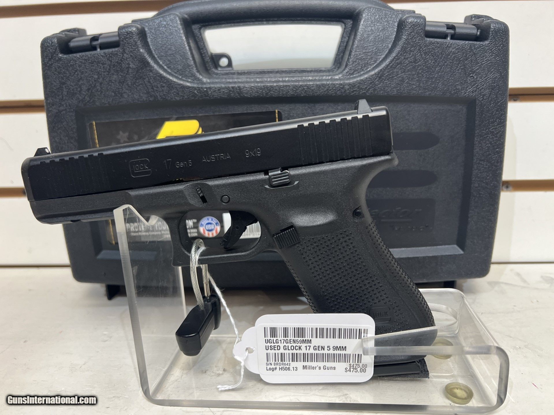 Description: Used Glock 17 in Box in very good condition caliber 9 MM magazines 2 17 round capacity Back straps 2 The new frame design of the GLOCK 17 Gen5 removed the finger grooves for more versatility but still allows to easily customize its grip by using the different back straps. A flared mag-well and a cutout at the front of the frame give the user more speed during reloading when fractions of a second matter. A reversible enlarged magazine catch, changeable at user level as well as the ambidextrous slide stop lever accommodate left and right-handed operators. The rifling and the crown of the barrel were slightly modified for increased precision. Buyer pays shipping Millers Gun Center Located in New Castle, Delaware "Home of TAX-Free shopping" No Credit Card Fees Send Gun international inquiry and then call 302-328-9747 to complete your purchase SOLD Handgun Caliber: 9x19mm Parabellum (9mm Luger, 9x19mm NATO) Manufacturer: Glock Model: 17 Serial Number: BRDR642 Condition: Very Good |