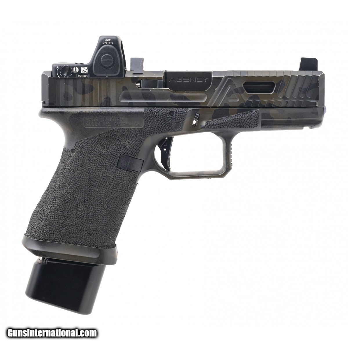 Description: " SN:BFMC367. Modern production 9mm with a 4.01 Agency barrel, with DLC. Bore is excellent. Compact pistol with polymer frame. Agency Slide with camo finish. Grips are excellent with custom stippling. Slide is ported and mounted with Trijicon RM08 red dot sight. Overall condition is excellent. Comes in agency range bag and two extra magazine. SOLD |