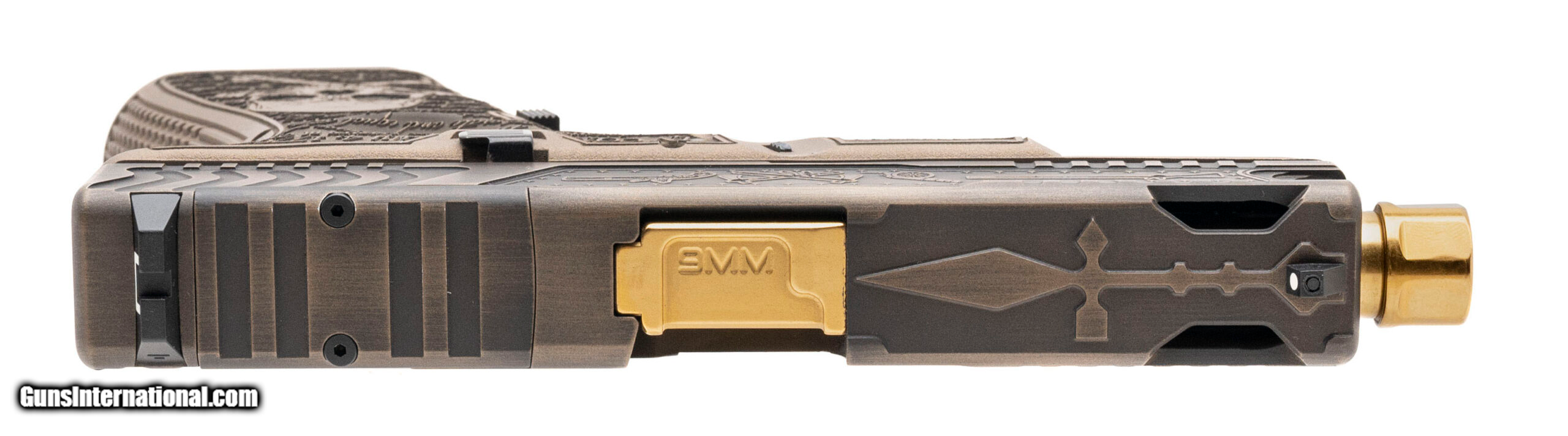 Description: "SN: BYLZ788. Modern production, 9mm with a 4.02"" gold threaded barrel. Bore is bright with strong rifling. Compact striker fired pistol with custom engravings and optic ready slide. Brown finish and polymer frame are in excellent condition. Overall condition is excellent. Comes with case, original barrel, and extra magazine. SOLD |